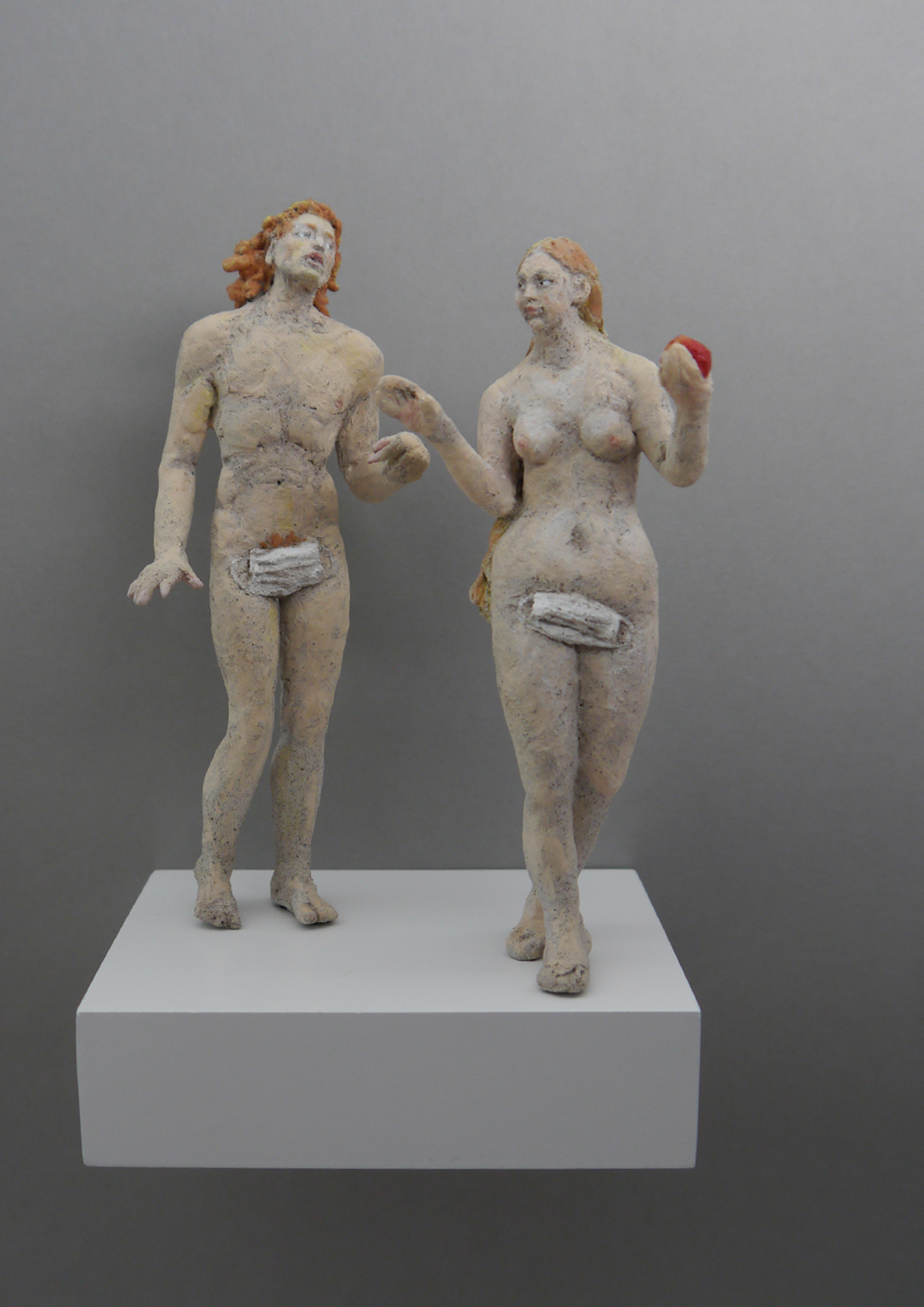Adam and Eve (inspired by Dürer), 2021 Adam: 13.5 x 5 x 4 cm/ Eve: 13 x 5.5 x 5 cm, wall base 10.5 x 7.8 cm Stoneware, engobe wire