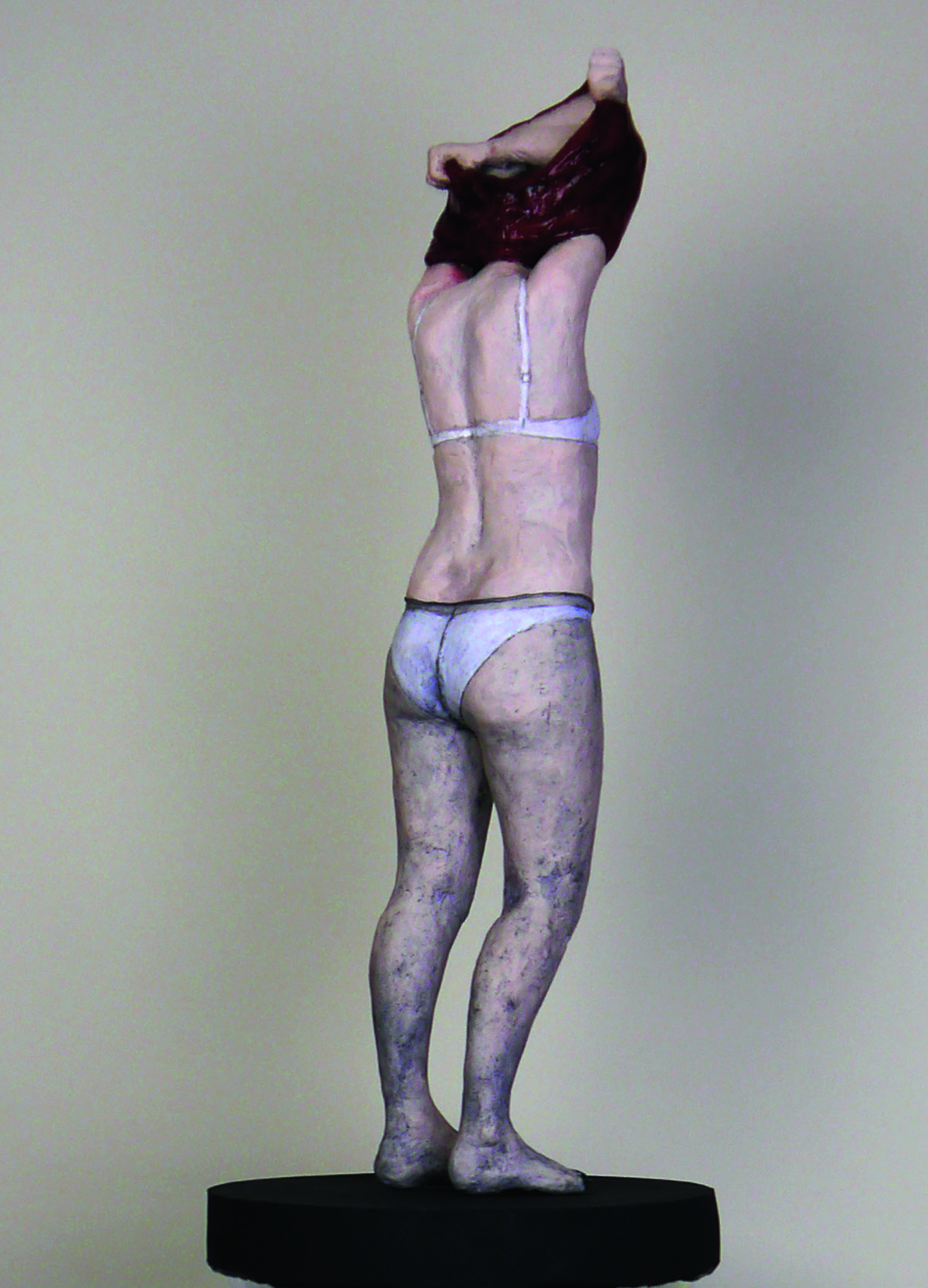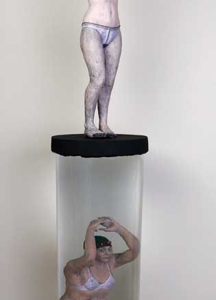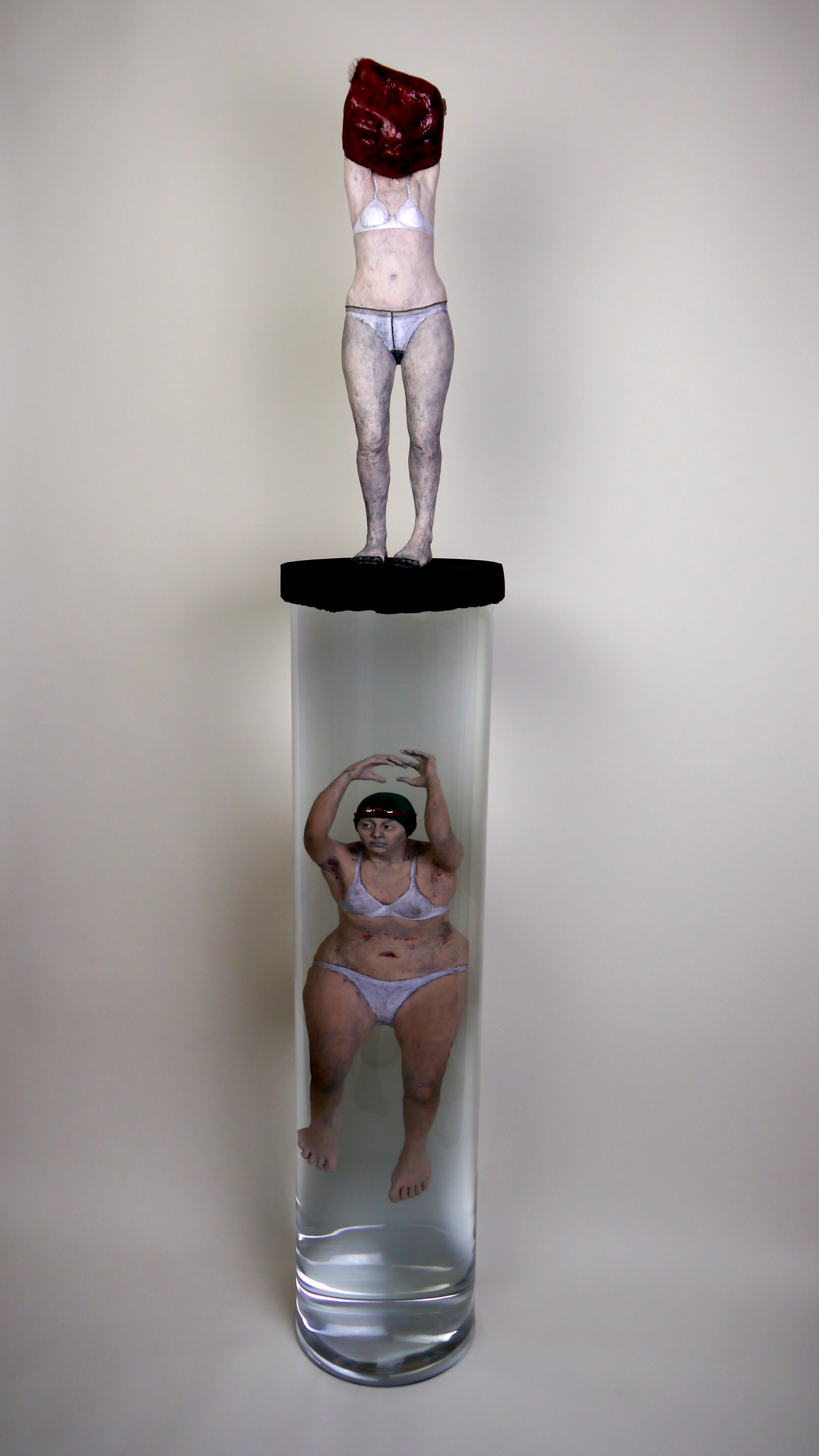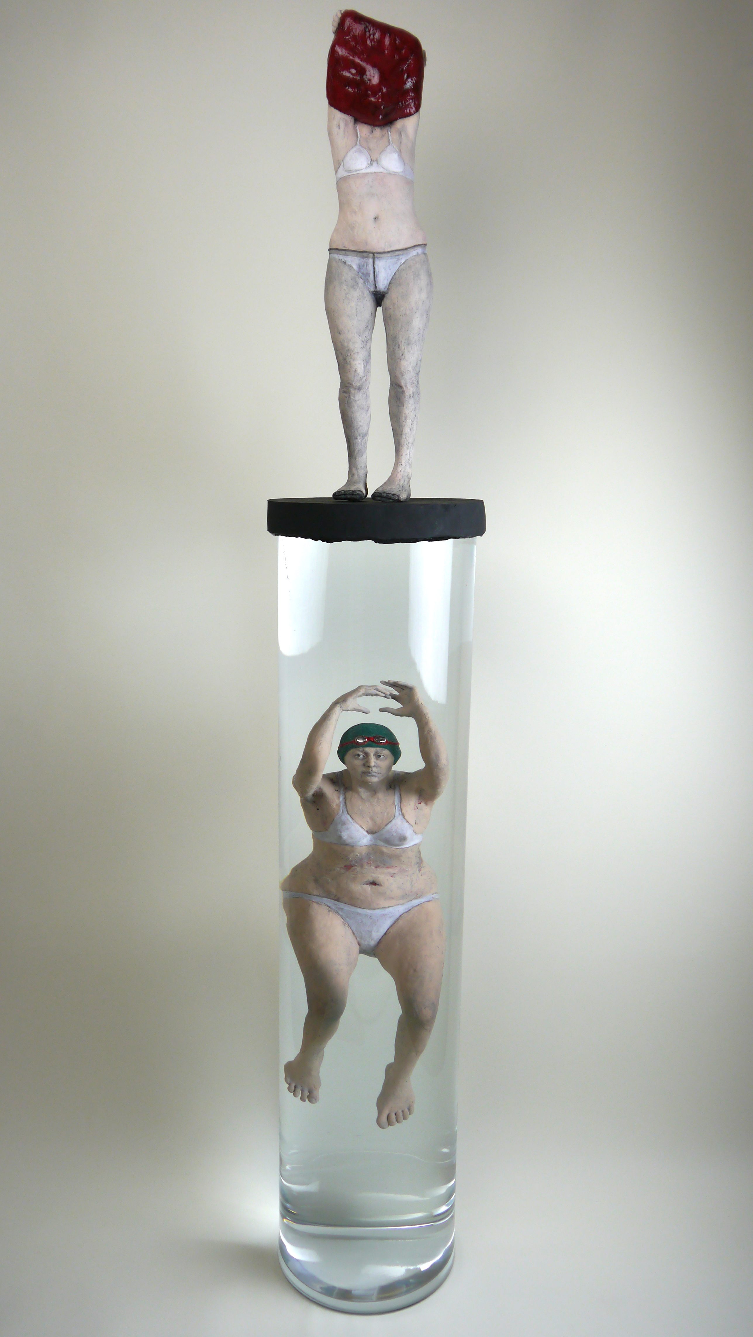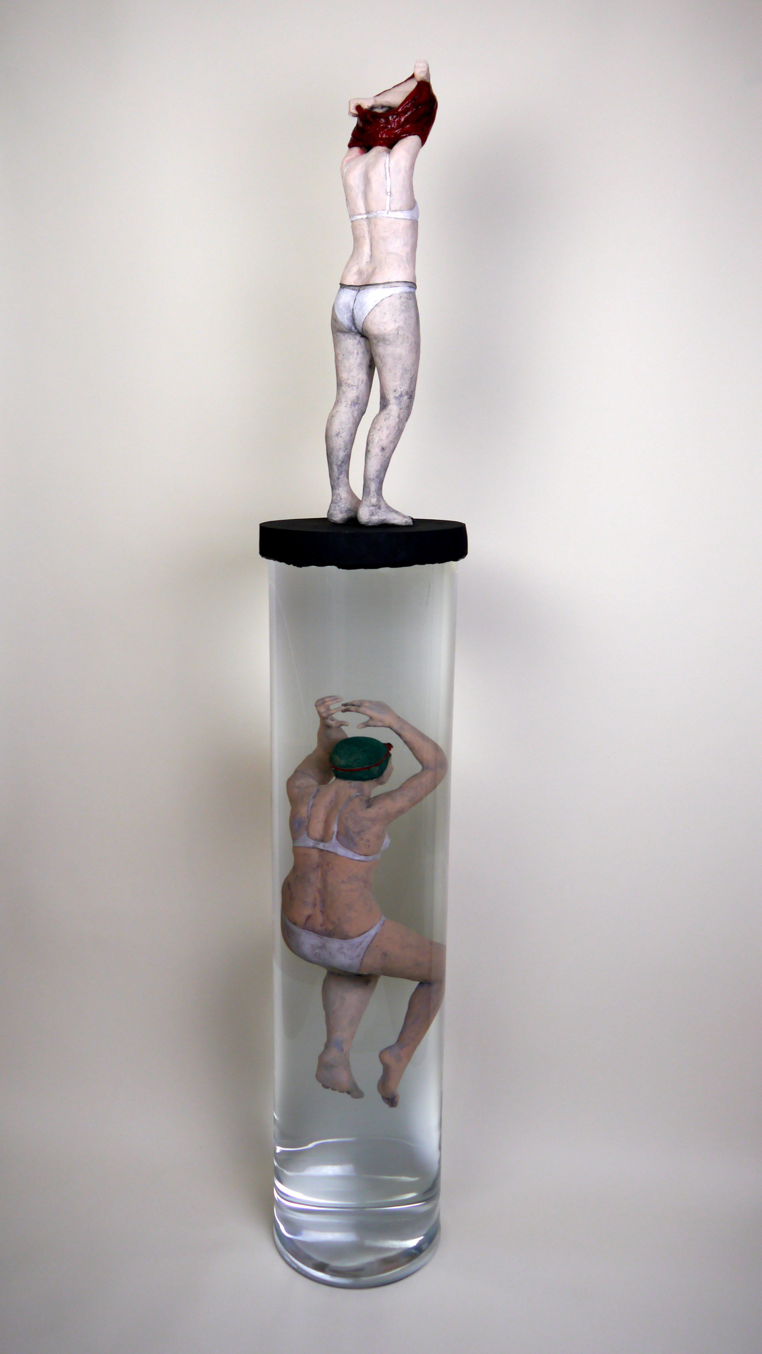 Test tube, 2016 165 x 27 x 27 cm Stoneware, engobe, pigments, oxides, glaze, platinum luster, glass vase, water, metal round, fishing line