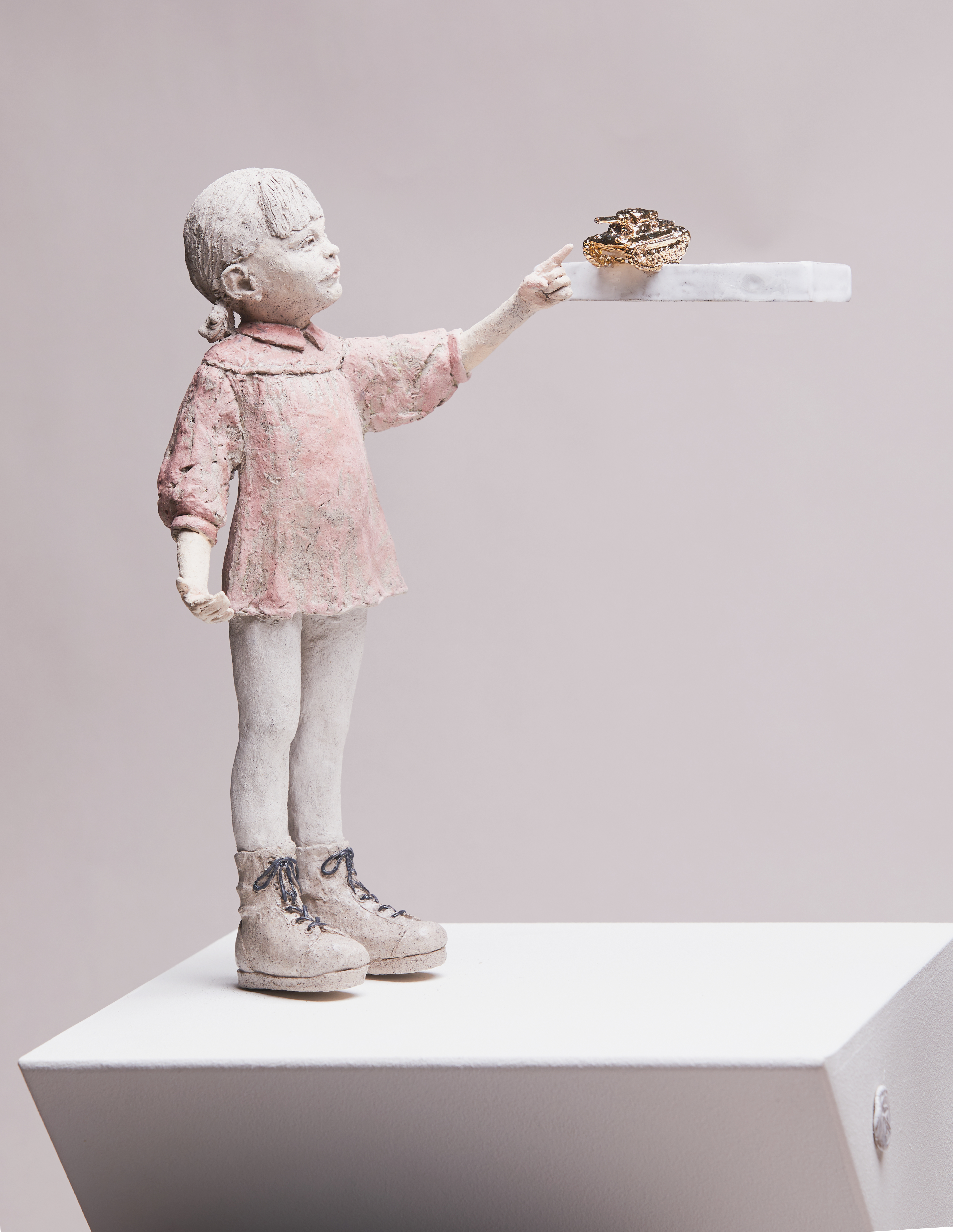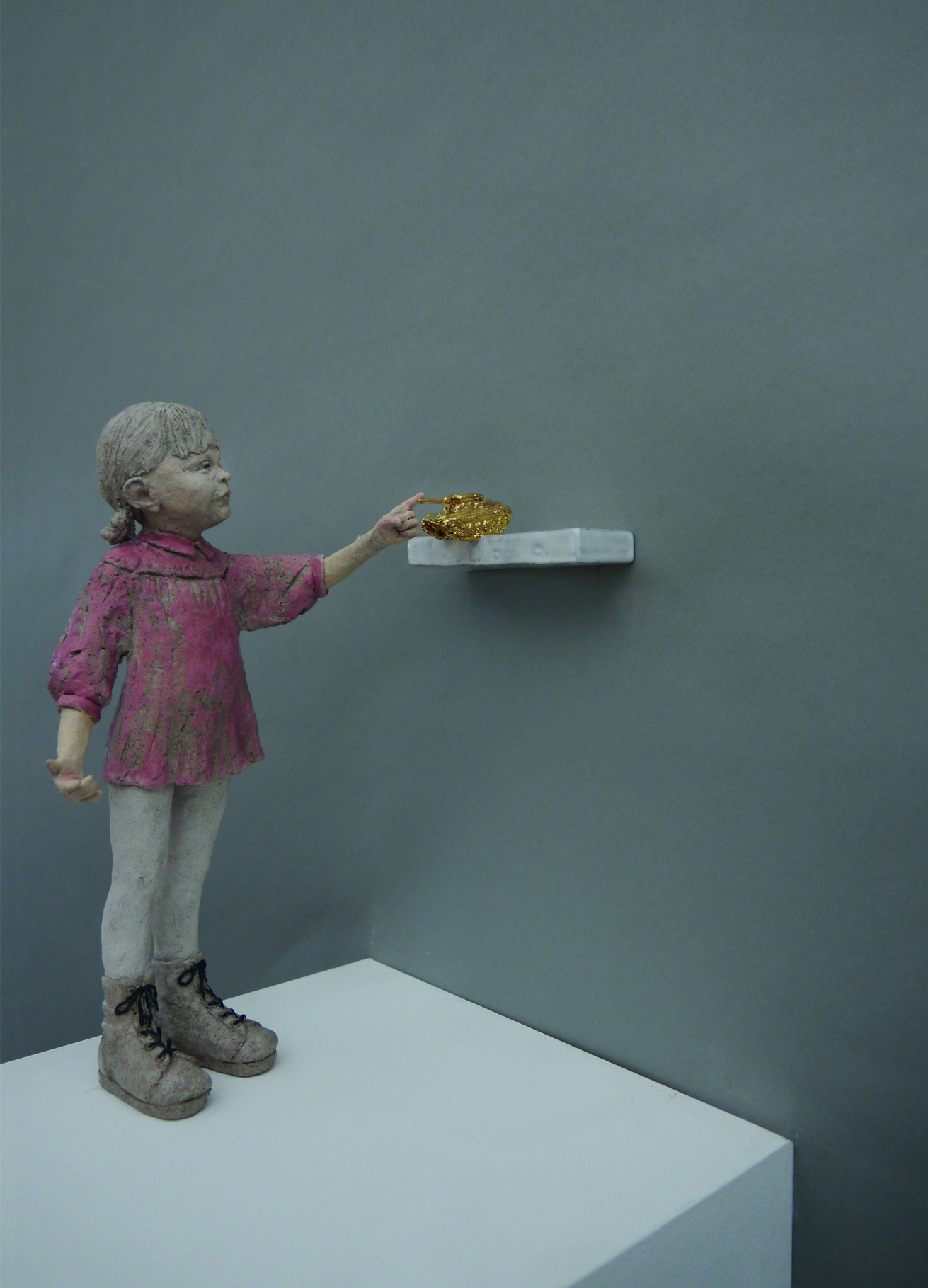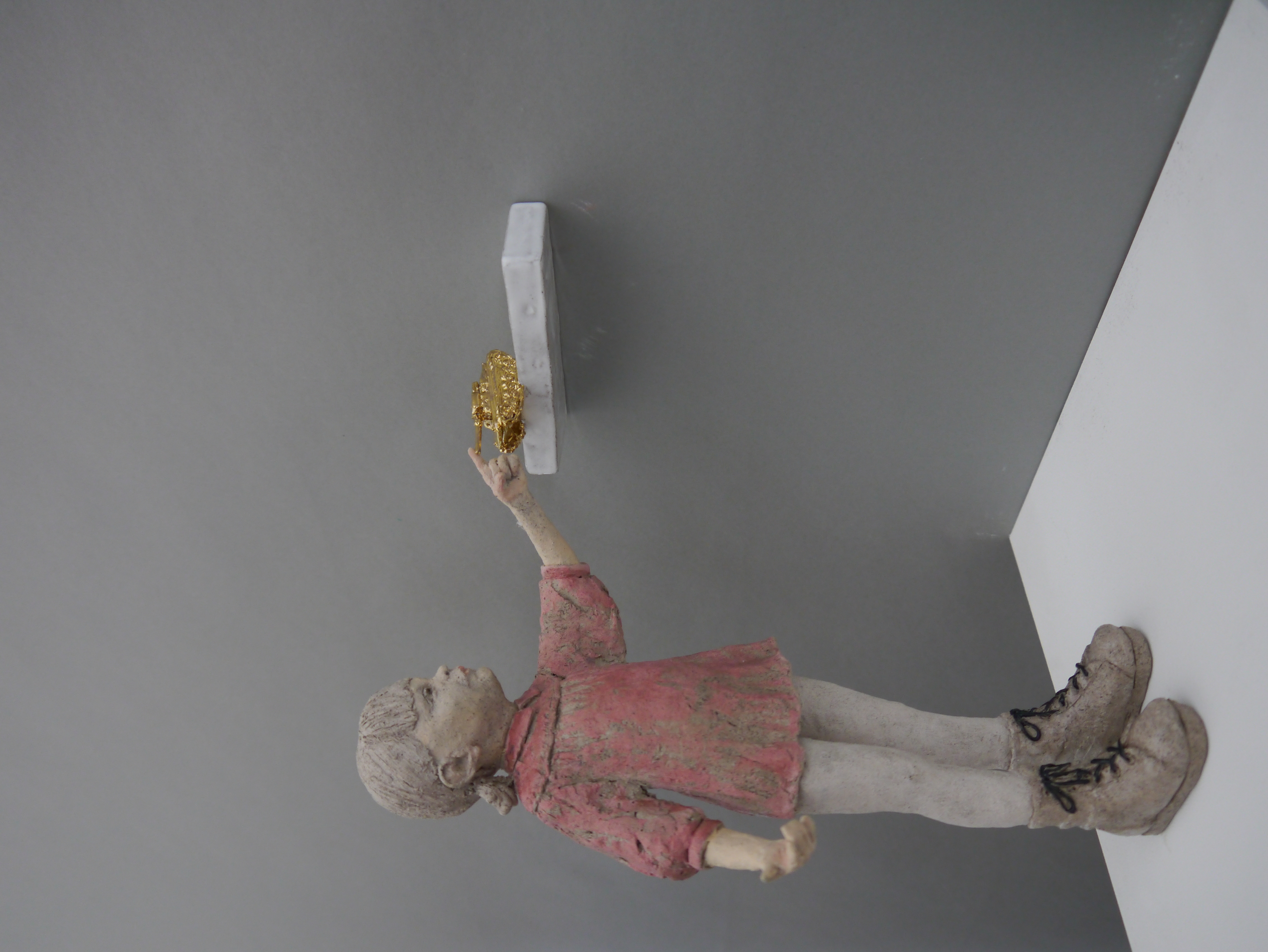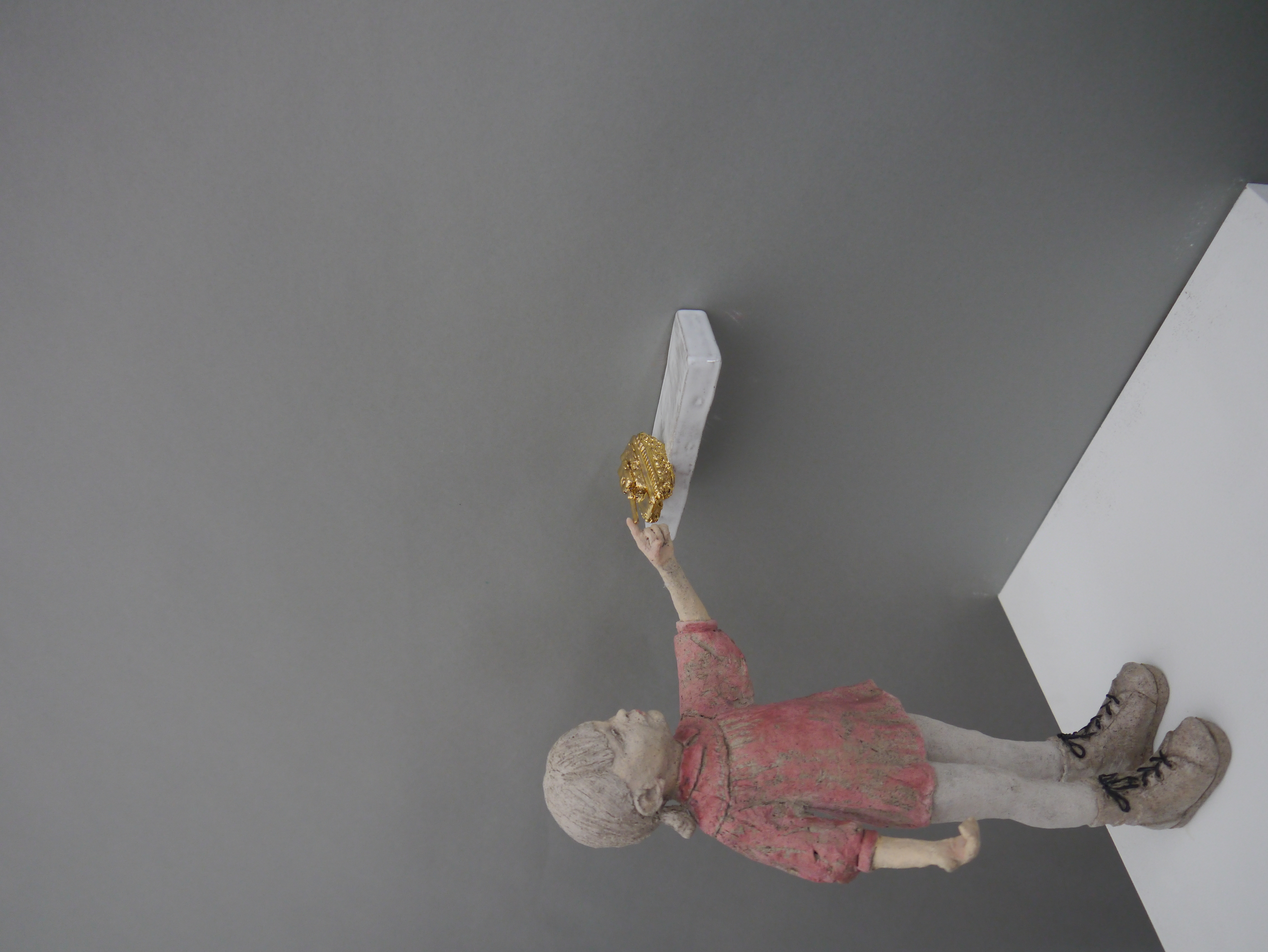 The divine spark, 2020 25 x 50 x 25 cm, shelf with tank: 10 x 3.5 x 6 cm, little girl: 13 x 26 x 10 cm, wall base: 25 x 36 x 25 Stoneware, engobe, glaze, gold luster, ceramic decal