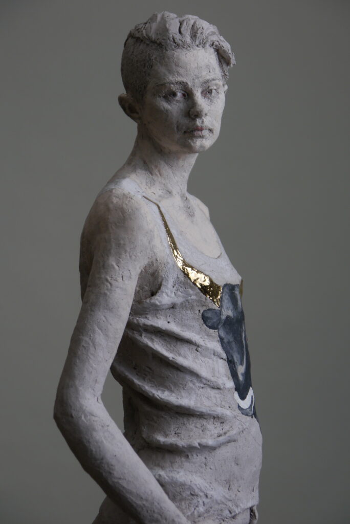 Politisch werden sie dann, wenn etwa ein Mann einen Rock trägt. “Wenn wir als Gesellschaft über Kleider und Gendersternchen diskutieren”, sagt Roos. Und letztlich geht es um die hehre alte Frage: Wer bin ich und mit wem umgebe ich mich. Der Mensch könne ganz wunderbar oder schrecklich sein, jede kulturelle Äußerung wird aber sinnlos ohne unsere Umgebung. Beim Verbildlichen dieser Gedanken geht es der Künstlerin nie um banale oder stimmige, auf der Hand liegende Verknüpfungen von Figur und Attribut. Um Binsenwahrheiten in Ton gebrannt. Es sind die Dissonanzen, die sie interessieren: Wenn etwa eine Mädchen-Figur das T-Shirt mit der Aufschrift “just a girl who loves wolves” trägt, ist die Botschaft oder Interpretation der Künstlerin: Das T-Shirt und das Märchen von Rotkäppchen verschmelzen zu einer delikaten Botschaft, in der wohl auch die seismografische Natur von Künstlern durchschimmert. Denn, so sagt Roos, “das hat für mich eindeutig etwas Pädophiles”. In der Figuren-Gruppe der Apostelinnen indes- hier wird die weibliche Form gebraucht, trotz der Mehrzahl an männlichen Figuren- kommen die Couragierten unserer Gesellschaft auf einen goldenen Sockel, geht es um Protestierende, die wie Heilige dargestellt werden: 12 weibliche und männliche Figuren, unterschiedlicher Größe, jede auf einem goldenen Sockel wie man es von mittelalterlichen Skulpturen kennt, hat Roos mit kulturellen oder politischen Symbolen und Insignien einer bestimmten Gruppe ausgestattet. Sie repräsentieren jene, die sich aktuell für Weltverbesserungen einsetzen: die Klimakleberin mit orangefarbener Schutzjacke, der Protestierende mit Plakat gegen den russischen Angriffskrieg, der Transsexuelle mit Plateausohlen und Regenbogenfahne. Die Künstlerin arbeitet mit Medien-Bildern und mit Figuren, deren zugehörige Zeichen jeder kennt und sie folglich eindeutig zu entschlüsseln weiss. Die Ästhetik des heutigen Protests, das wird hier deutlich, funktioniert ähnlich wie die der mittelalterlichen Heiligenfiguren. Damals die Attribute, die auf eine biblische Geschichte hindeuten. Heute die Attribute, die das aktuelle Anliegen und den Protest für oder gegen etwas verraten. Für Mittelalterliche Plastik schwärmte die Künstlerin übrigens schon früh. Als Kind liebte sie es, stundenlang in Kirchen zu verweilen und den Faltenwurf der Gewänder zu bestaunen. Andere Quellen ihrer Inspiration sind die Literatur von Haruki Murakami, der Zitat: “Kleidung so wundervoll zeitgenössisch beschreiben kann”. Mir persönlich kam beim Betrachten der Arbeiten auch Kunst von Kiki Smith in den Sinn: Ich erkenne Parallelen in der Darstellung, mehr noch als in der Aussage: Etwa in der poetischen Blässe, der Grobheit statt Glätte der Haut und der Schönheit in der Traurigkeit, wenn es um den Ausdruck der Figuren geht.