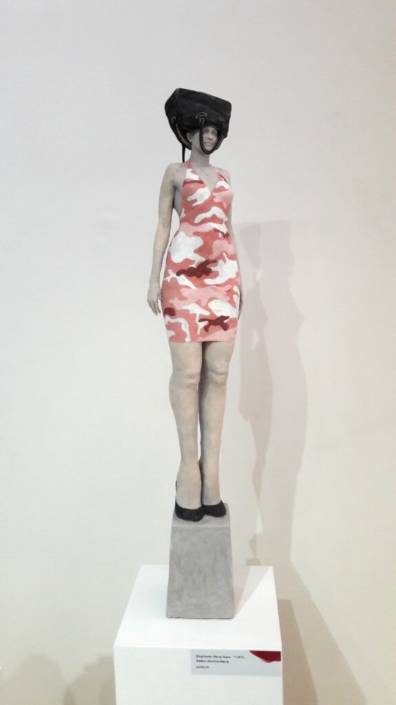 „Die in besonderem Maße authentischen und unverwechselbaren Figuren „Uniform“, „Hoodie“ und „schwarzrotgold“, für die Stephanie Marie Roos den ersten Preis des Südwestdeutschen Keramikpreises erhielt, sprengen die Eindeutigkeit der Interpretation auf und liefern eine breite Projektionsfläche für inhaltliche Auslegungen und Zugänge. So ist es naheliegend, ihre figurativen Keramiken mit Adjektiven wie ambivalent, hinter-
