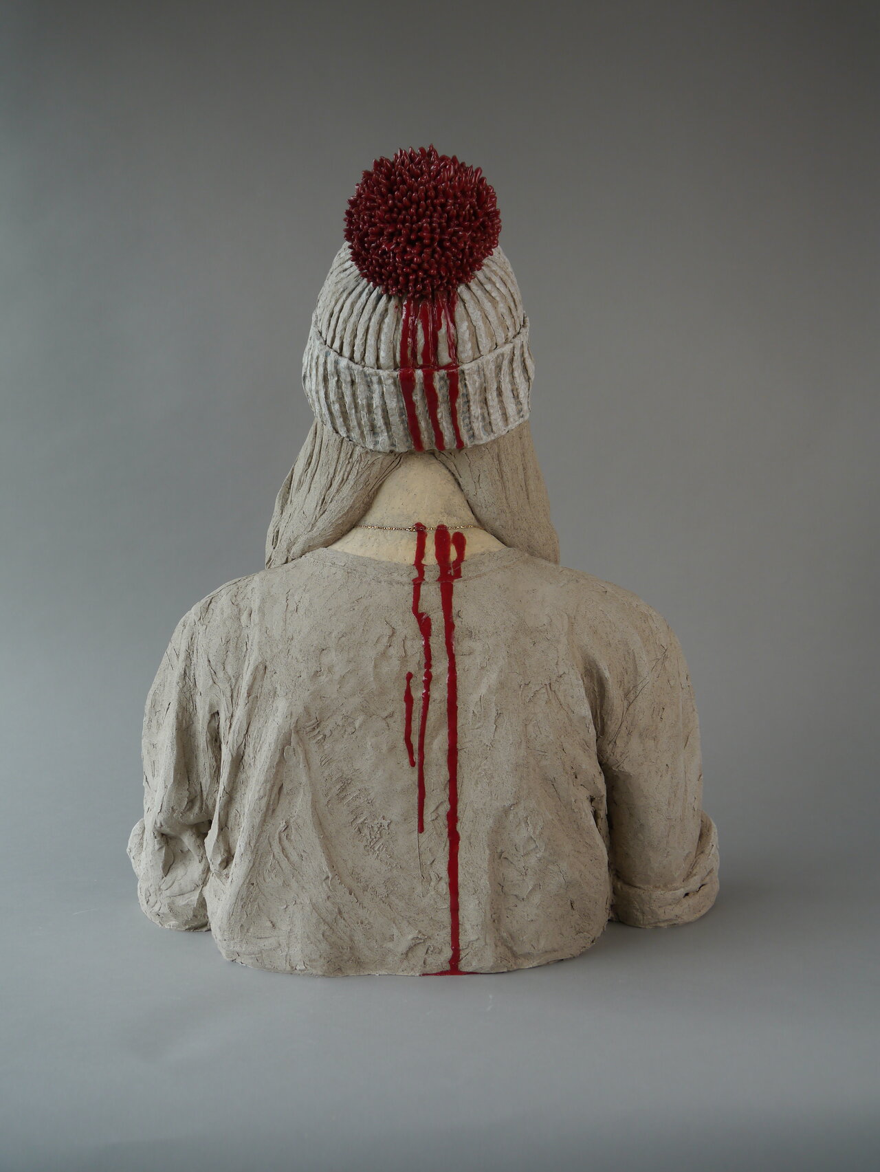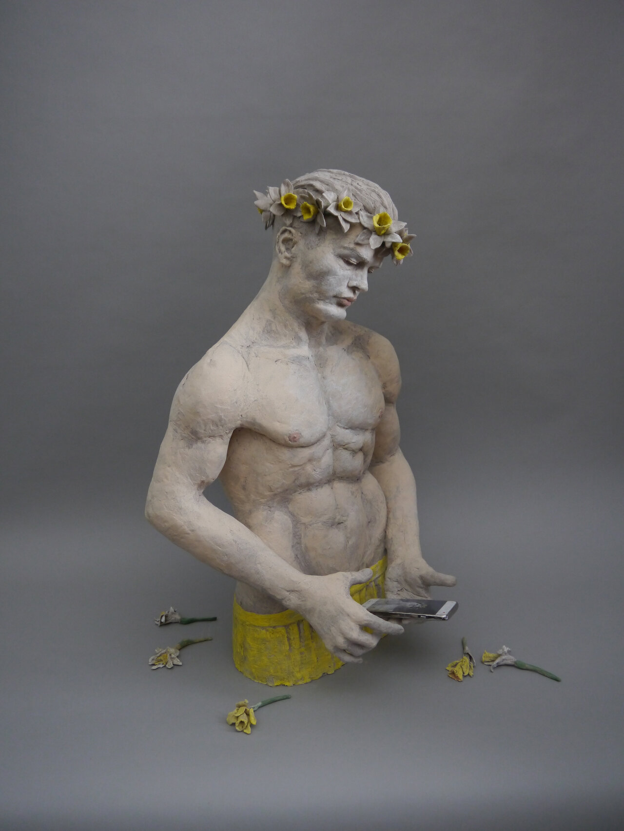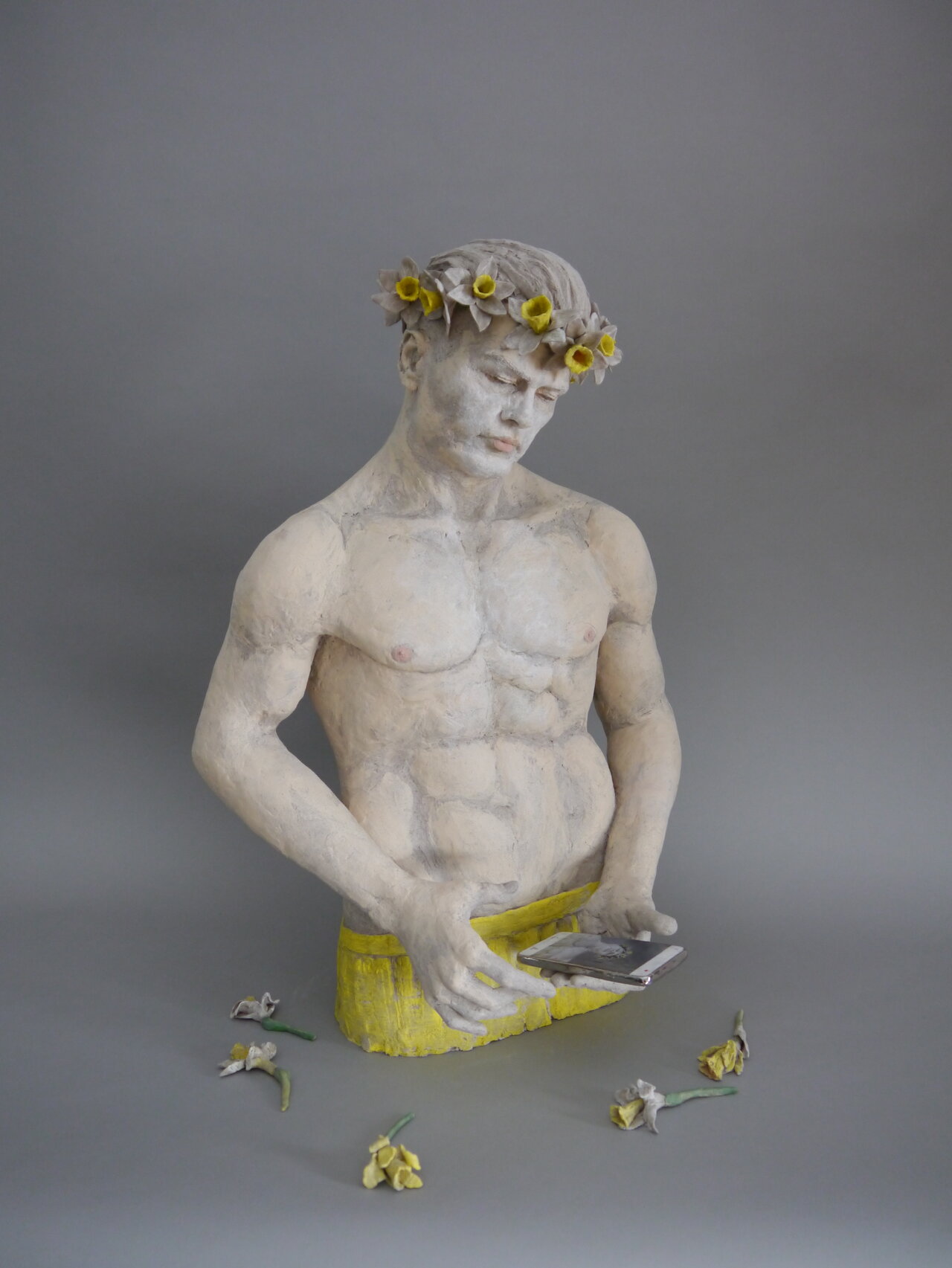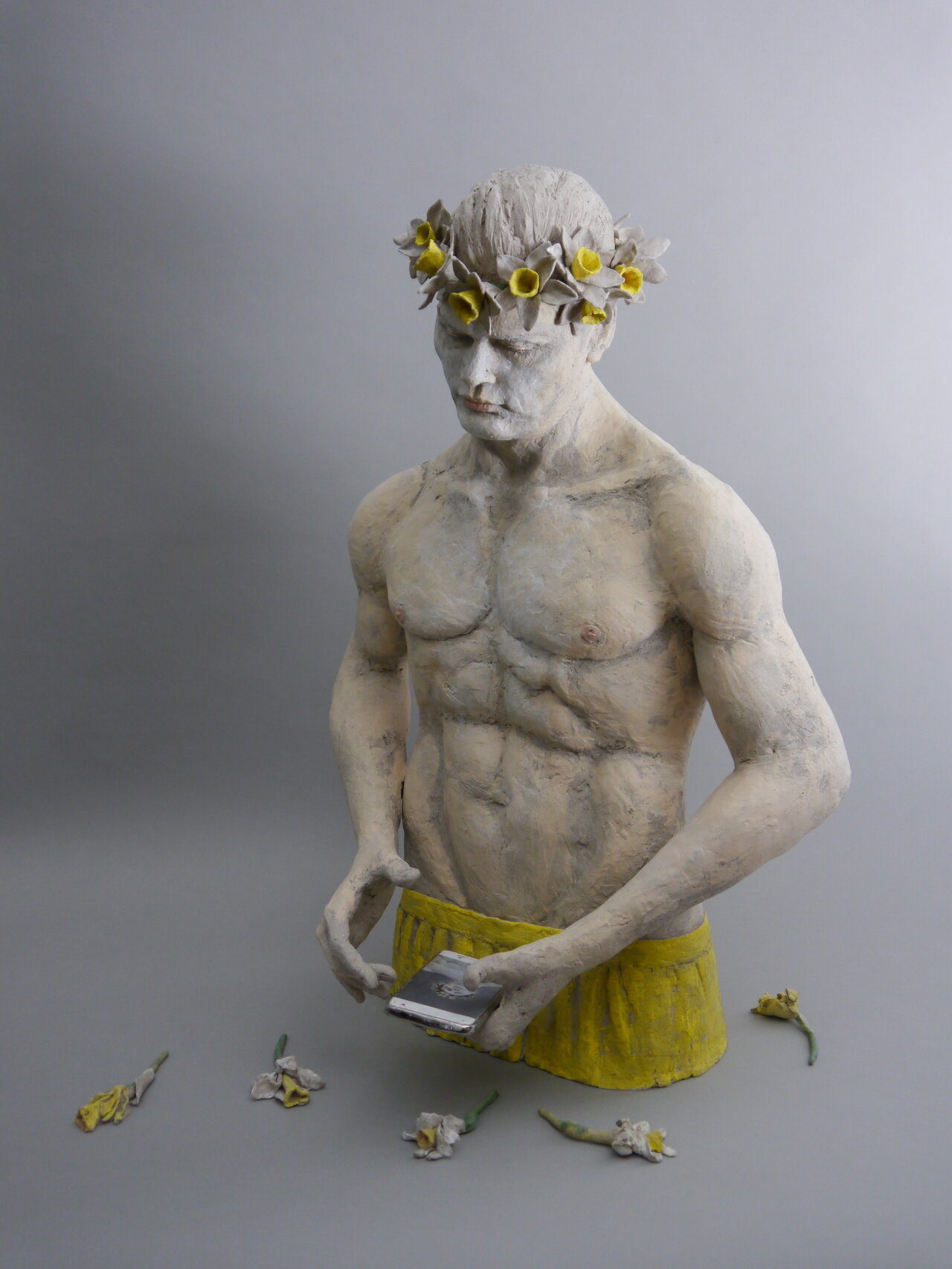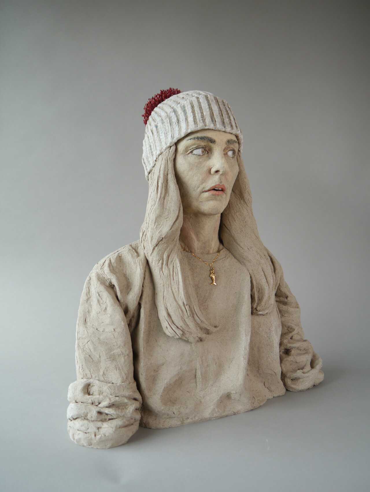 Stephanie Marie Roos, 2020, 44 x 25 x 47 cm, Steinzeug, Engobe, Unterglasurdecal, Glasur, Glanzgold