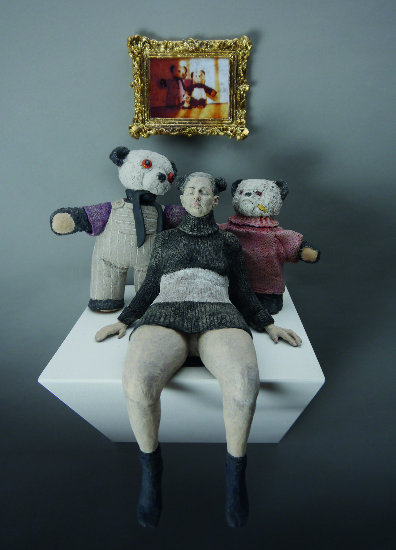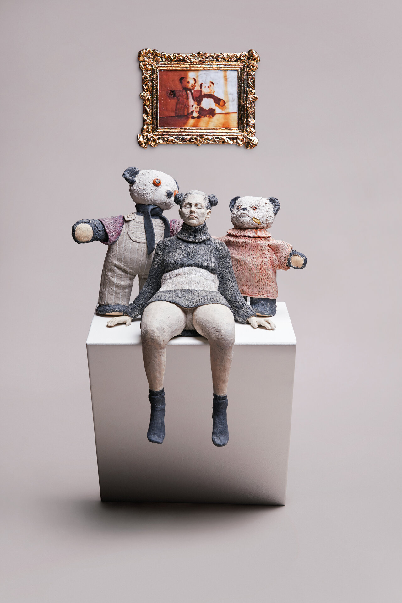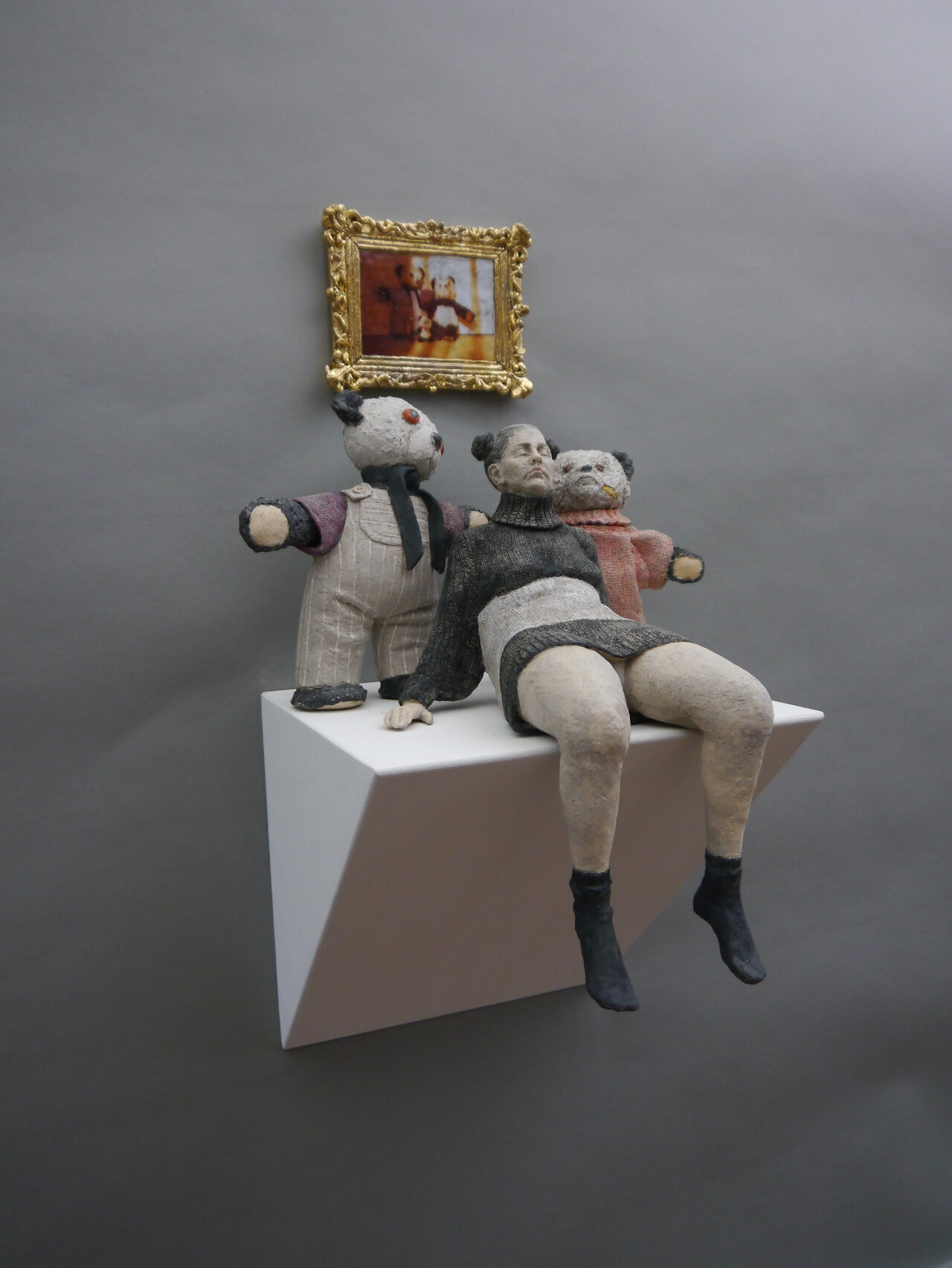 25 x 54 x 25 cm Bilderrahmen: 14,5 x 12 x 2 cm Bär, links: 18 x 18,5 x 7 cm Frau in Pullover: 21 x 16 x 19 cm Bär, rechts: 15 x15,5 x 6 cm Wandsockel: 25 x 36 x 25