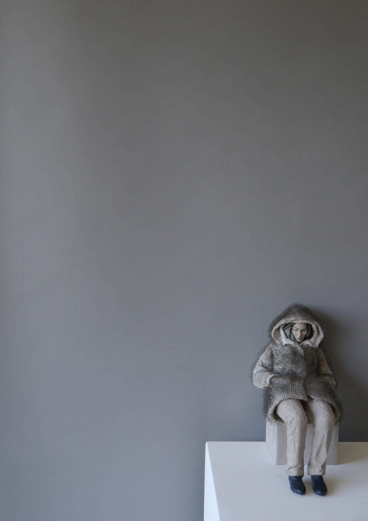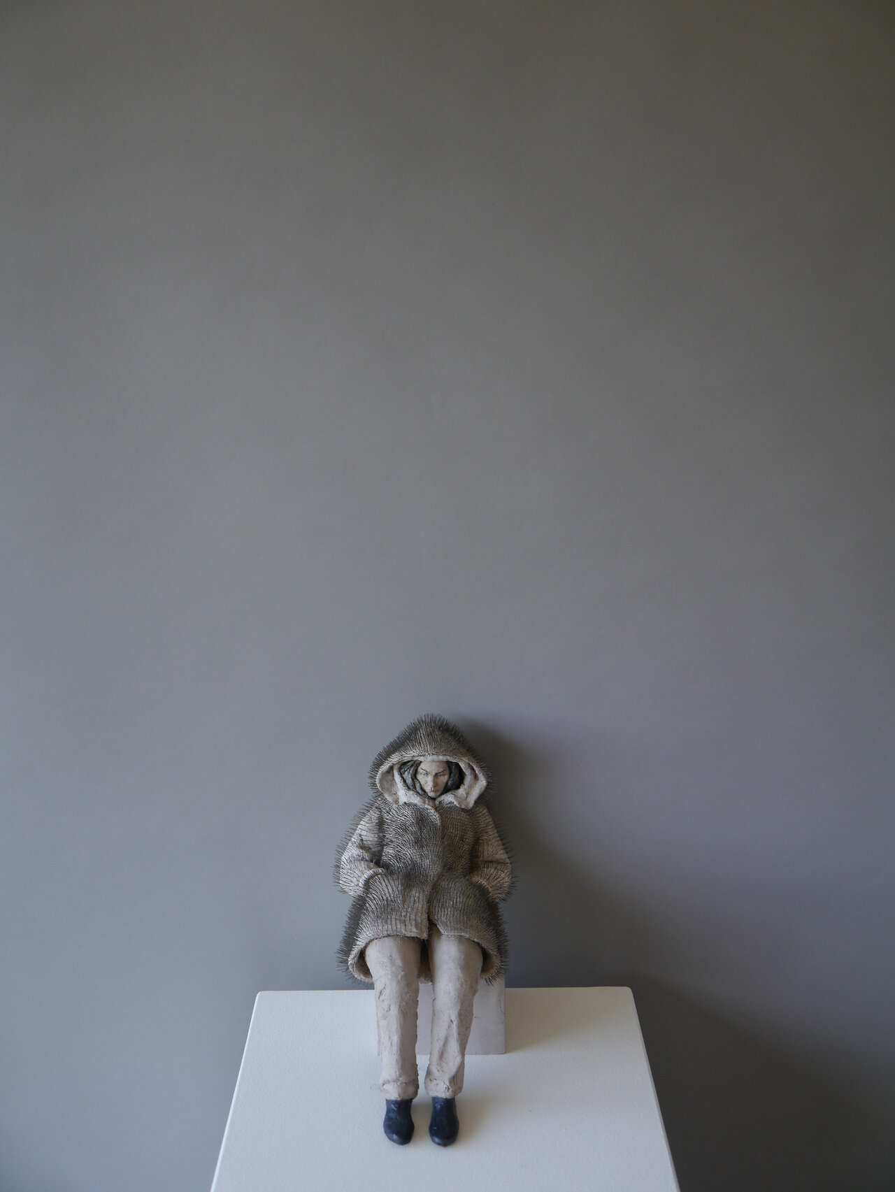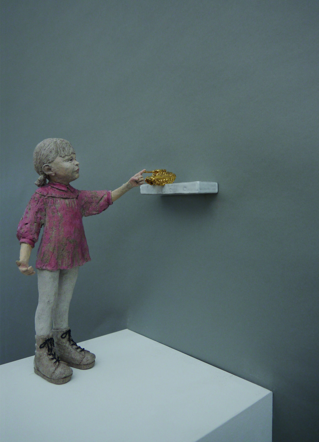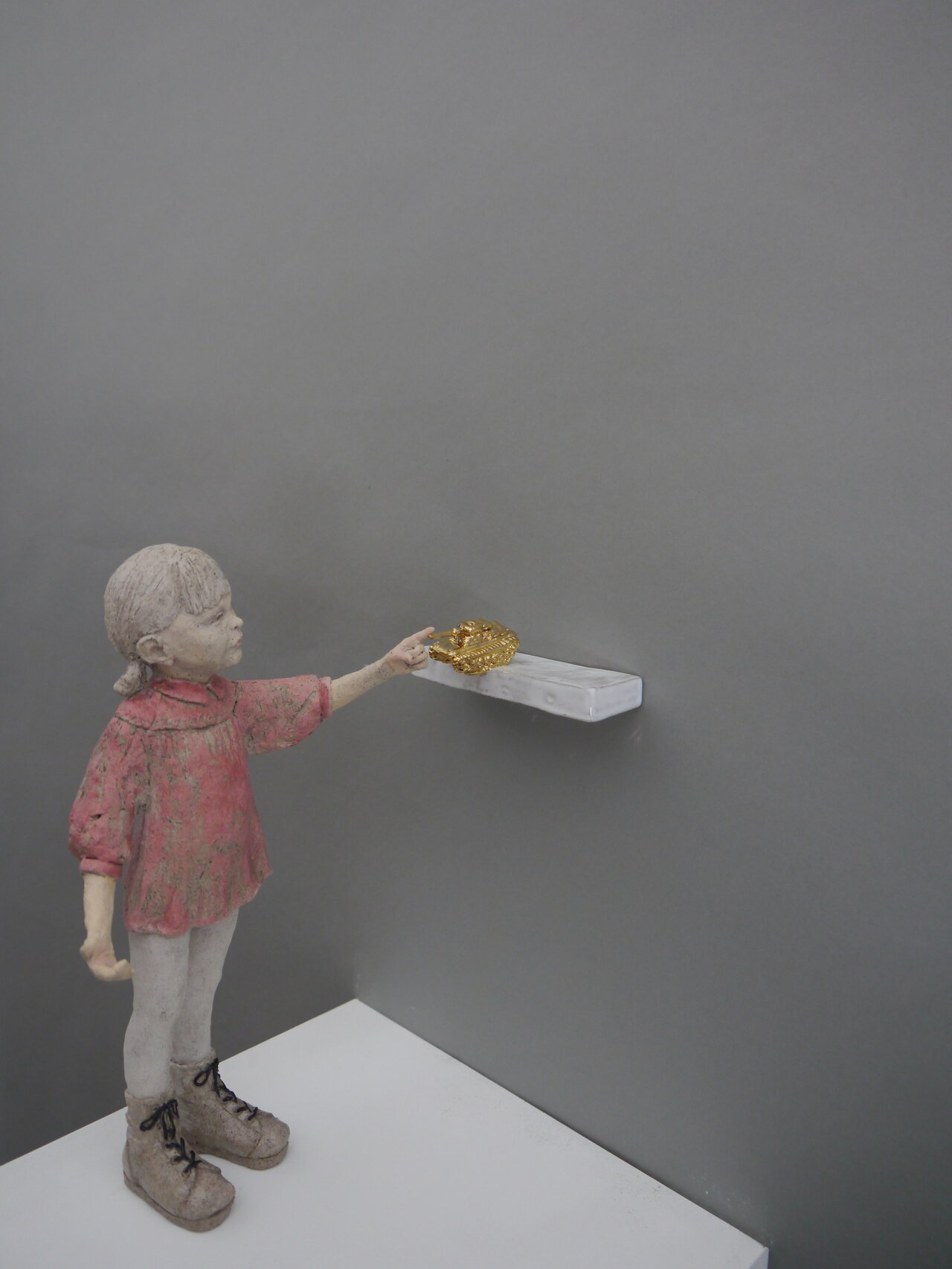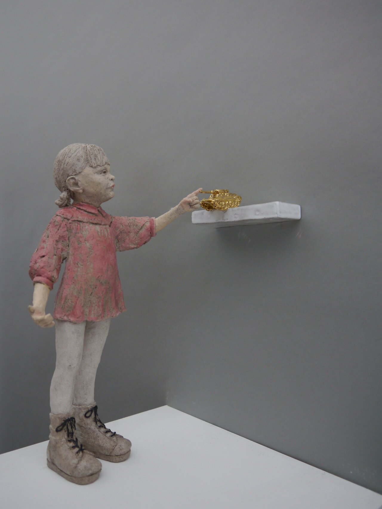 25 x 50 x 25 cm, Regal mit Panzer: 10 x 3,5 x 6 cm, Kleines Mädchen: 13 x 26 x 10 cm, Wandsockel: 25 x 36 x 25