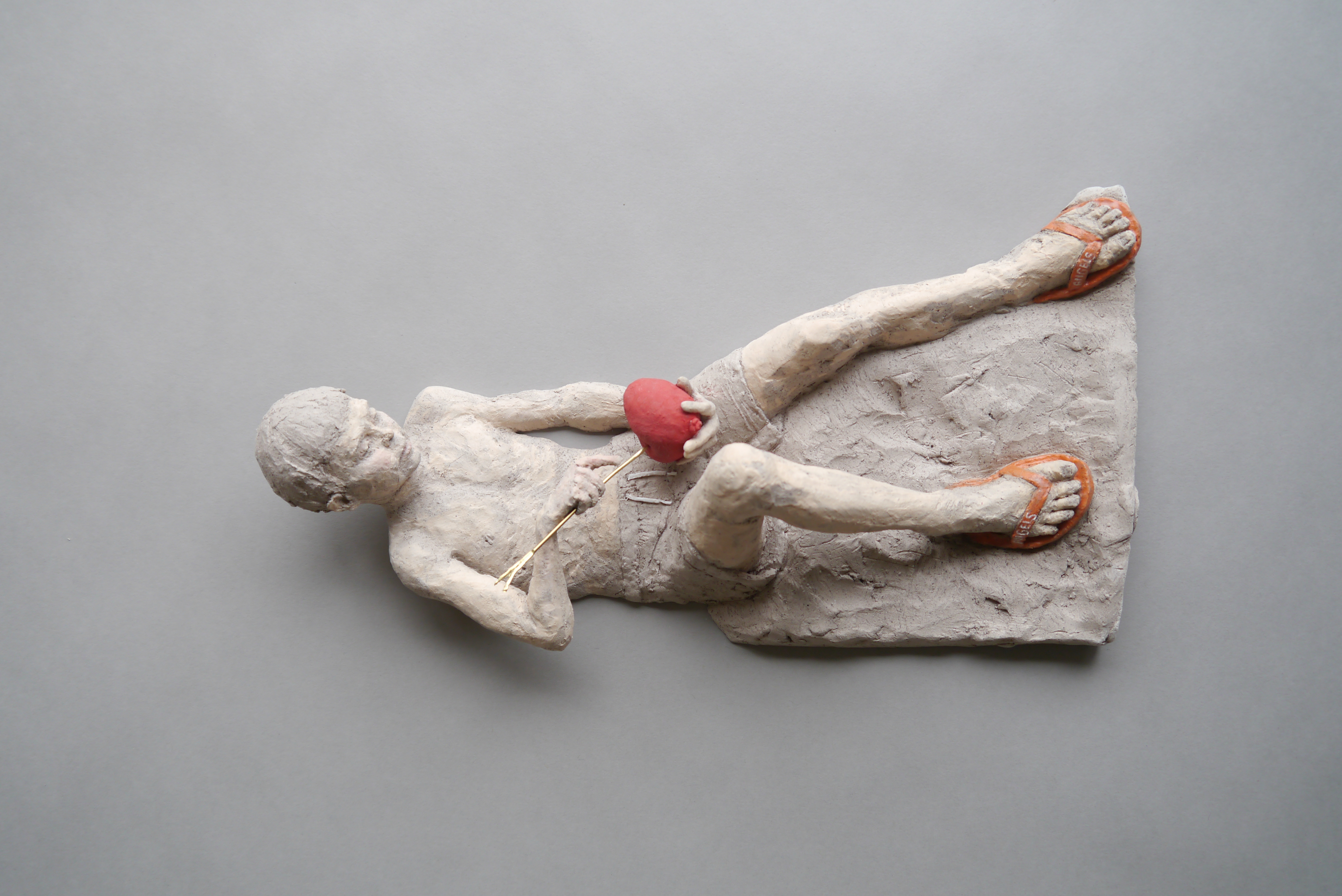 Amor, einen Pfeil in ein Herz stechend, 2024 33 x 18 x 9 cm Steinzeug, Pigmente, Glasur, Messingdraht Wandobjekt