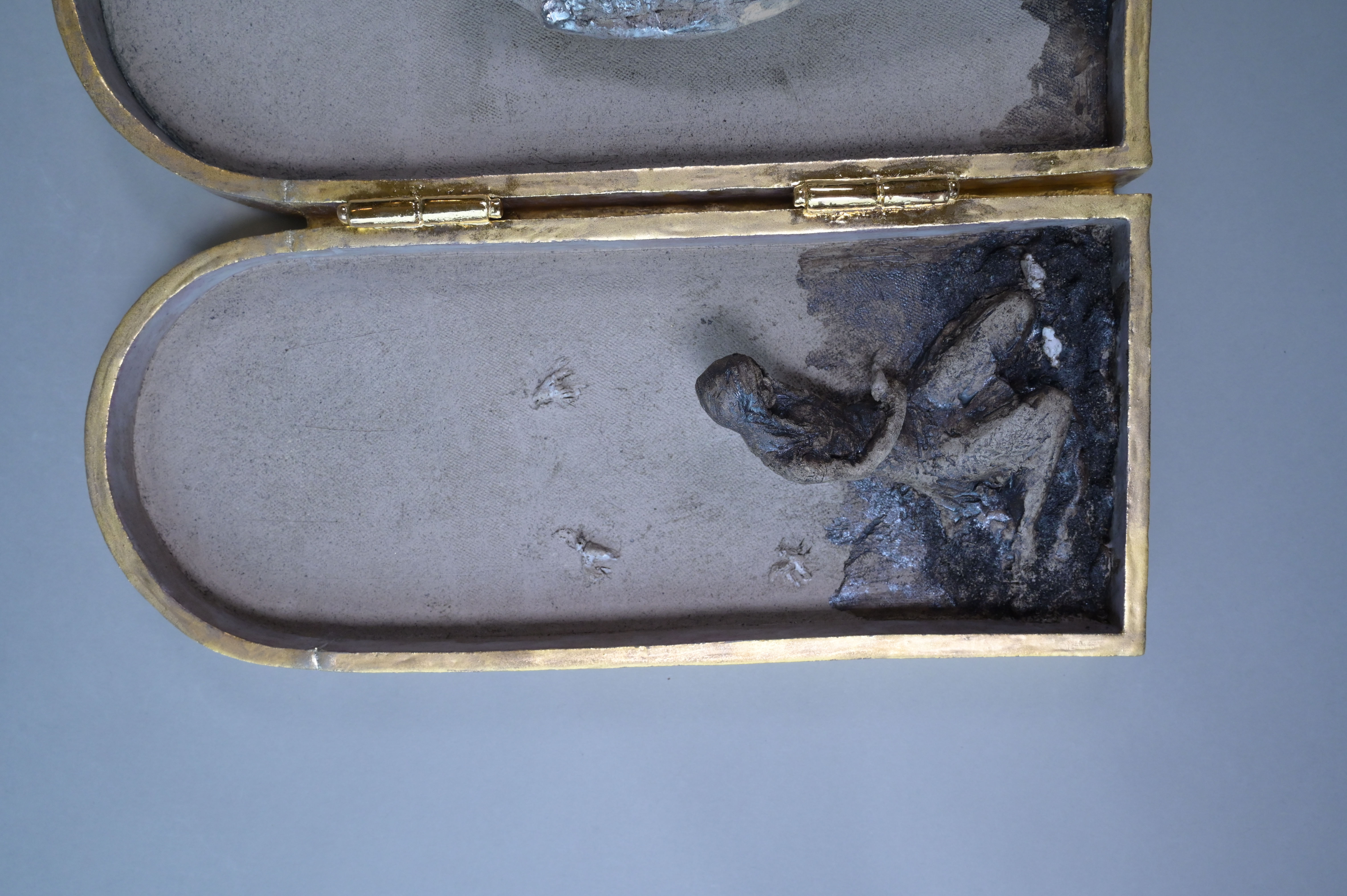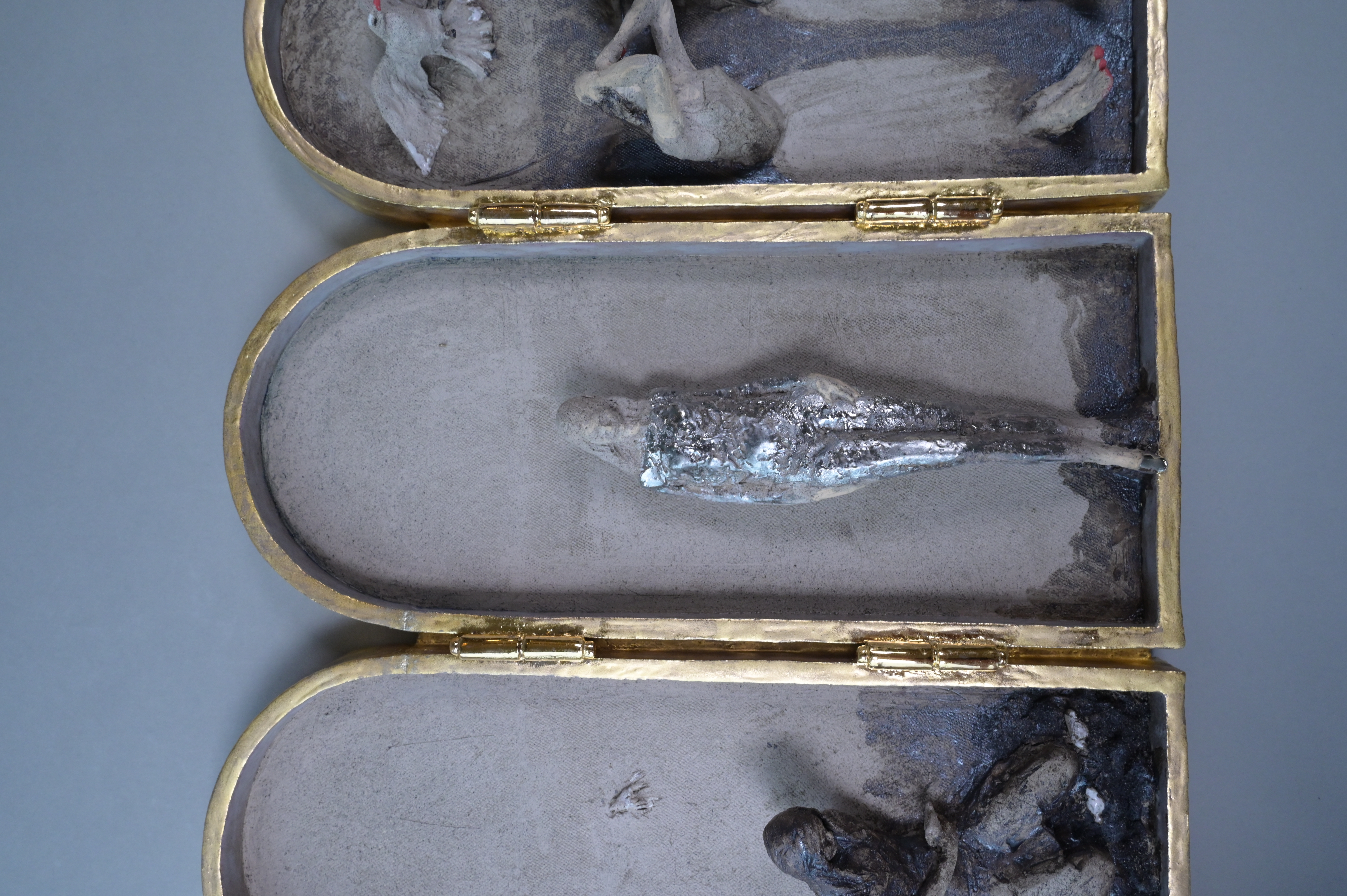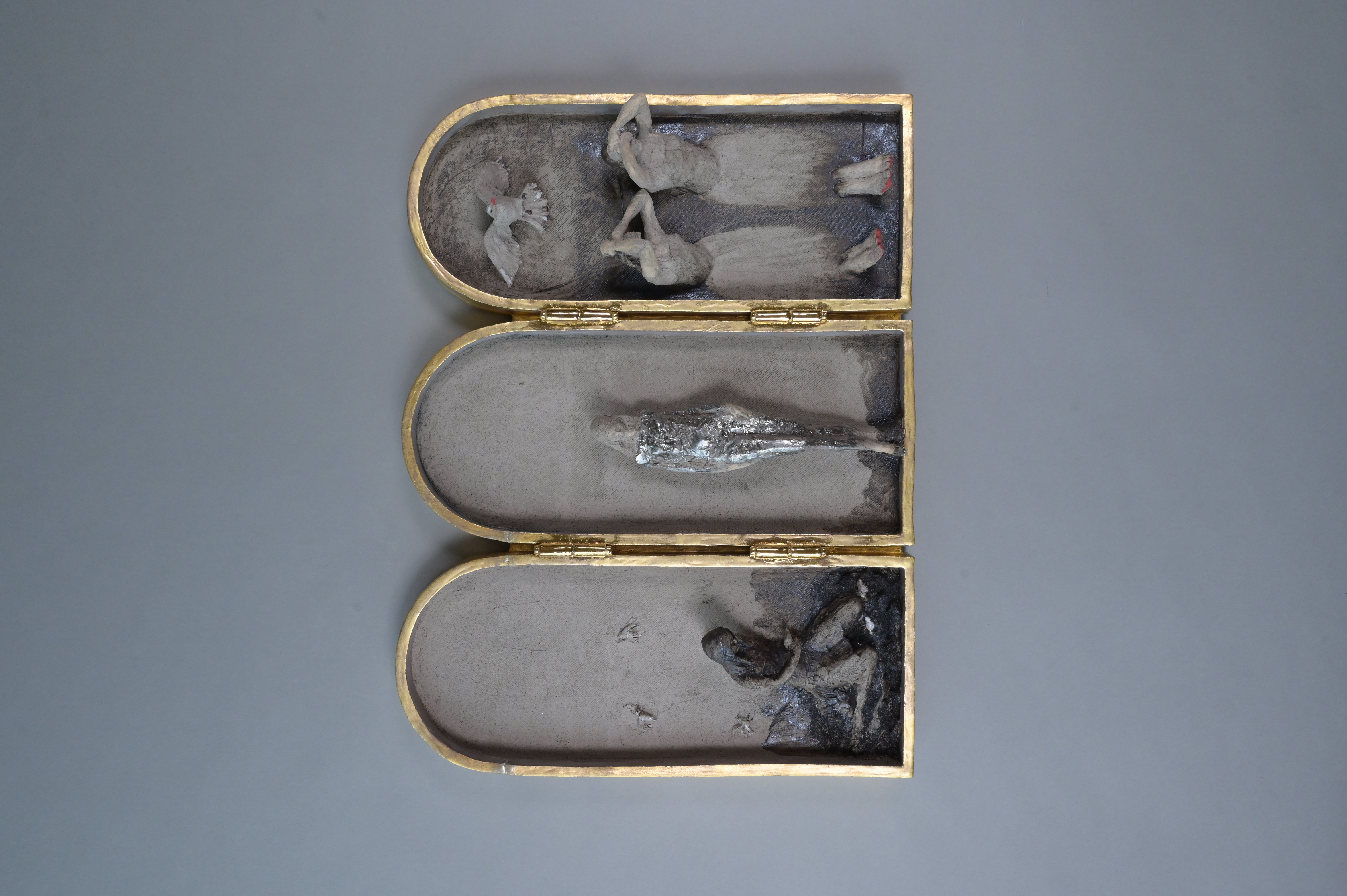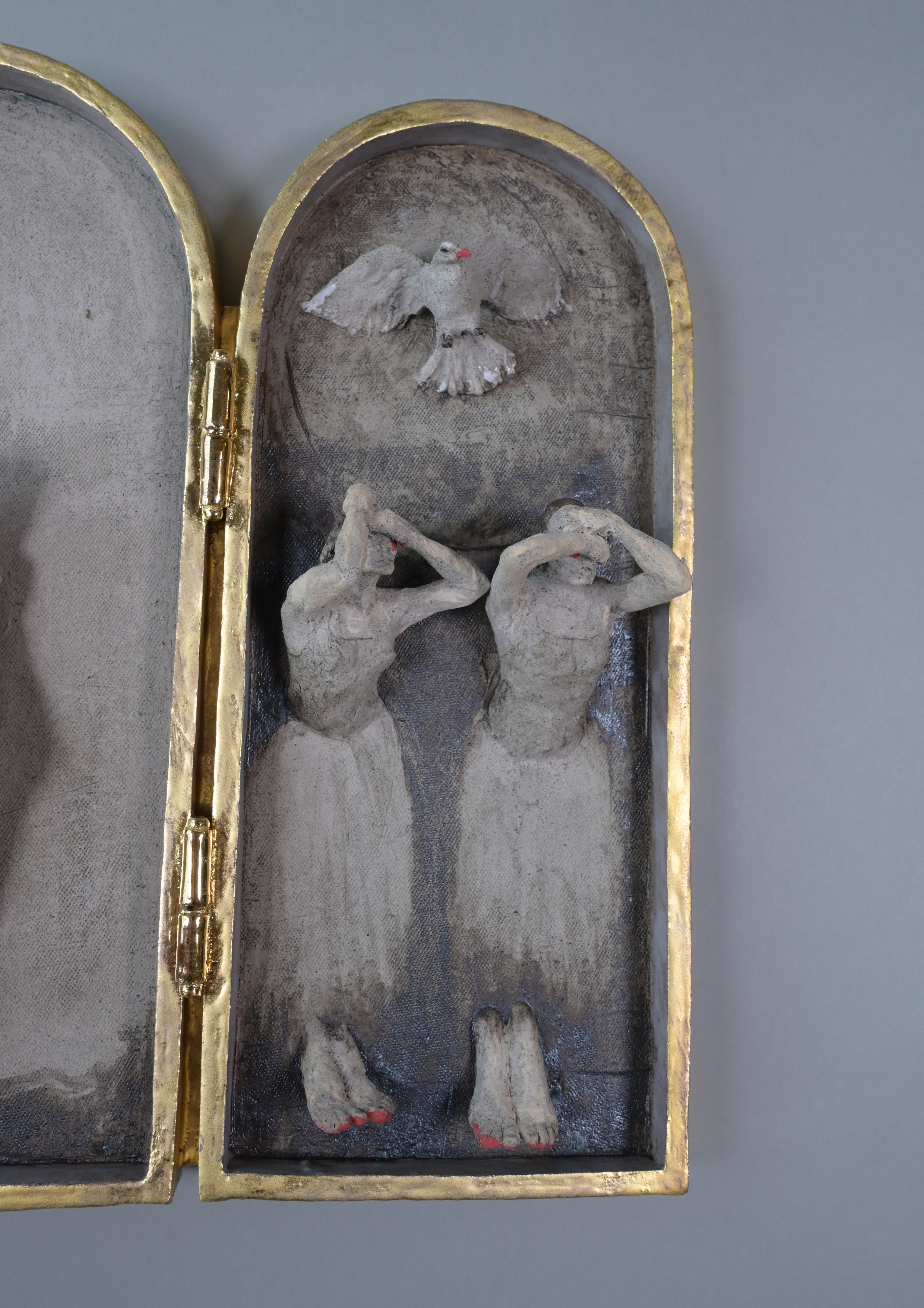 Aschenputtel, 2025 37 x 28 x 5,5 cm Steinzeug, Engobe, Pigmente, Oxide, Glasur, Glanzgold und Glanzplatin Wandarbeit