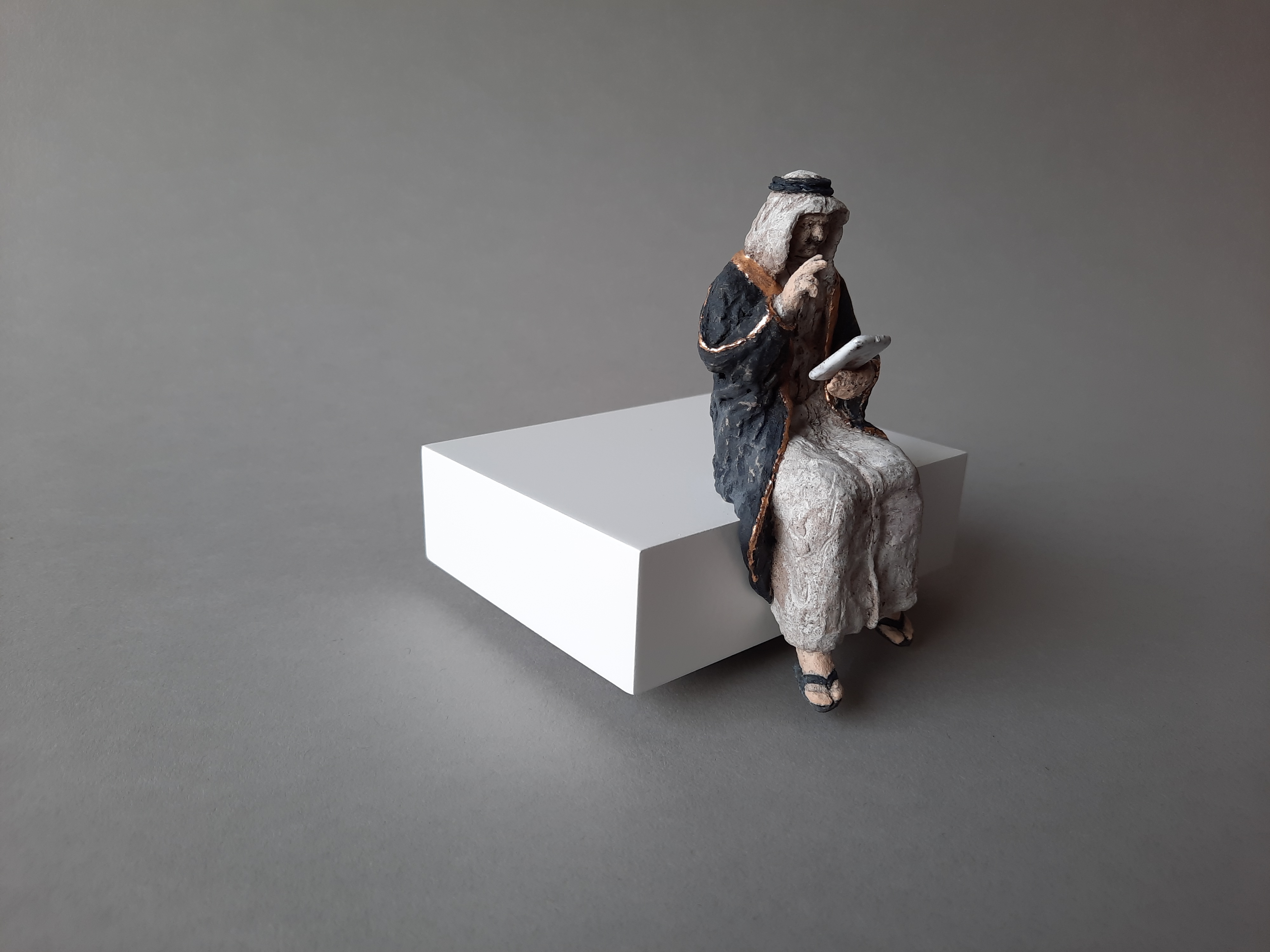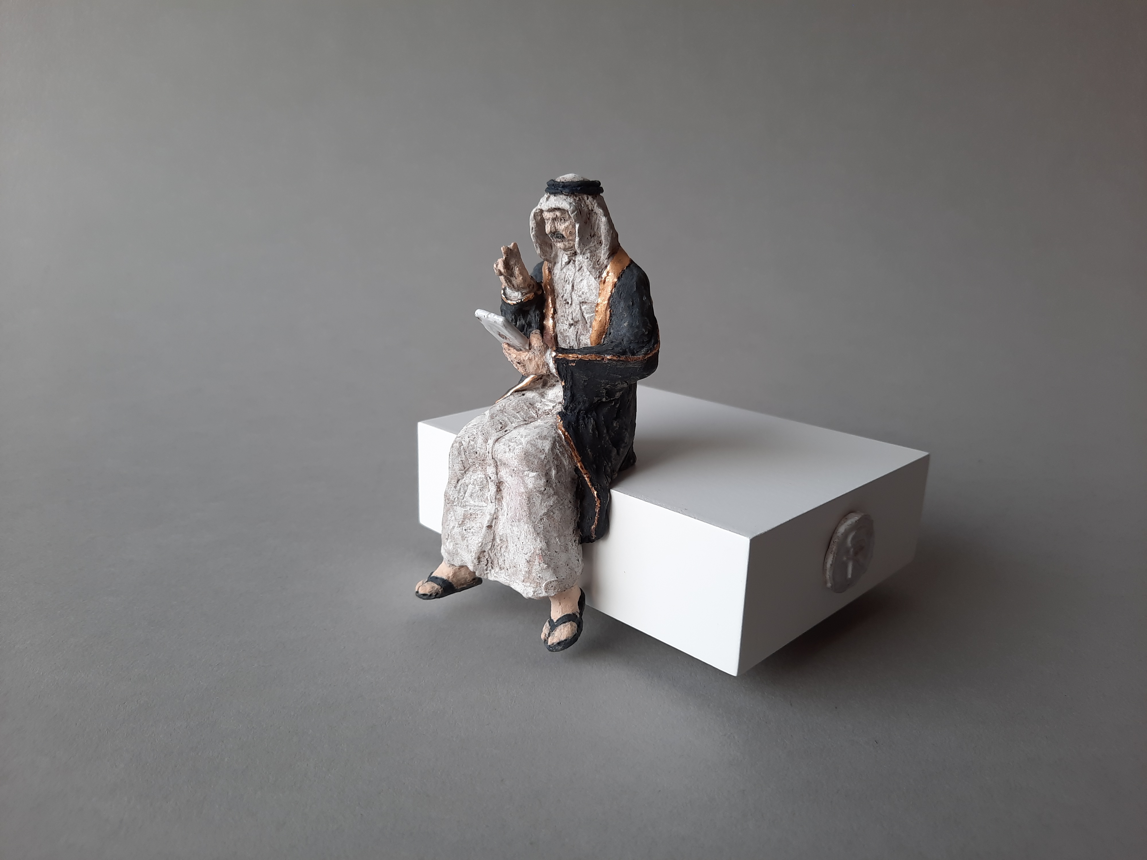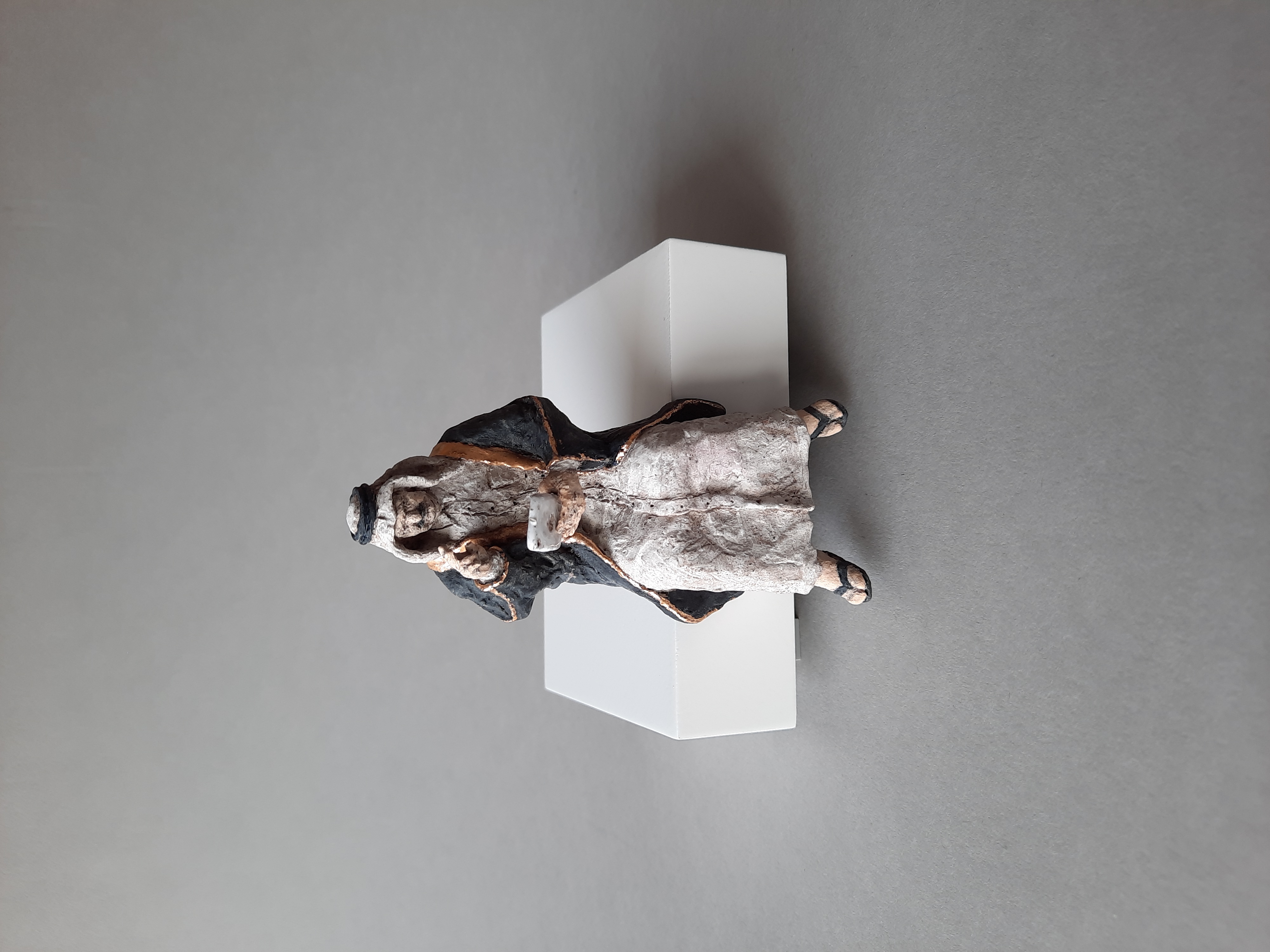 Der Pantokrator, 2023 9,5 x 5 x 5 cm , Wandsockel: 3 x 10,5 x 8 cm Steinzeug, Engobe, Glasur, Glanzgold, Keramik-Decal