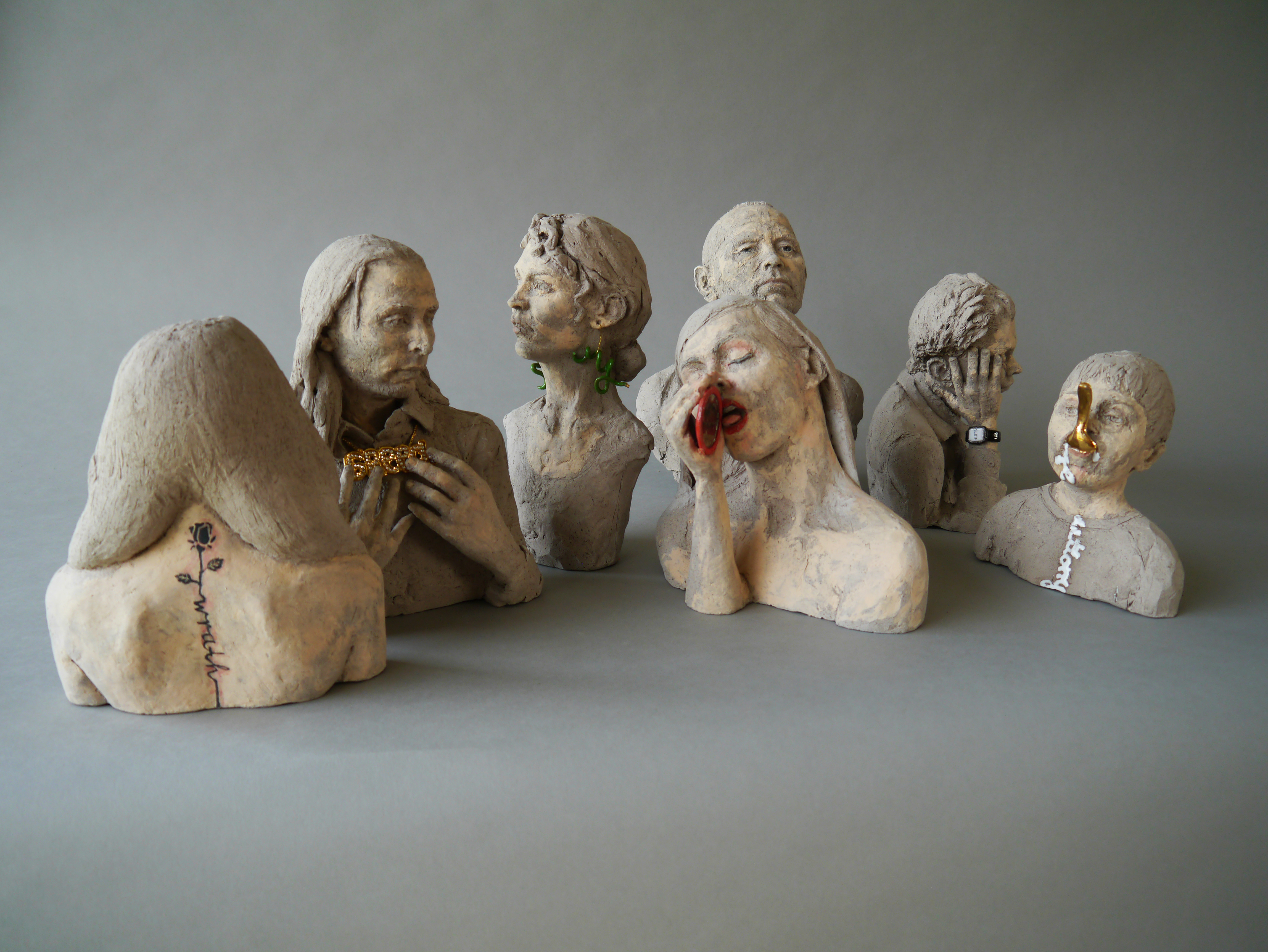 Die 7 Todsünden, 2022 Höhe von 15 bis 22 cm Steinzeug, Engobe, Pigmente, Glasur, Gold- oder PlatinGlanzgold, teils mit Strasssteinen oder Keramikdecal
