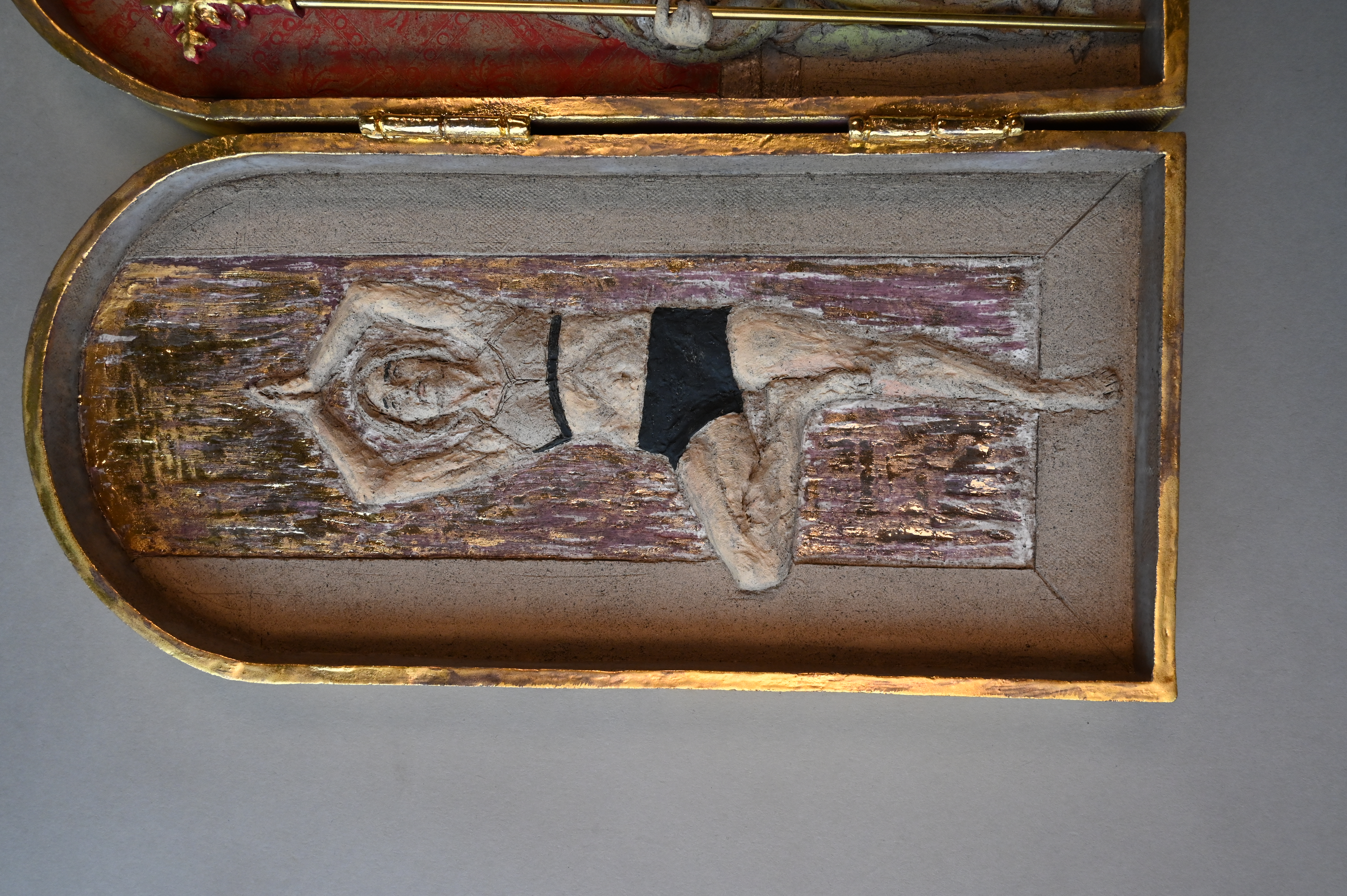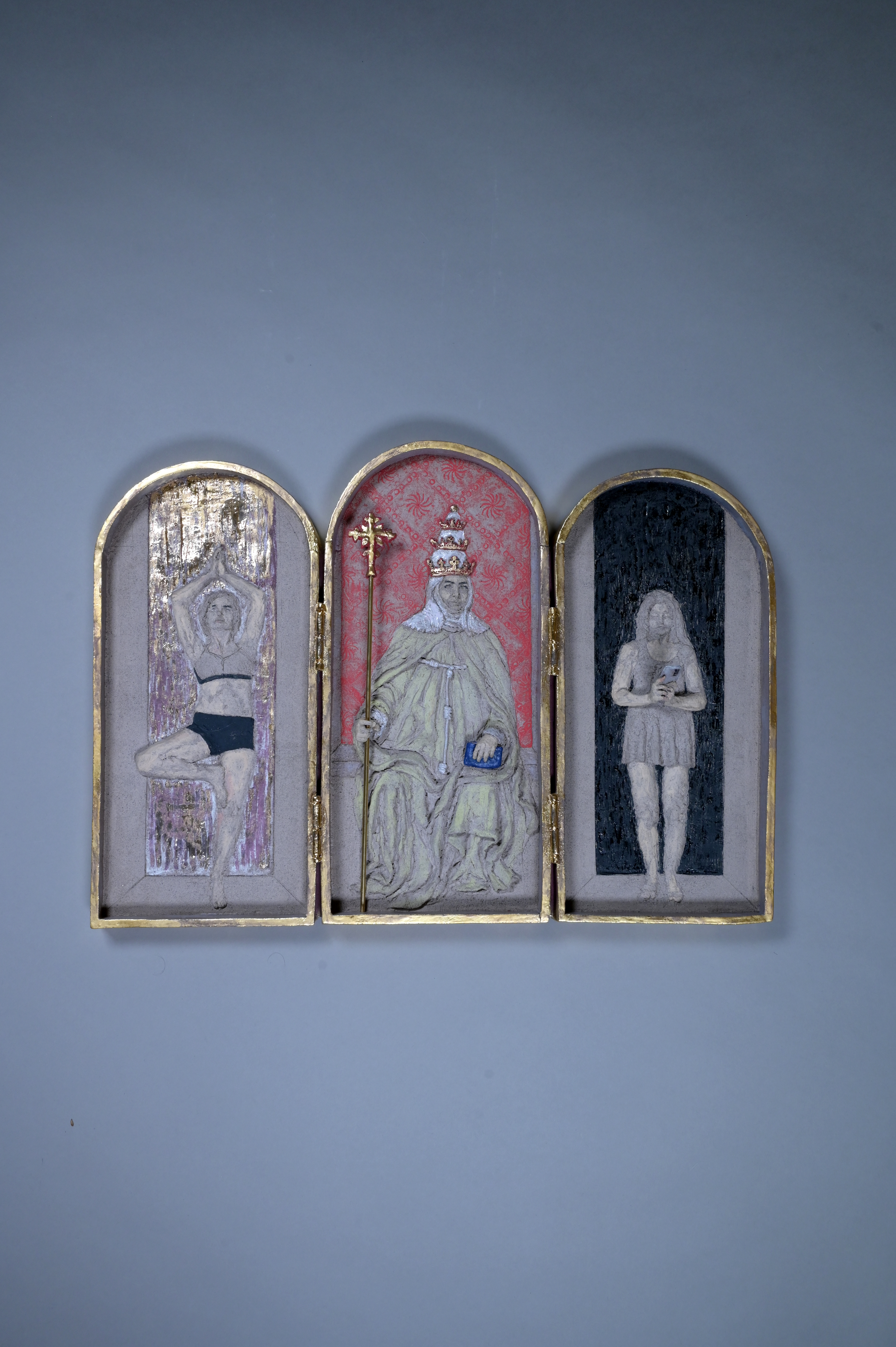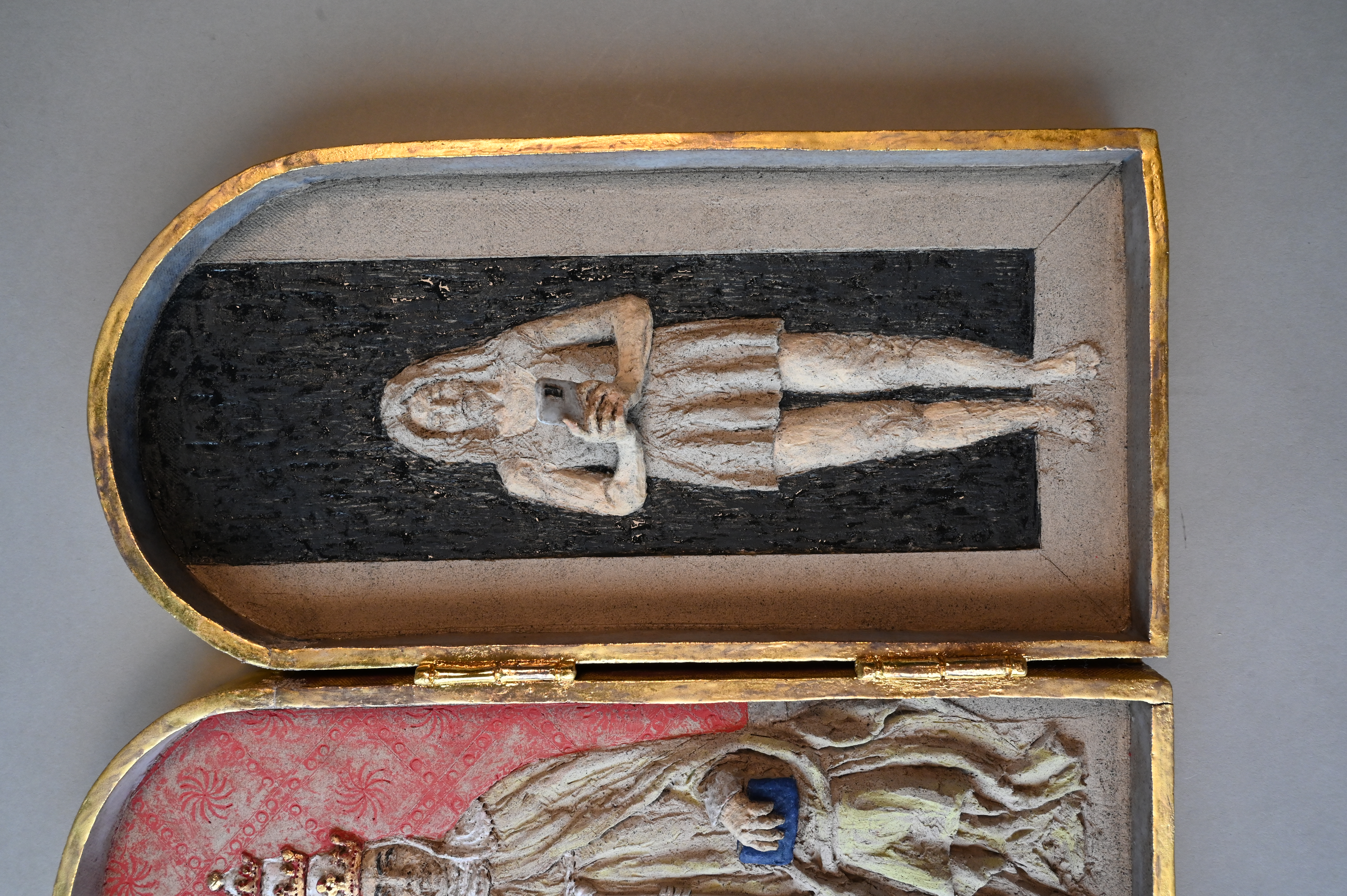 Frau Holle, 2025 41 x 29 x 2 cm Steinzeug, Engobe, Pigmente, Glasur, Glanzgold, Messingdraht Wandarbeit