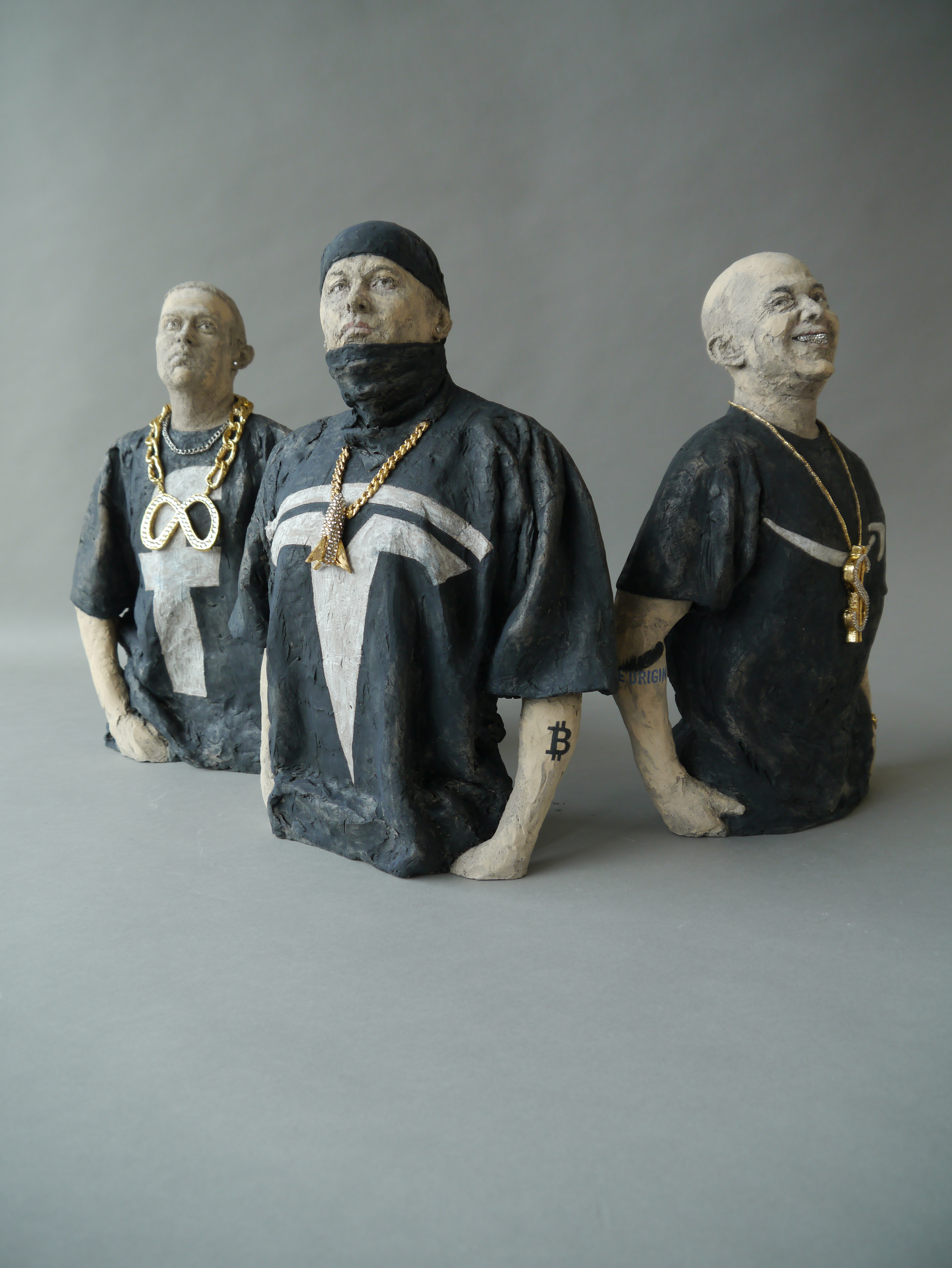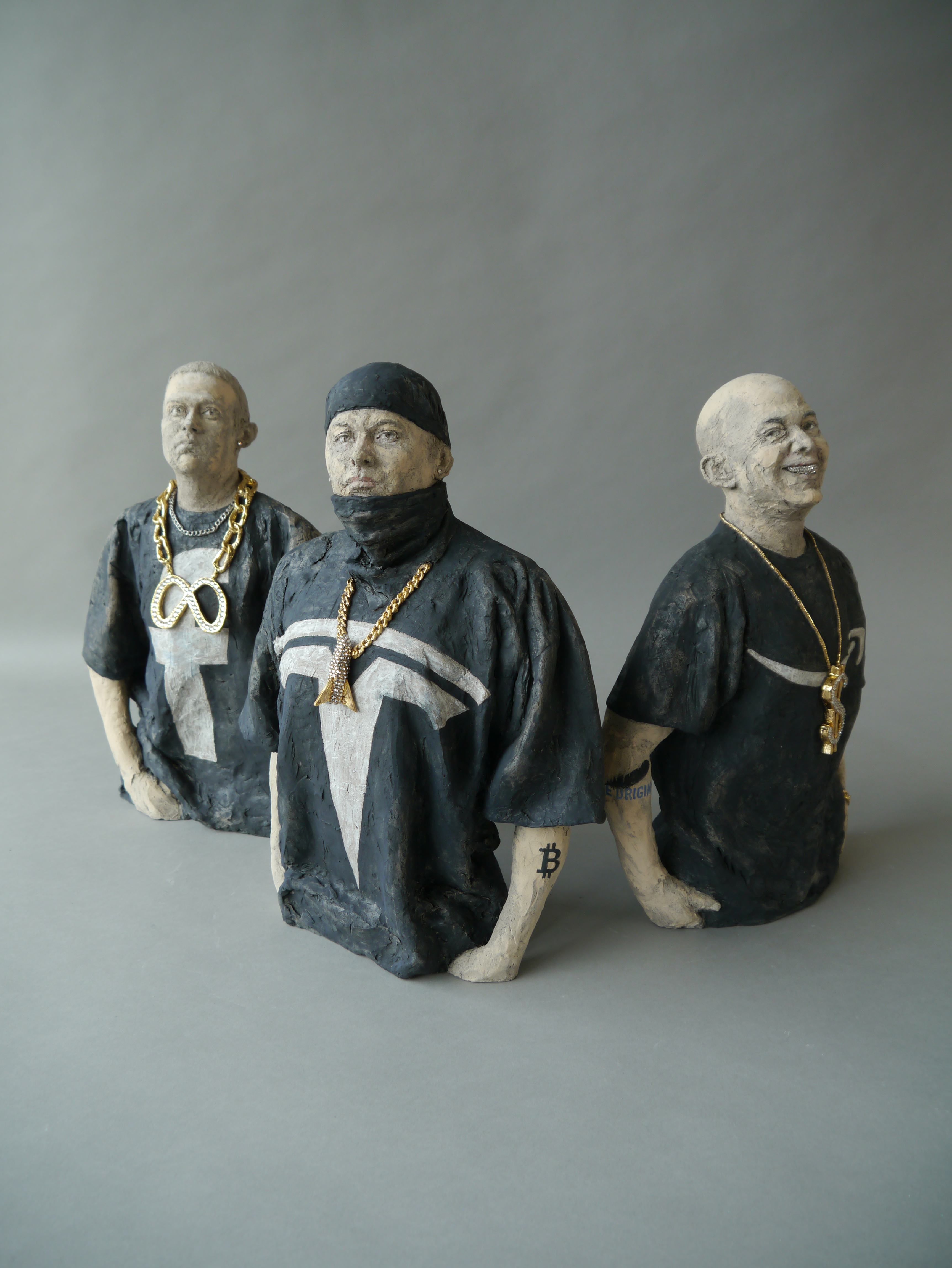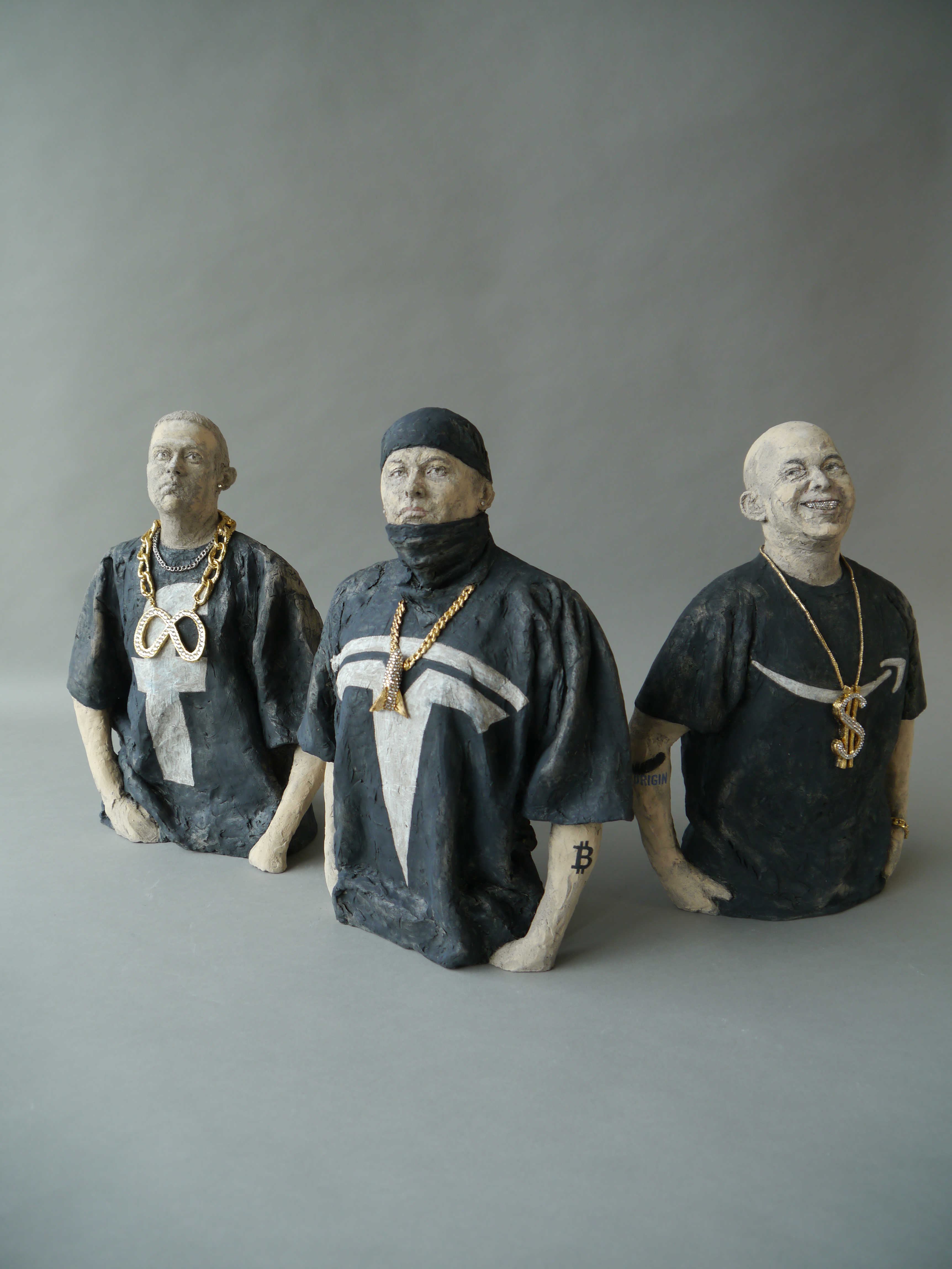 Gangsta Shit – Beg for Mercy!, 2022 Bezos: 38 x 27 x 10 cm, Musk: 39 x 28 x 11 cm, Zuckerberg: 38 x 30 x 13 cm Steinzeug, Engobe, Pigmente, Glasur, Strasssteine – Museum Carouge/ Musée de Carouge, Carouge, Schweiz