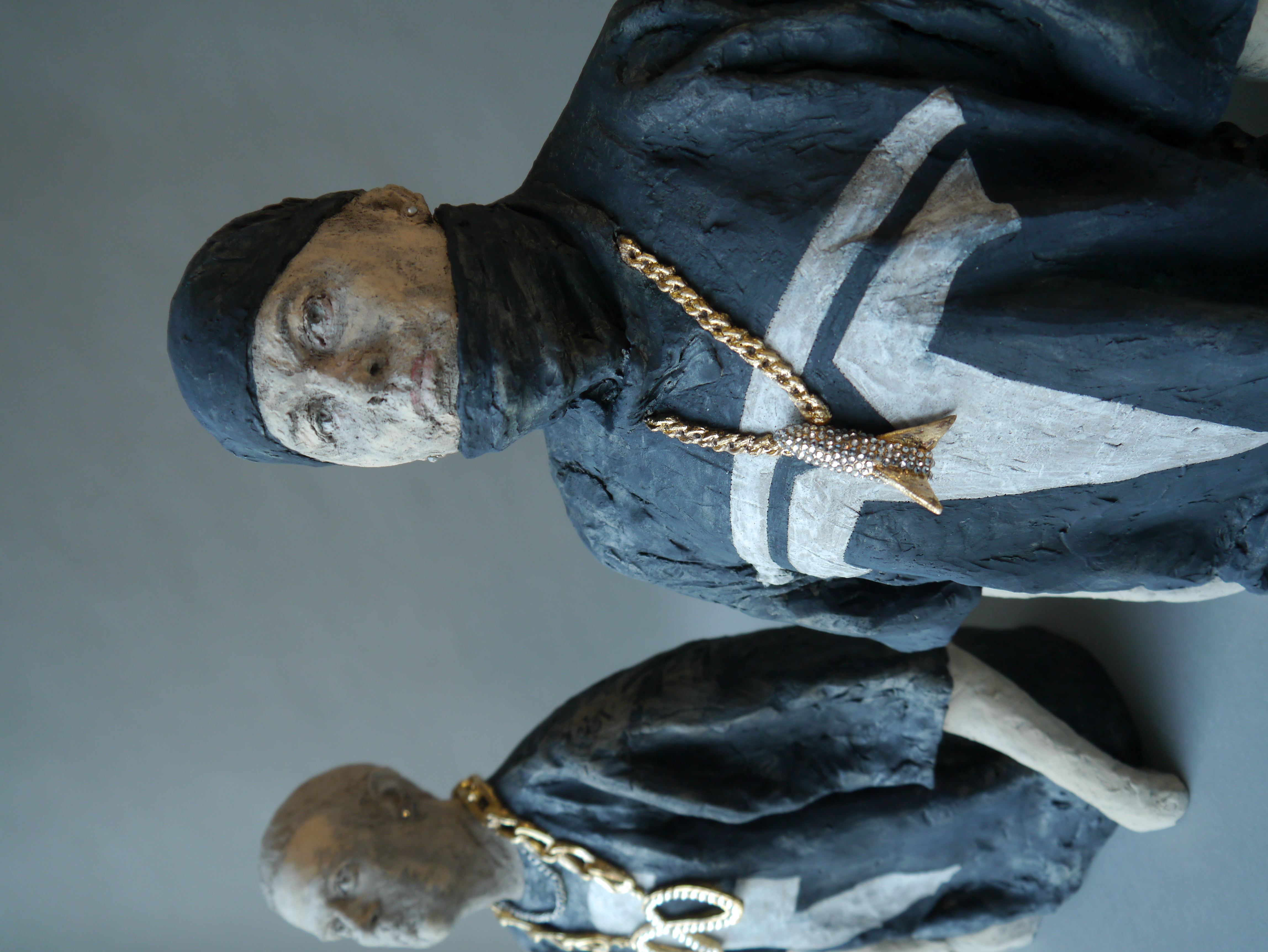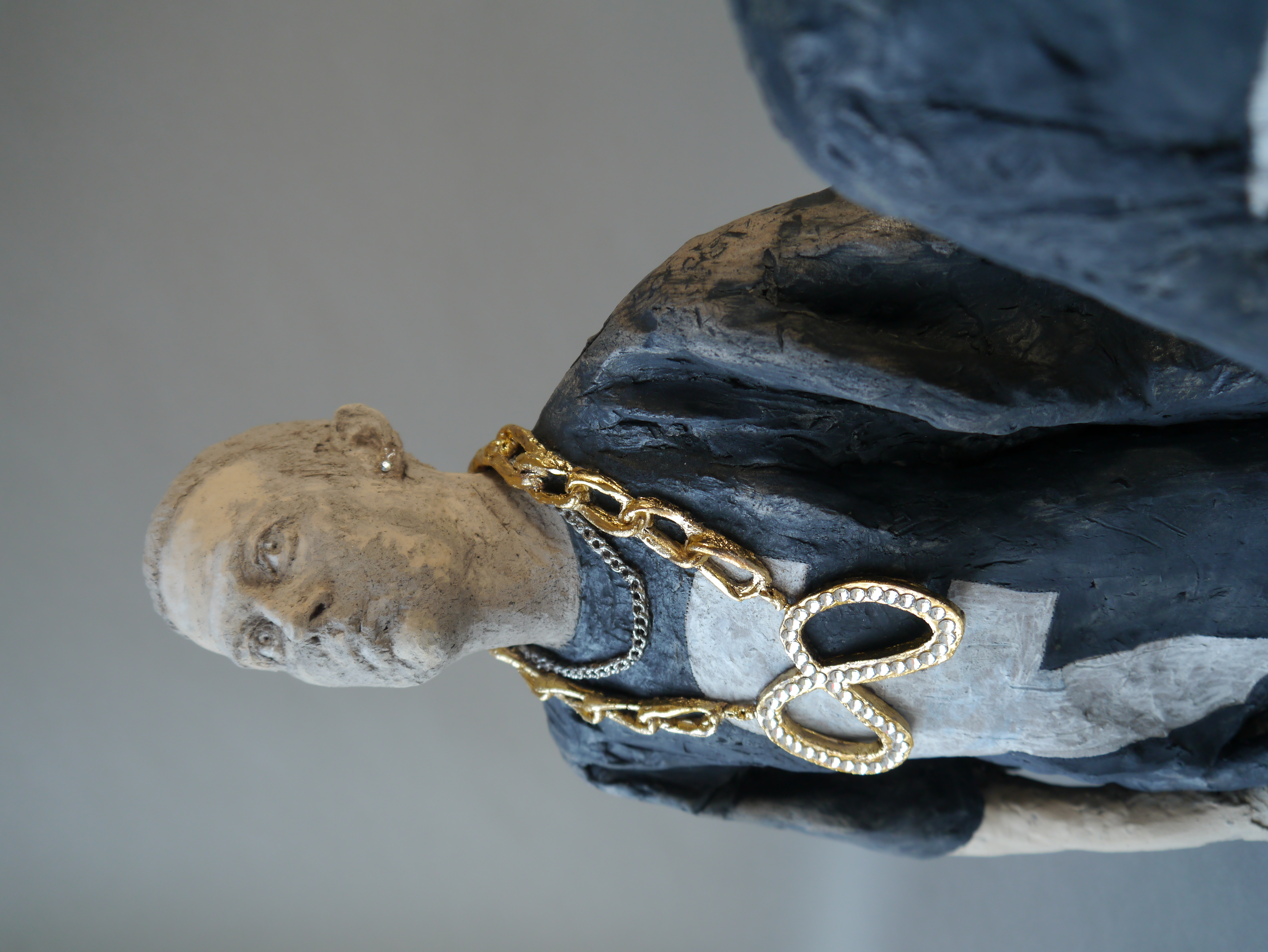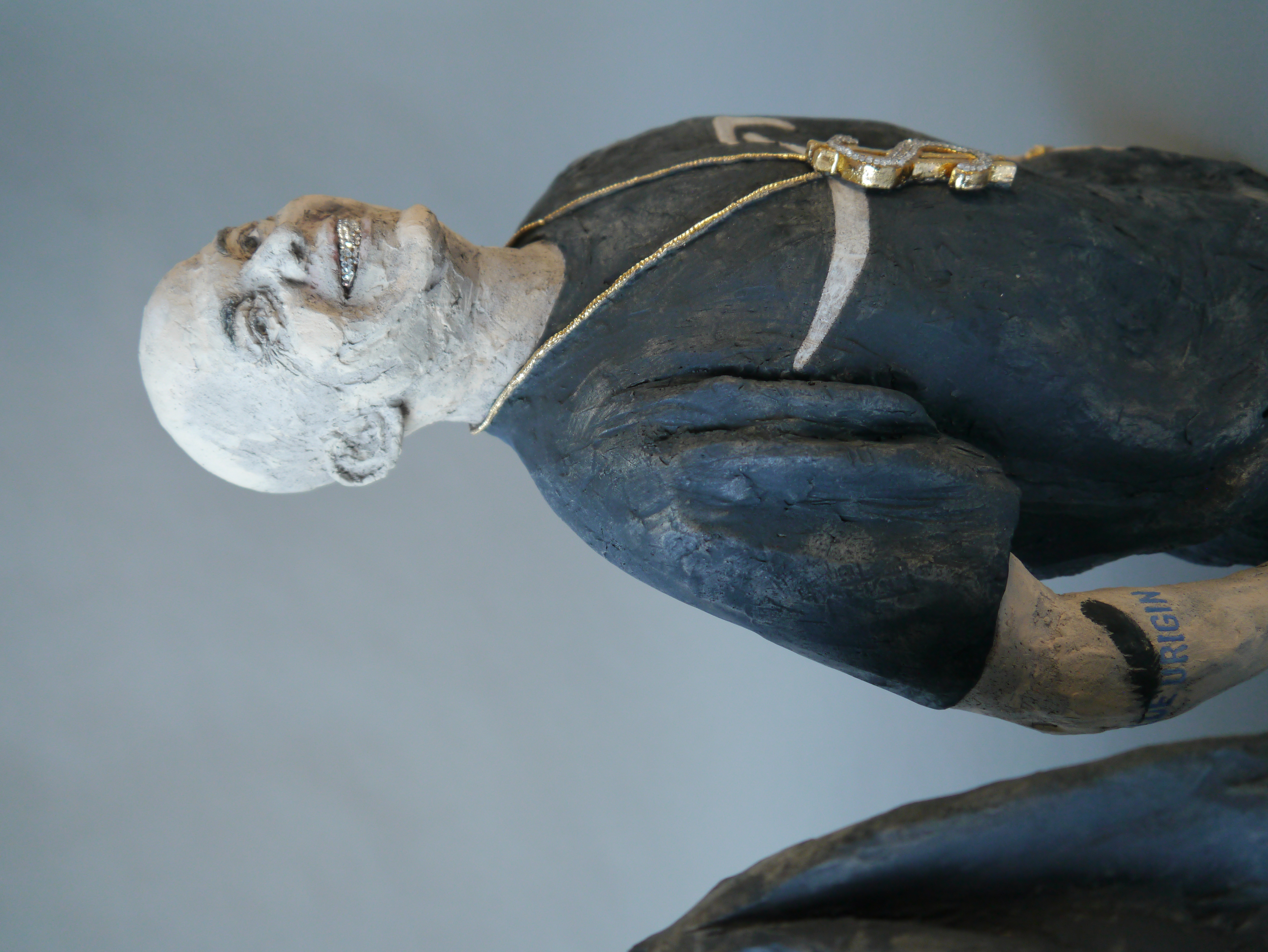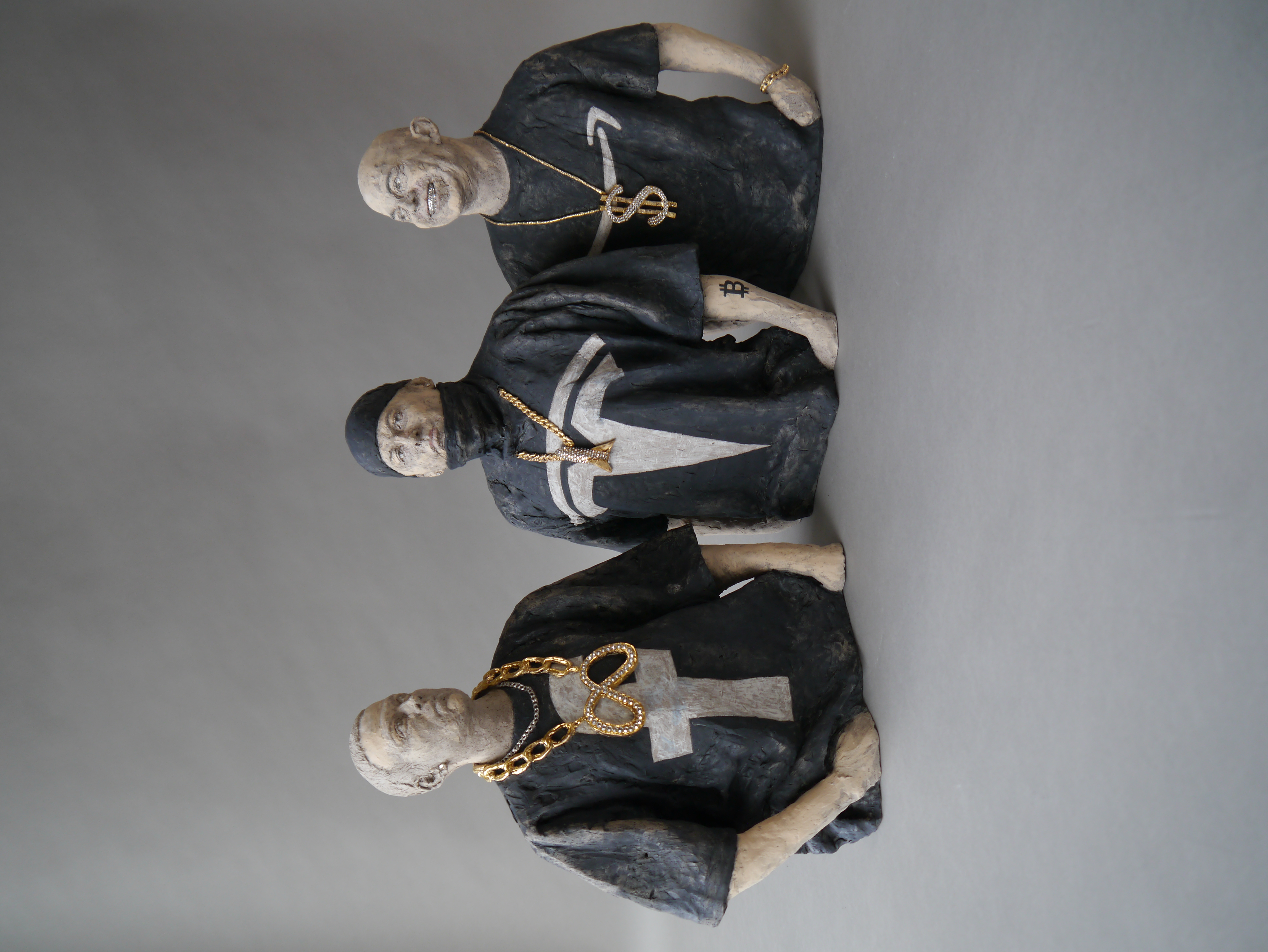 Gangsta Shit – Beg for Mercy!, 2022 Bezos: 38 x 27 x 10 cm, Musk: 39 x 28 x 11 cm, Zuckerberg: 38 x 30 x 13 cm Steinzeug, Engobe, Pigmente, Glasur, Strasssteine – Museum Carouge/ Musée de Carouge, Carouge, Schweiz