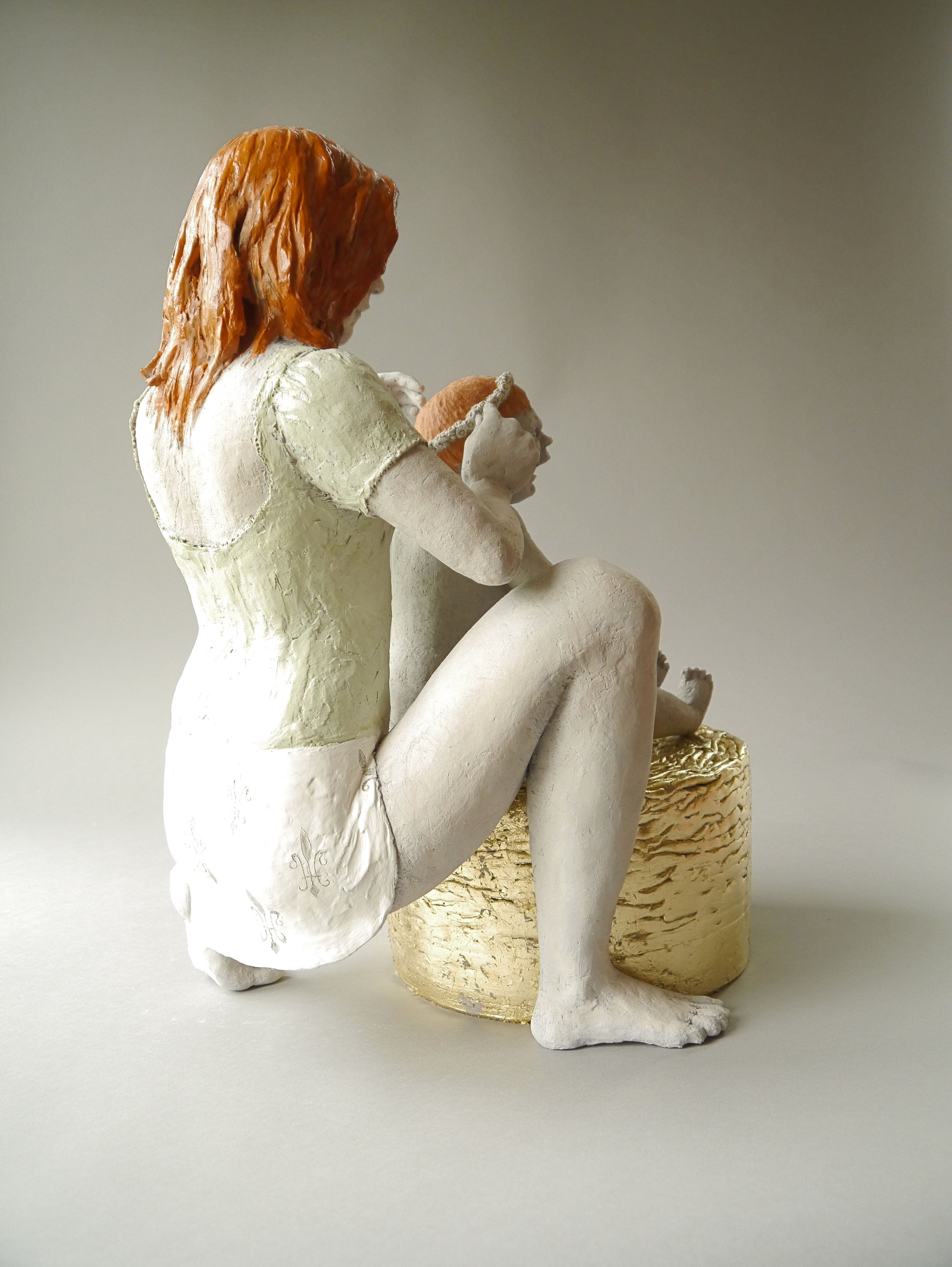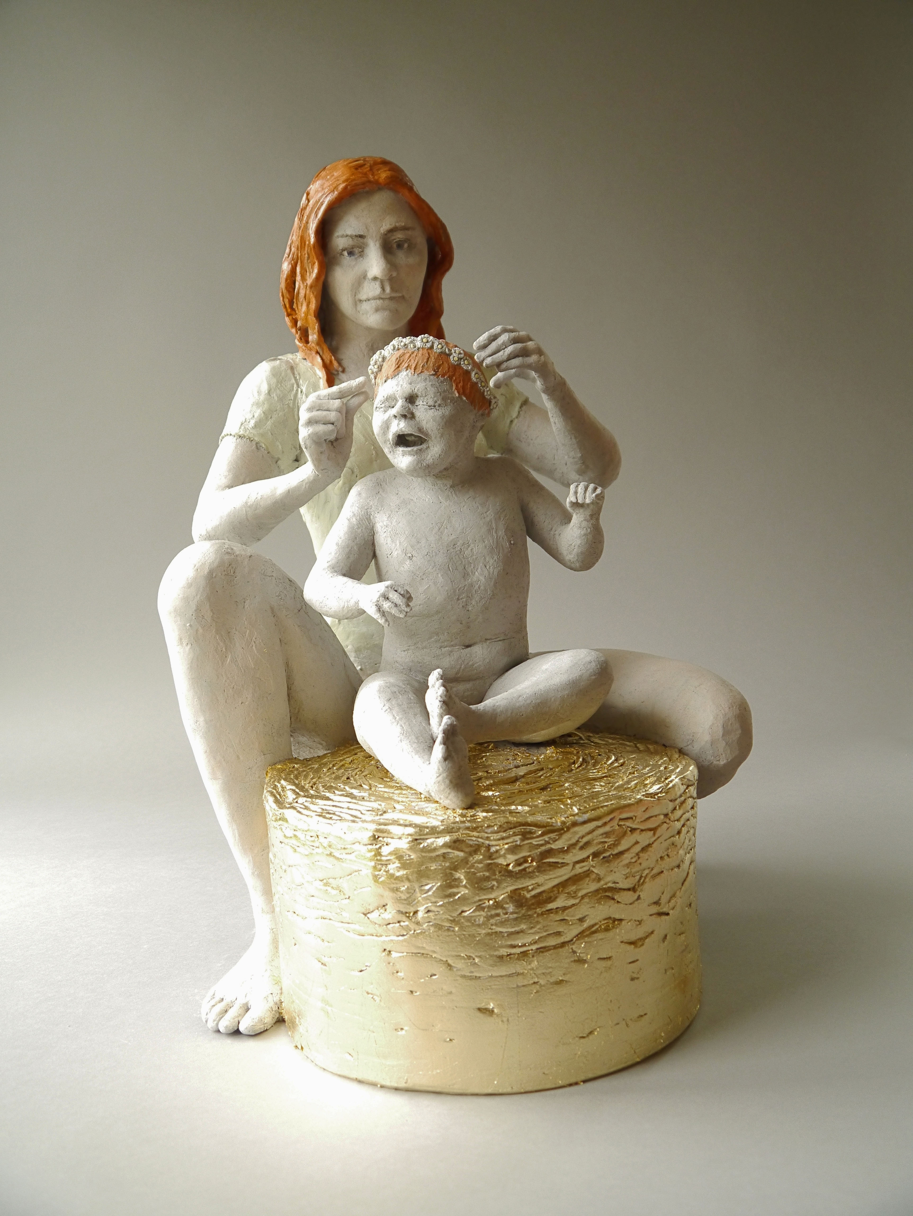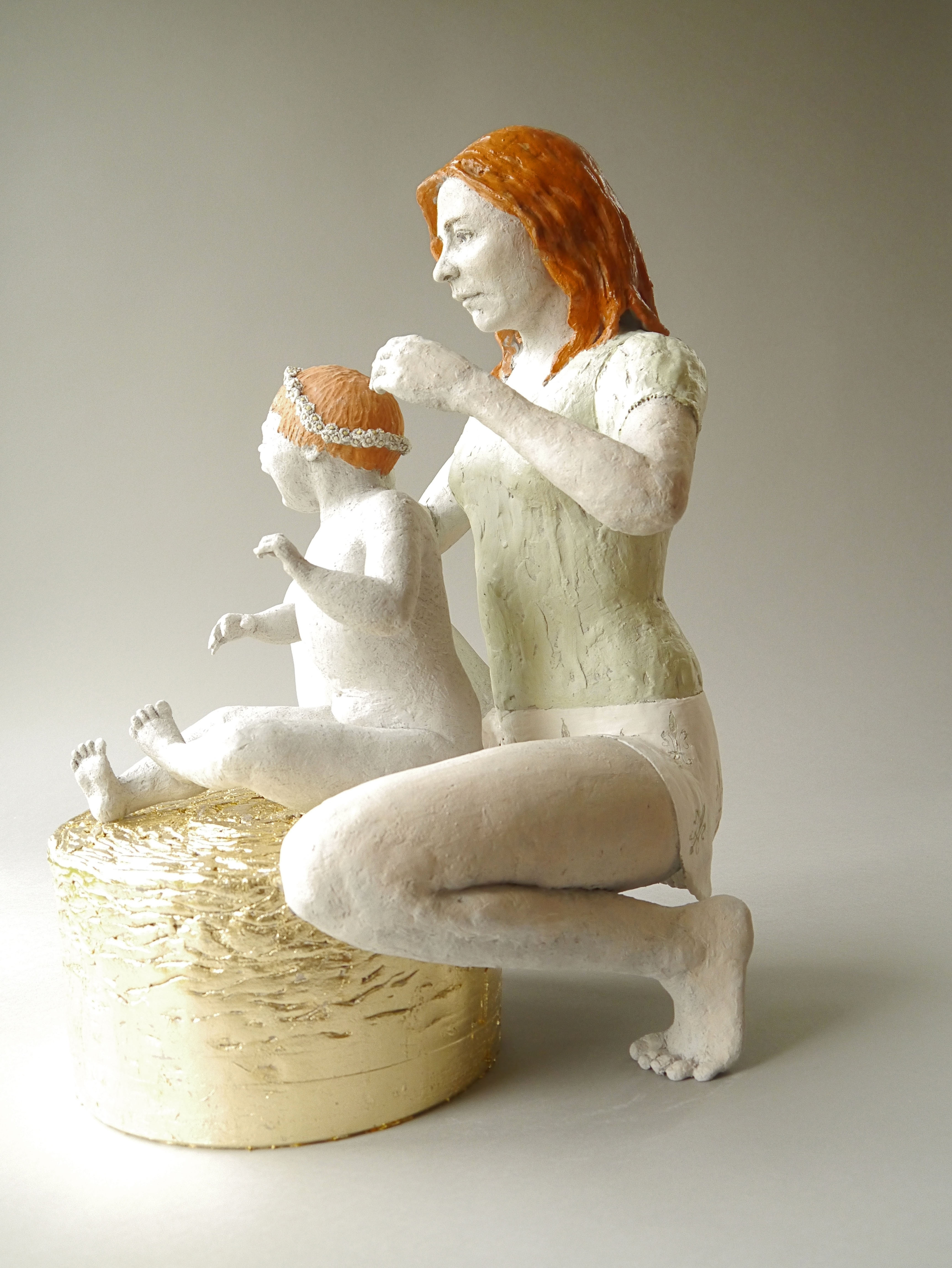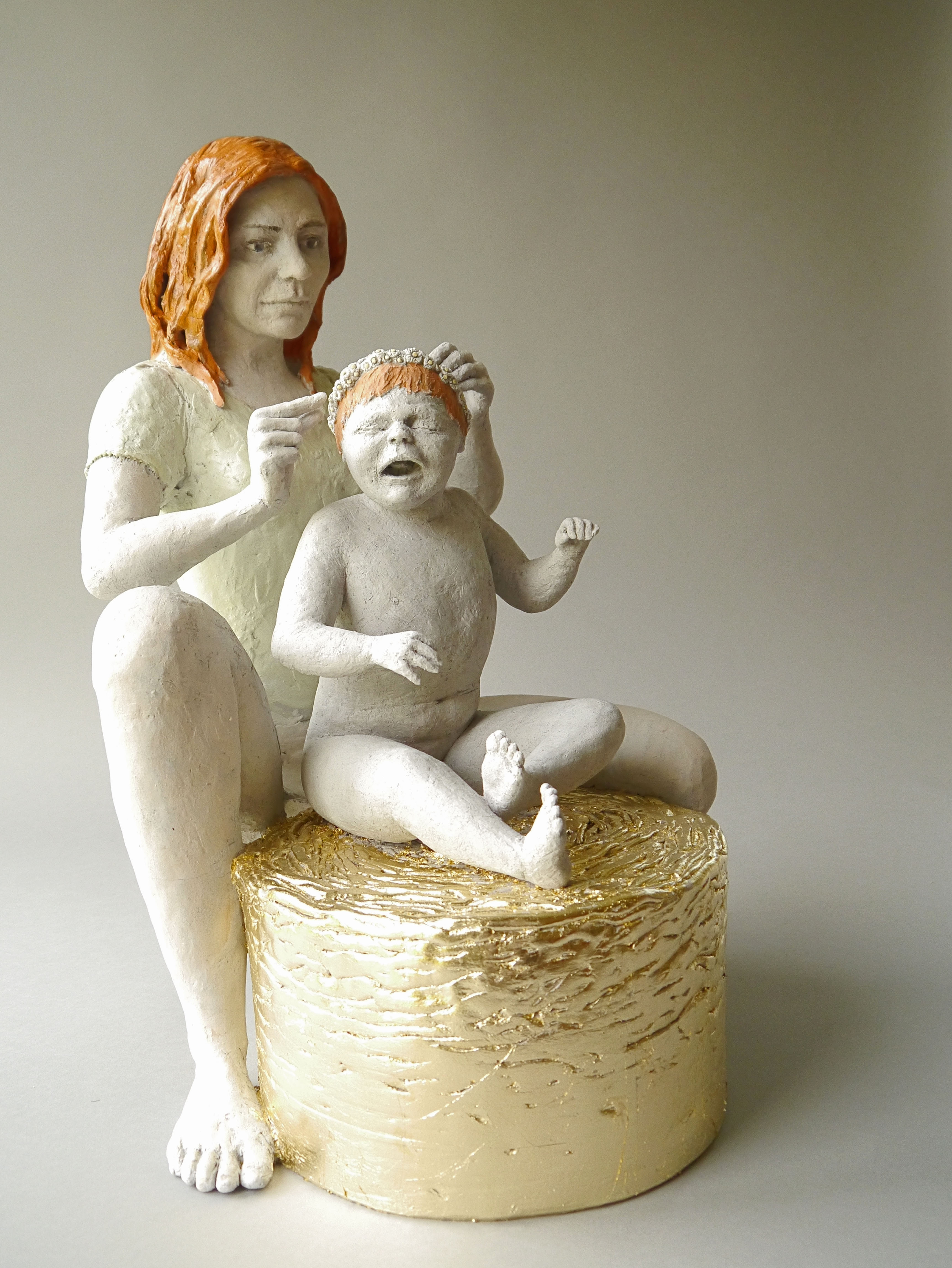 Mädchen mit Blumenkranz, 2014 35 x 40 x 55 cm Steinzeug, Porzellanengobe, Kupferoxid, Pigmente, Schellack, Schlagmetall, Bienenwachs