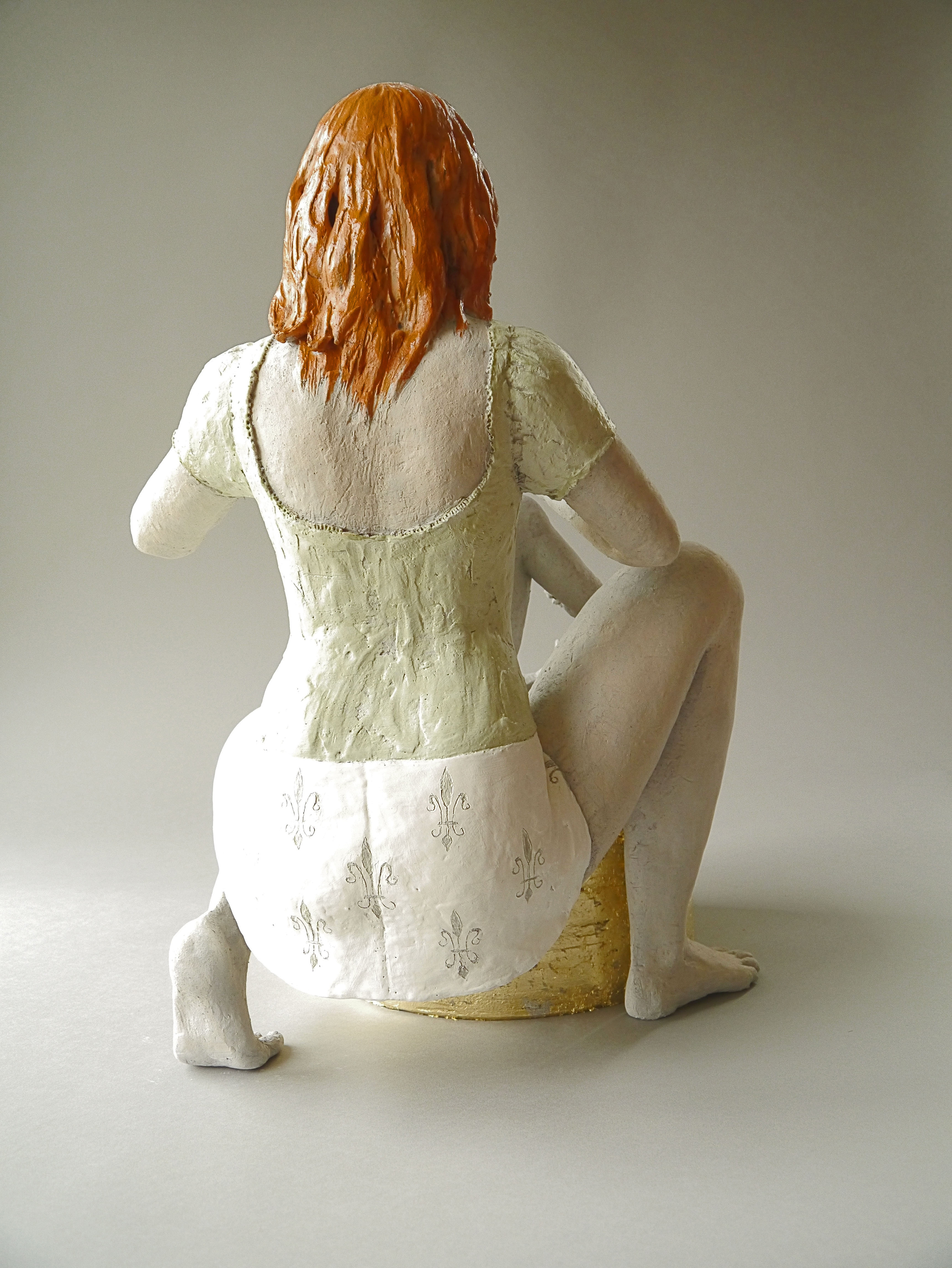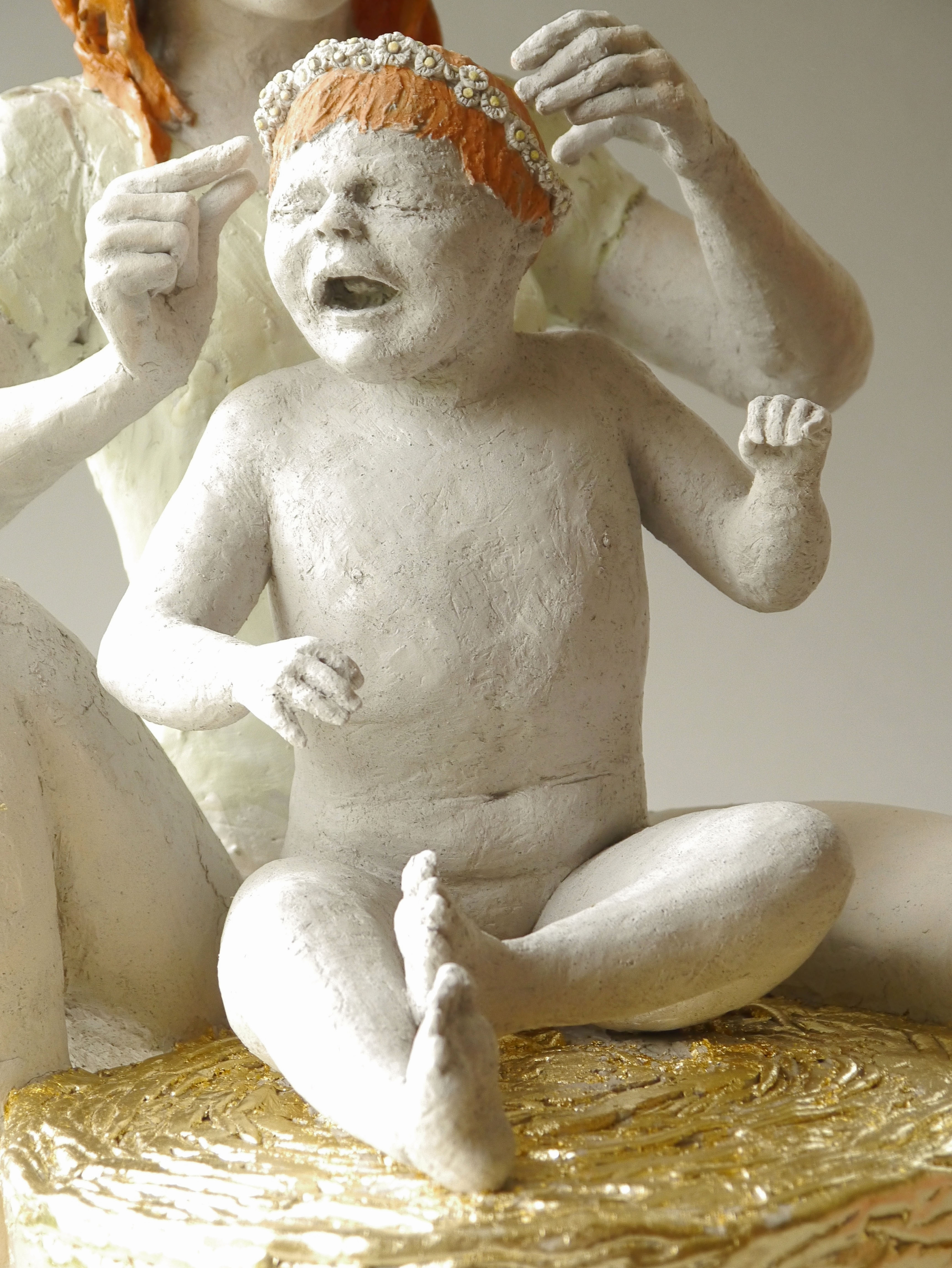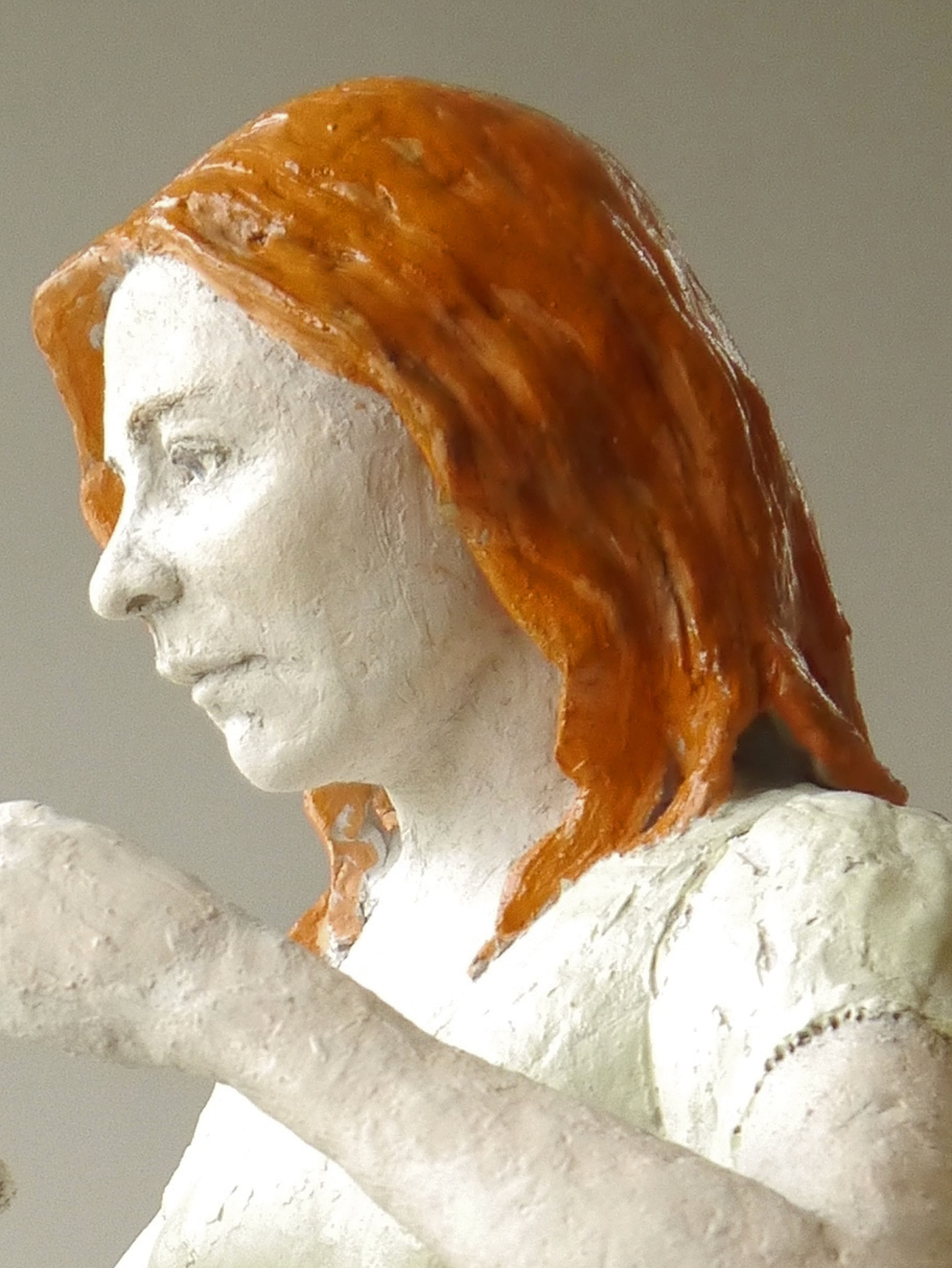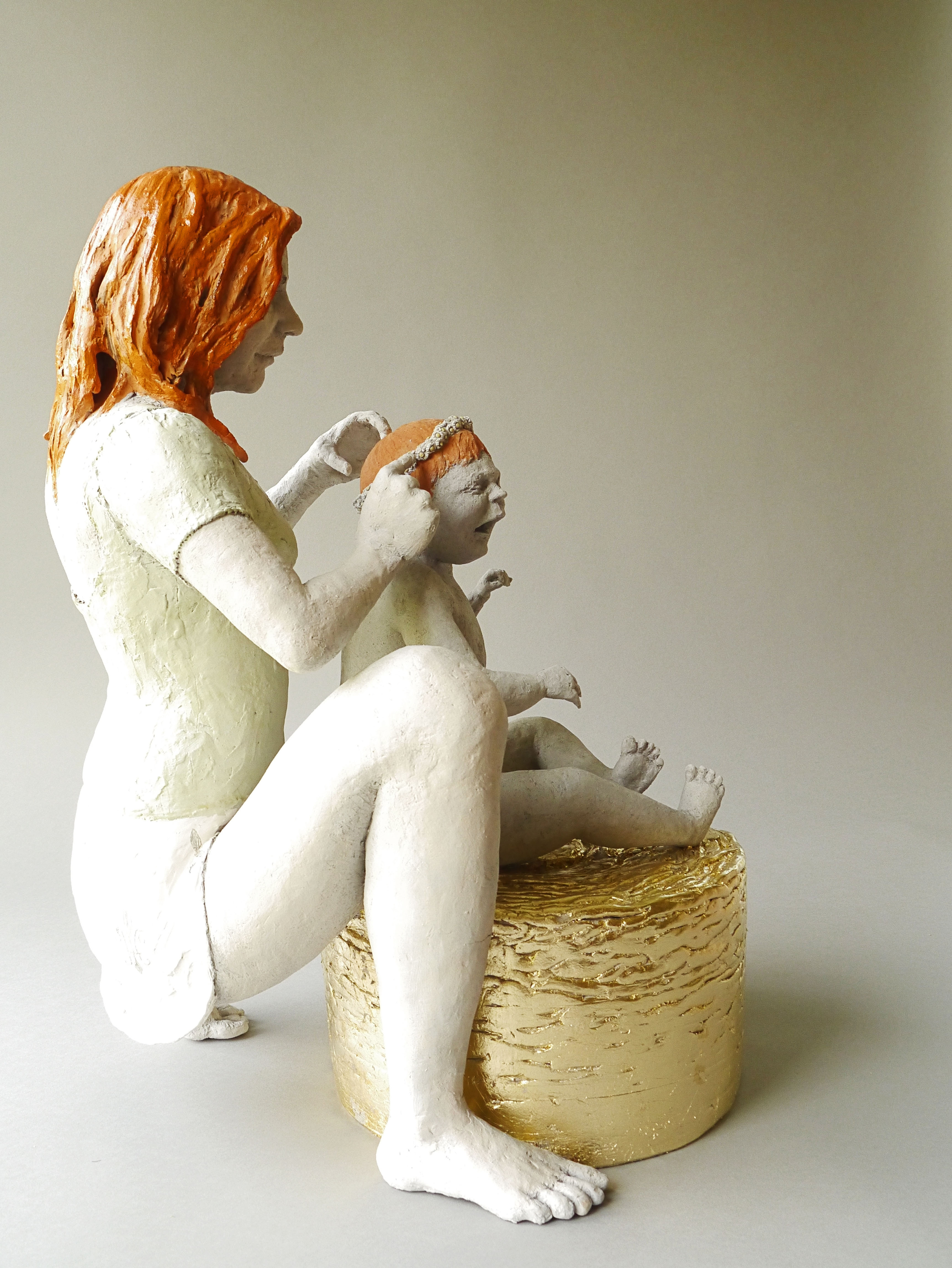 Mädchen mit Blumenkranz, 2014 35 x 40 x 55 cm Steinzeug, Porzellanengobe, Kupferoxid, Pigmente, Schellack, Schlagmetall, Bienenwachs