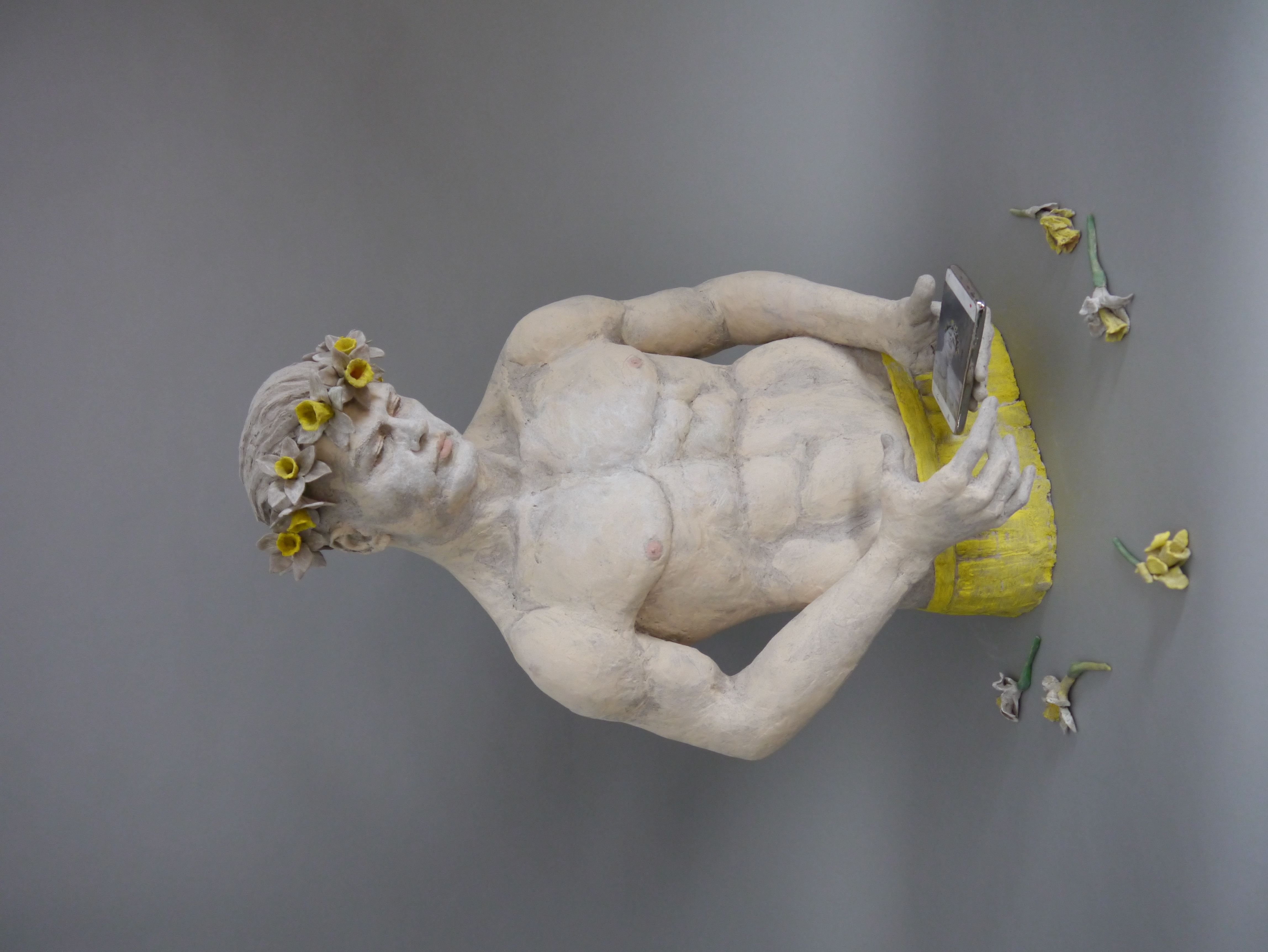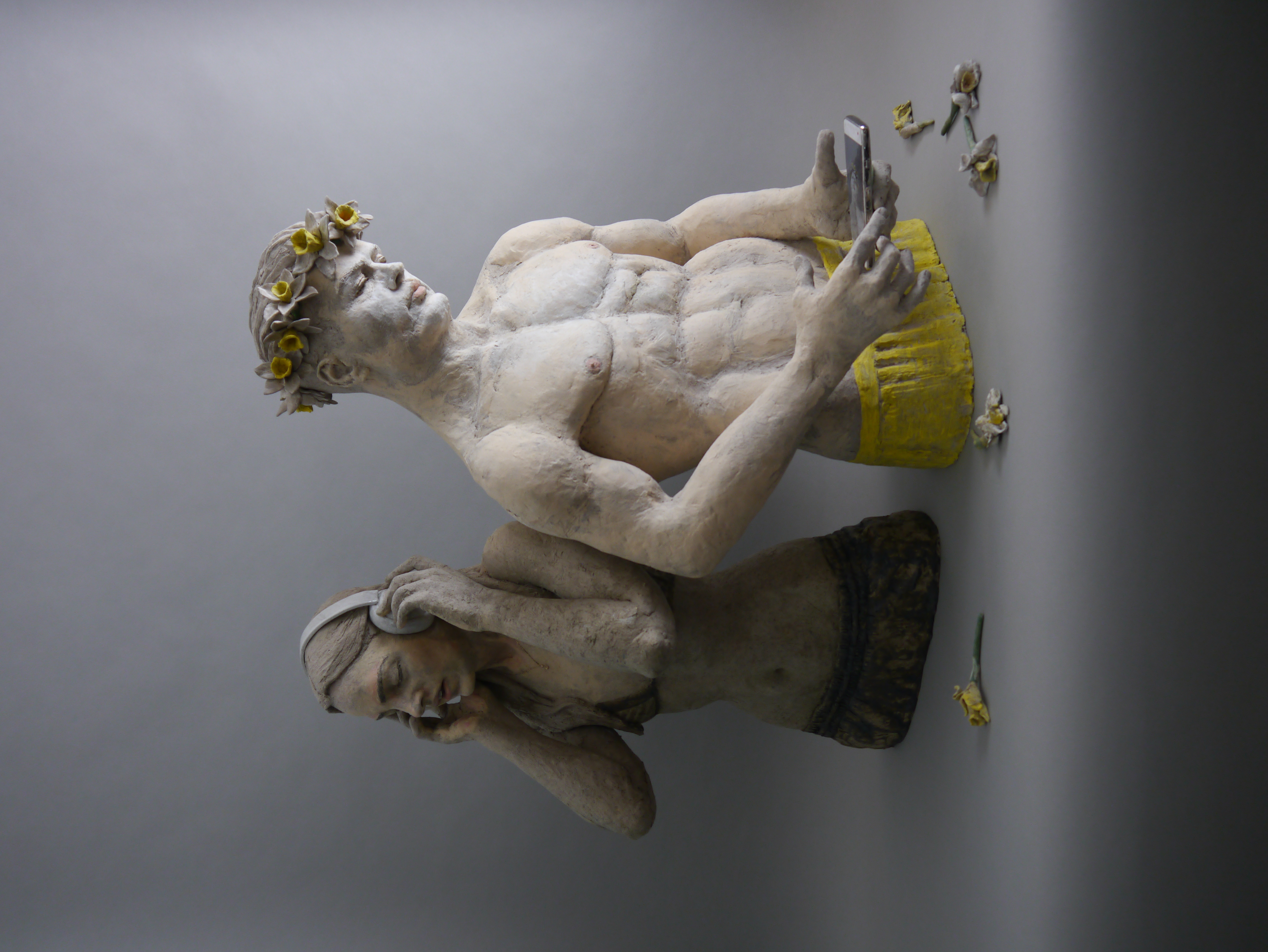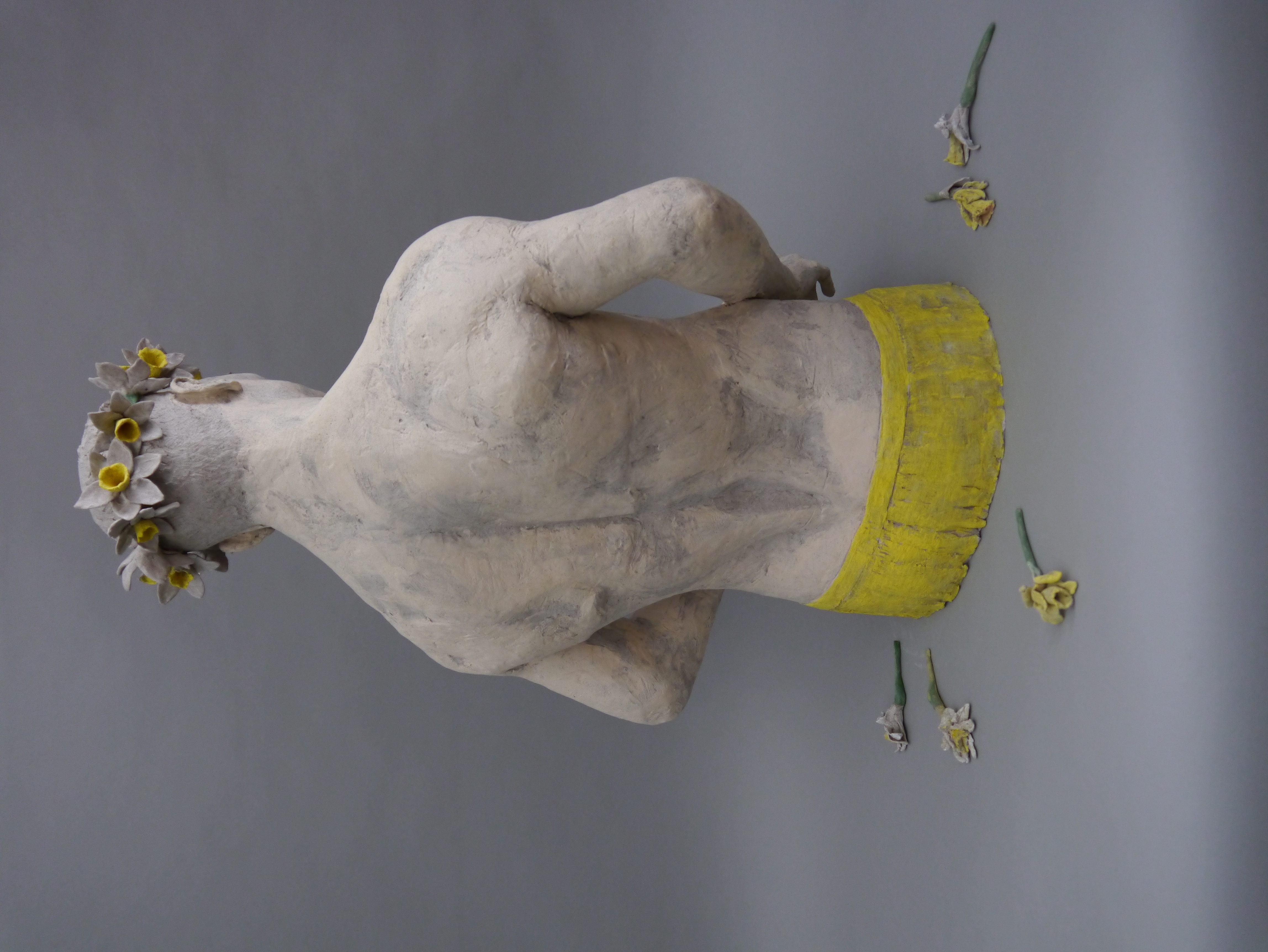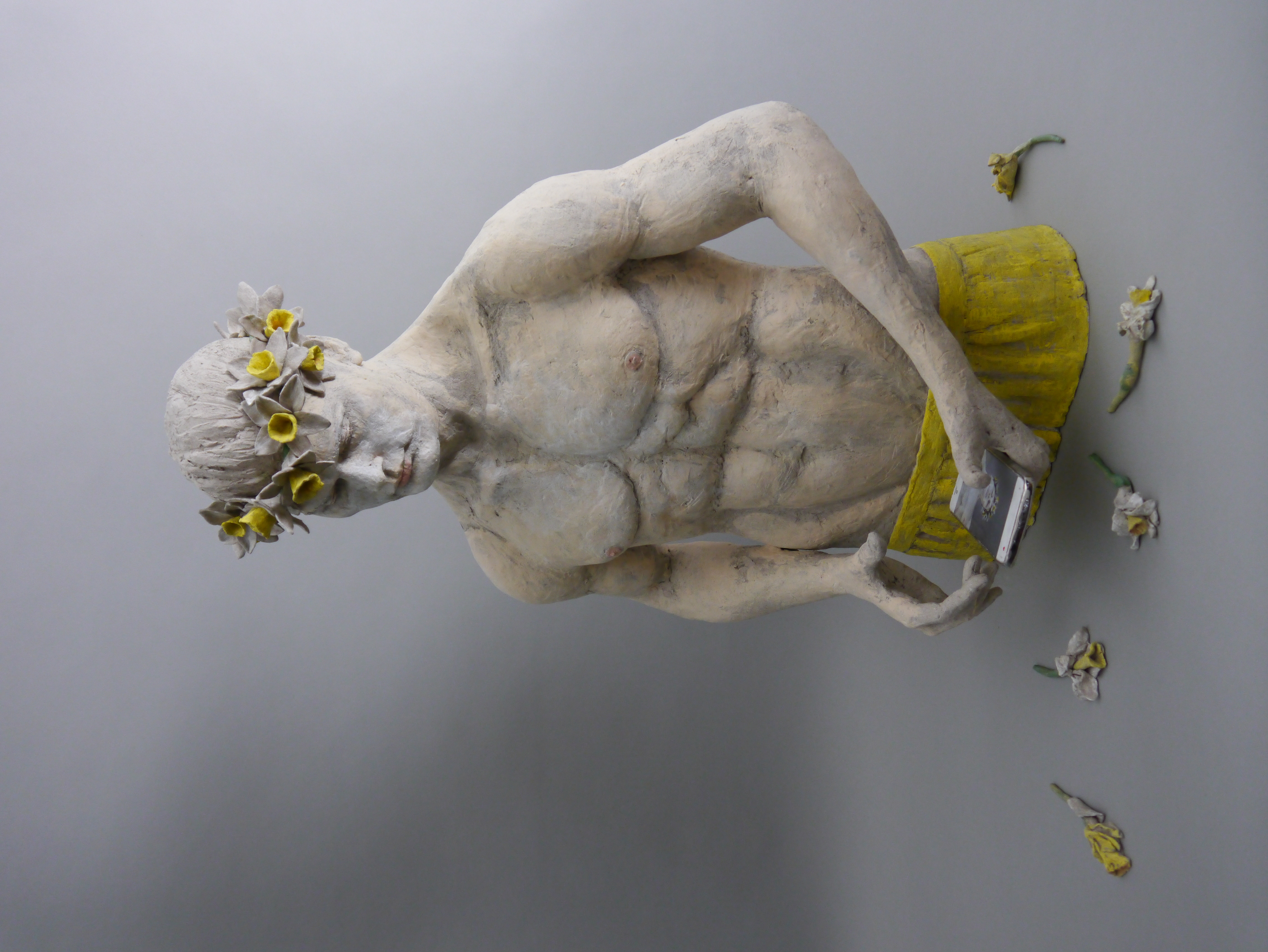 Narziss, 2020 Figur: 48 x 68 x 30 cm, Blumen (5 St.) ca. 11 x 5 x 3cm Steinzeug, Engobe, Glasur, Keramikdecal, Glanzgold