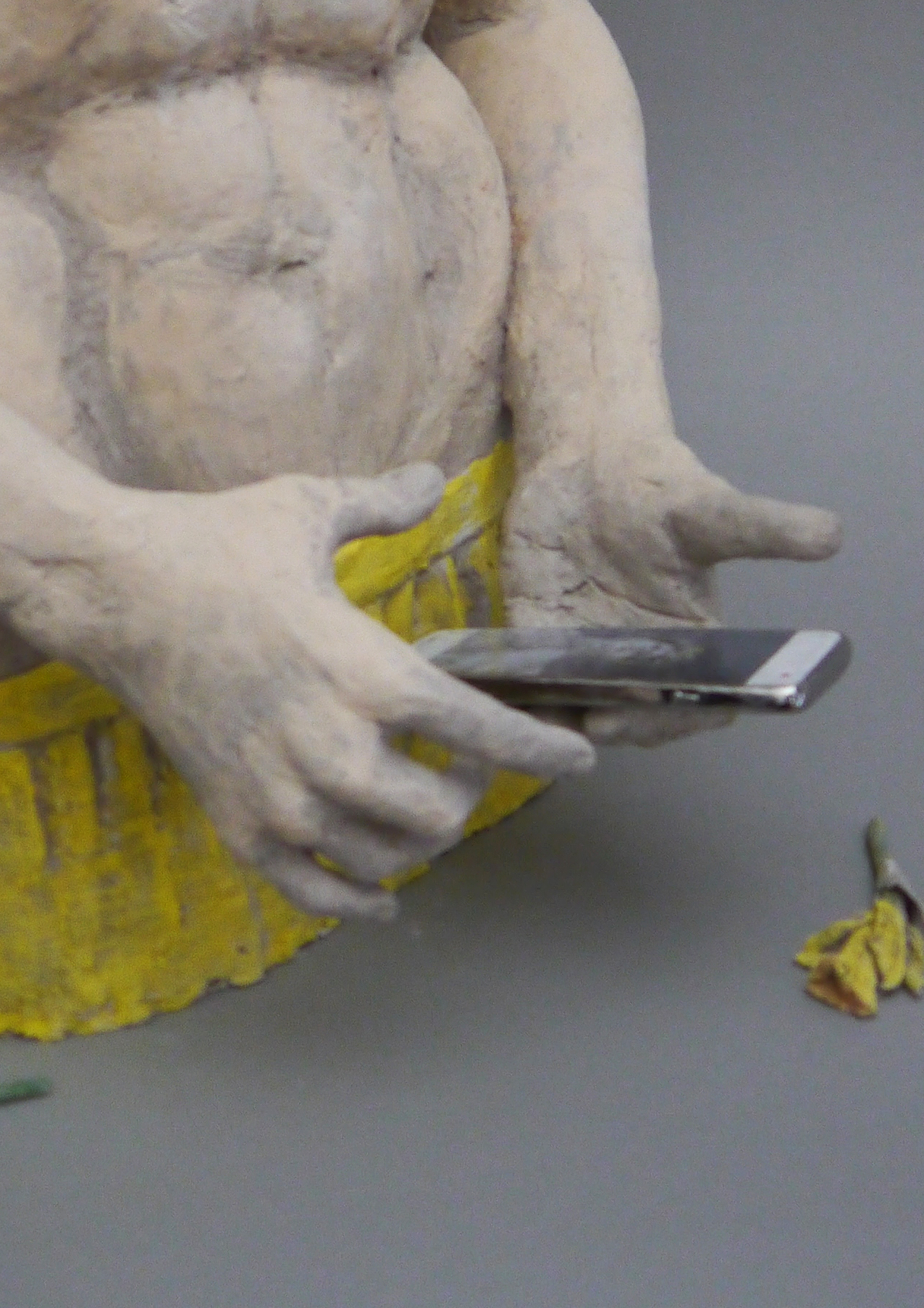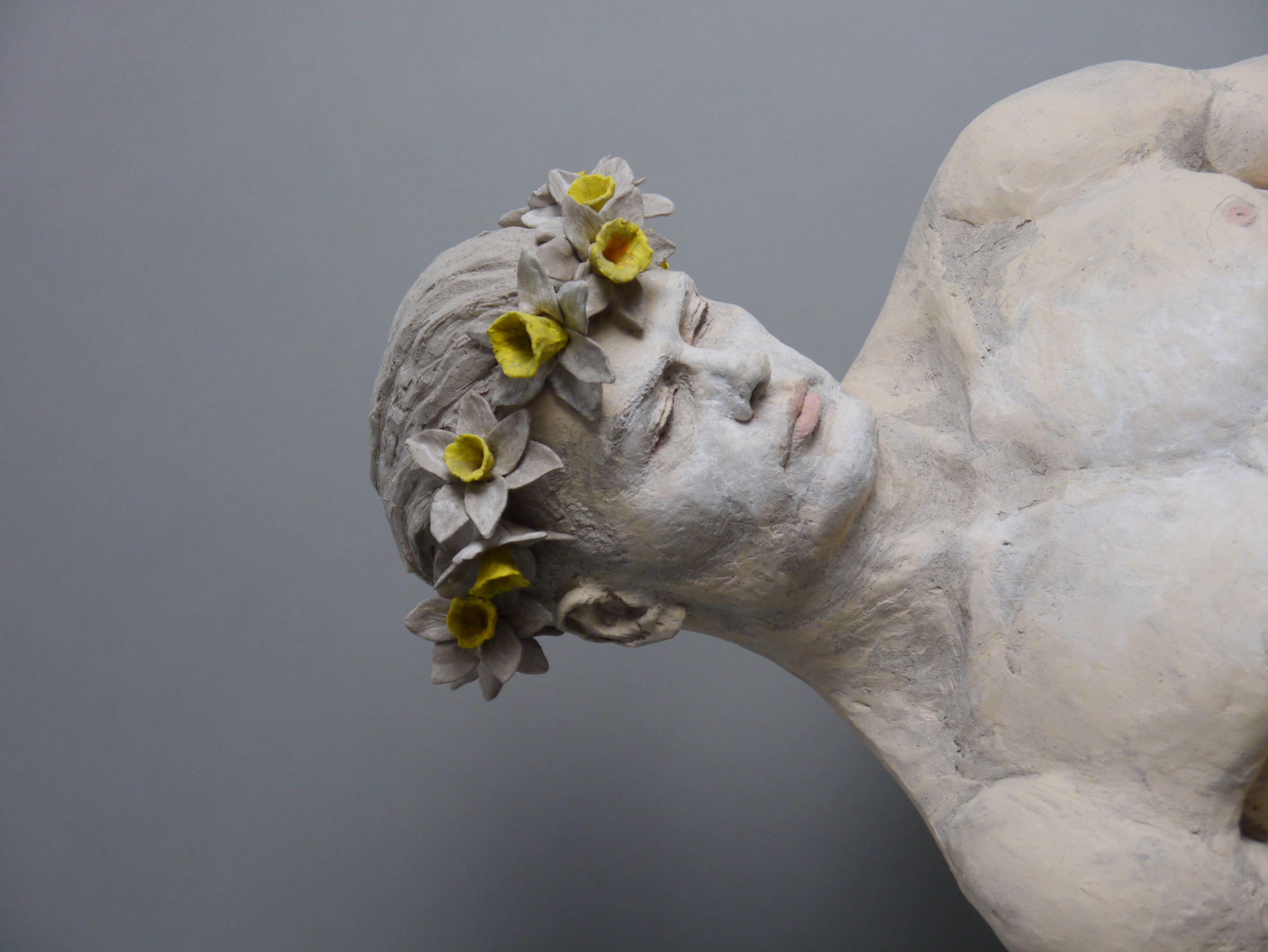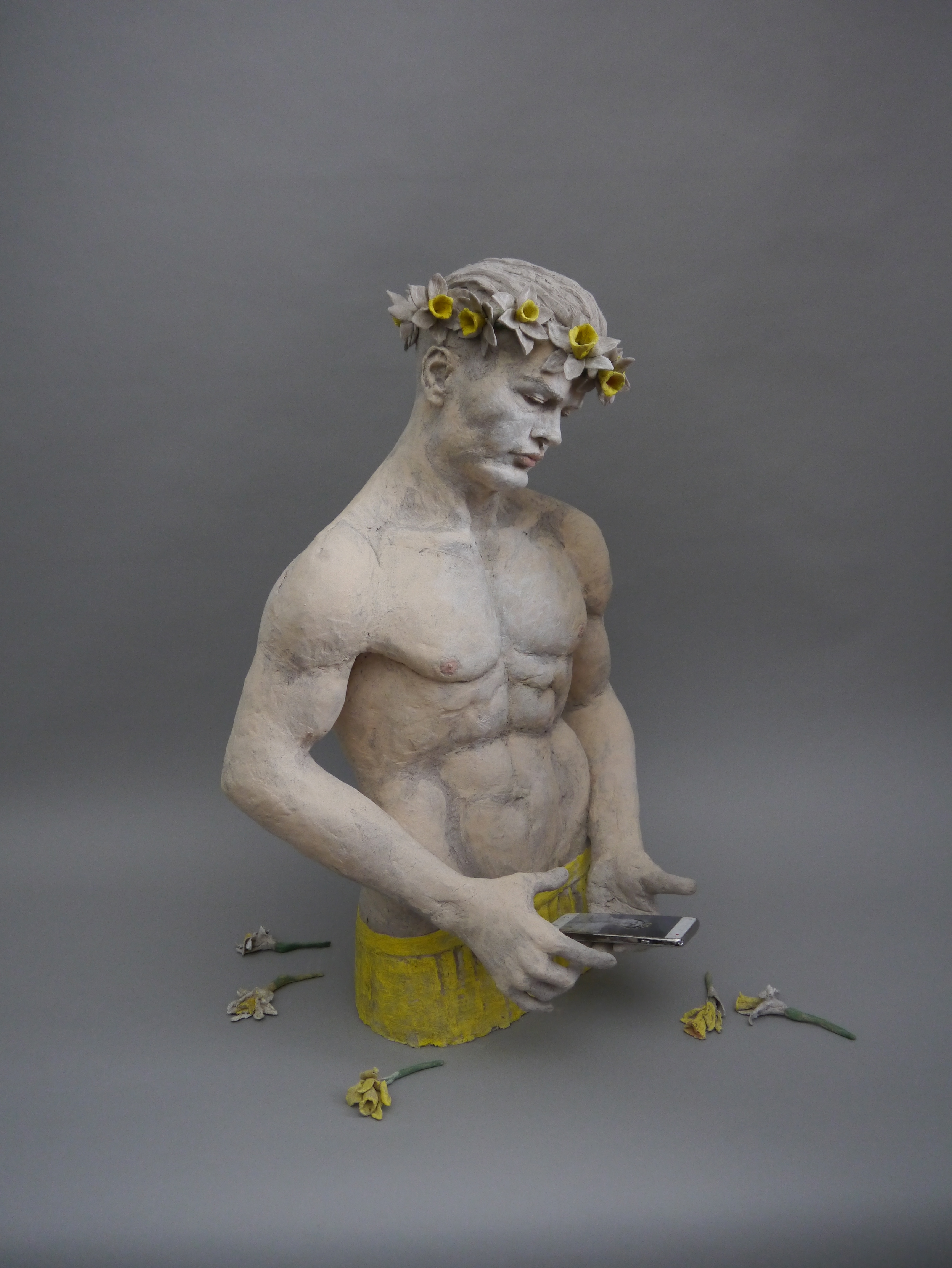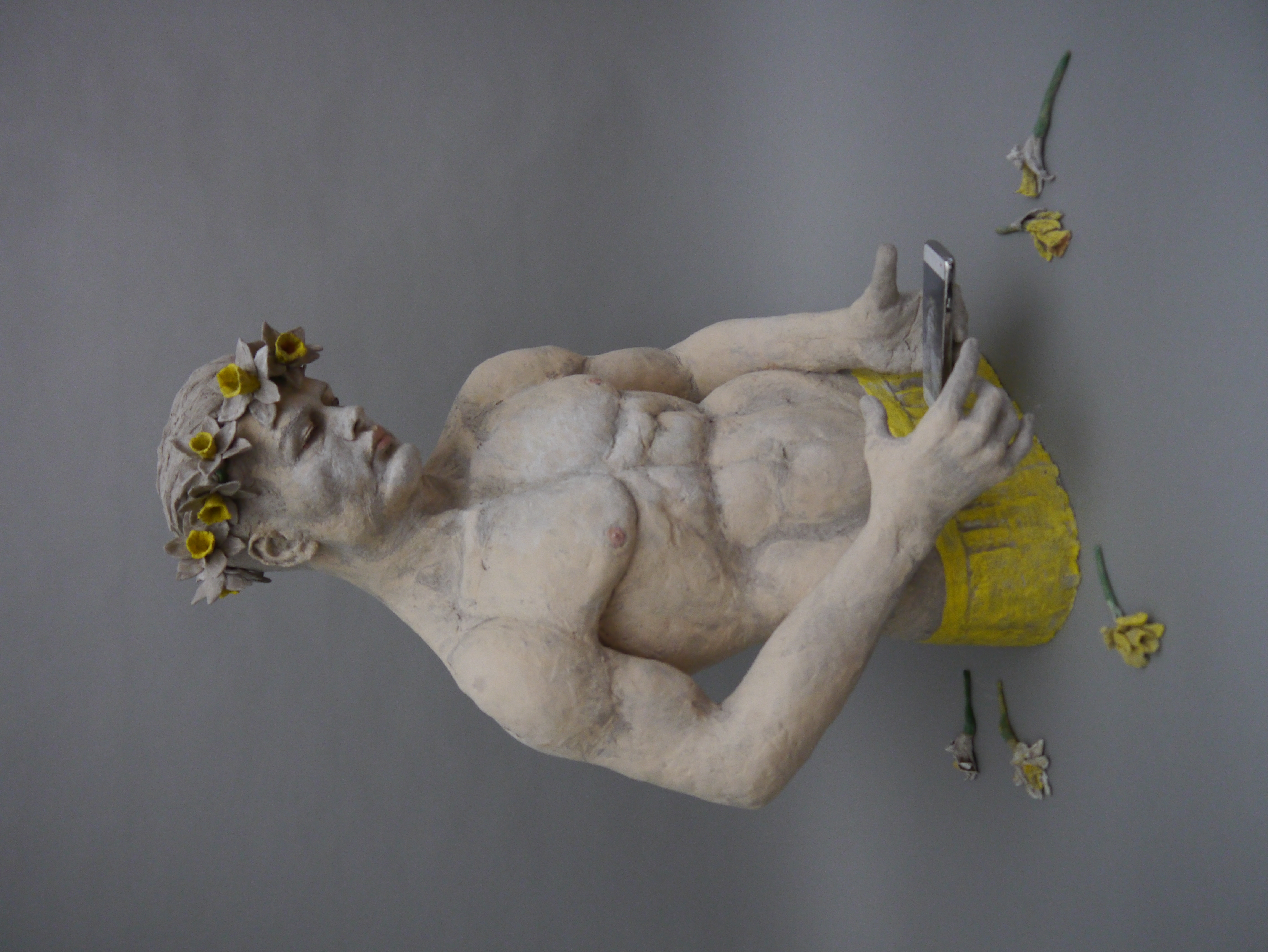 Narziss, 2020 Figur: 48 x 68 x 30 cm, Blumen (5 St.) ca. 11 x 5 x 3cm Steinzeug, Engobe, Glasur, Keramikdecal, Glanzgold