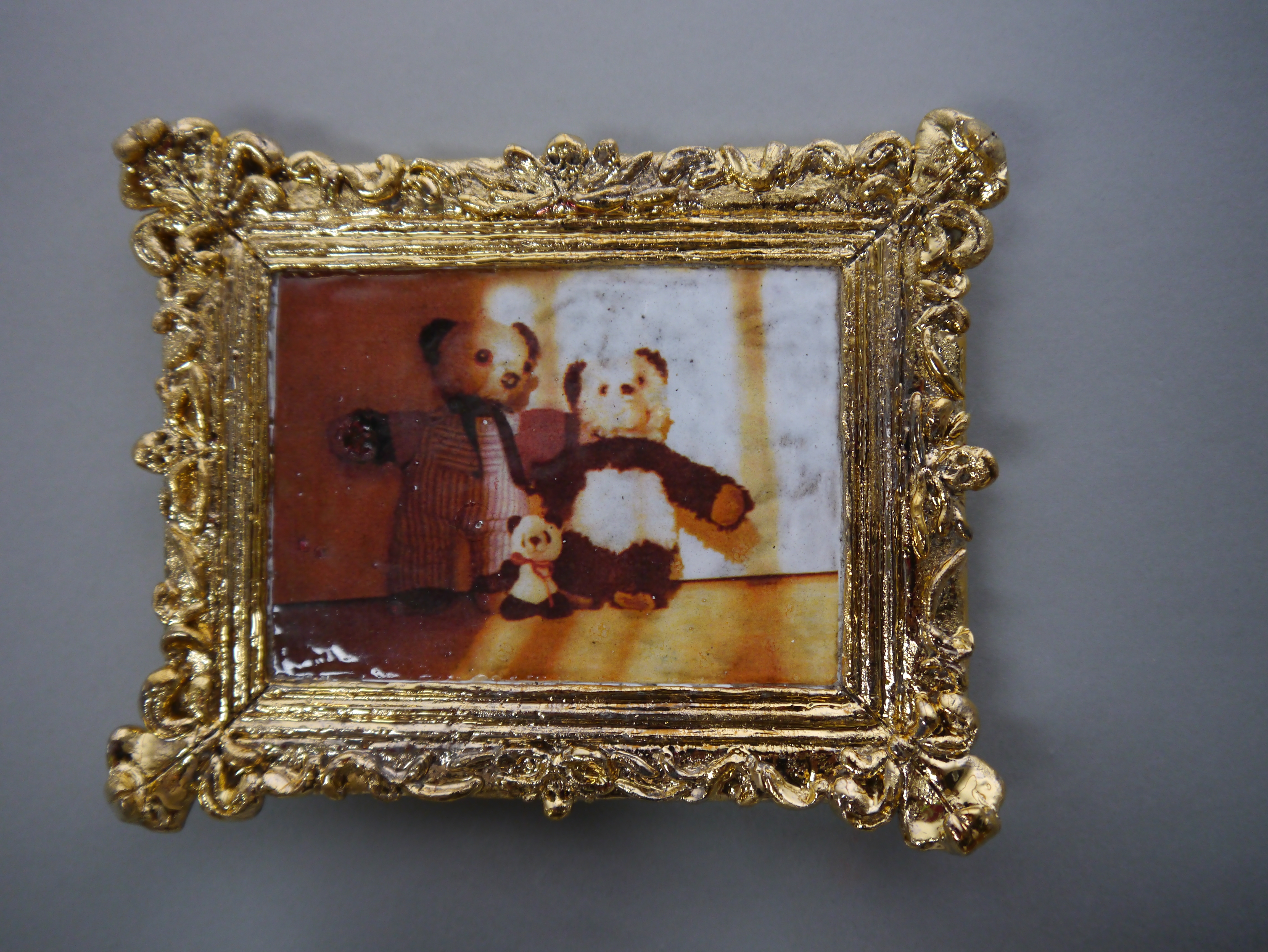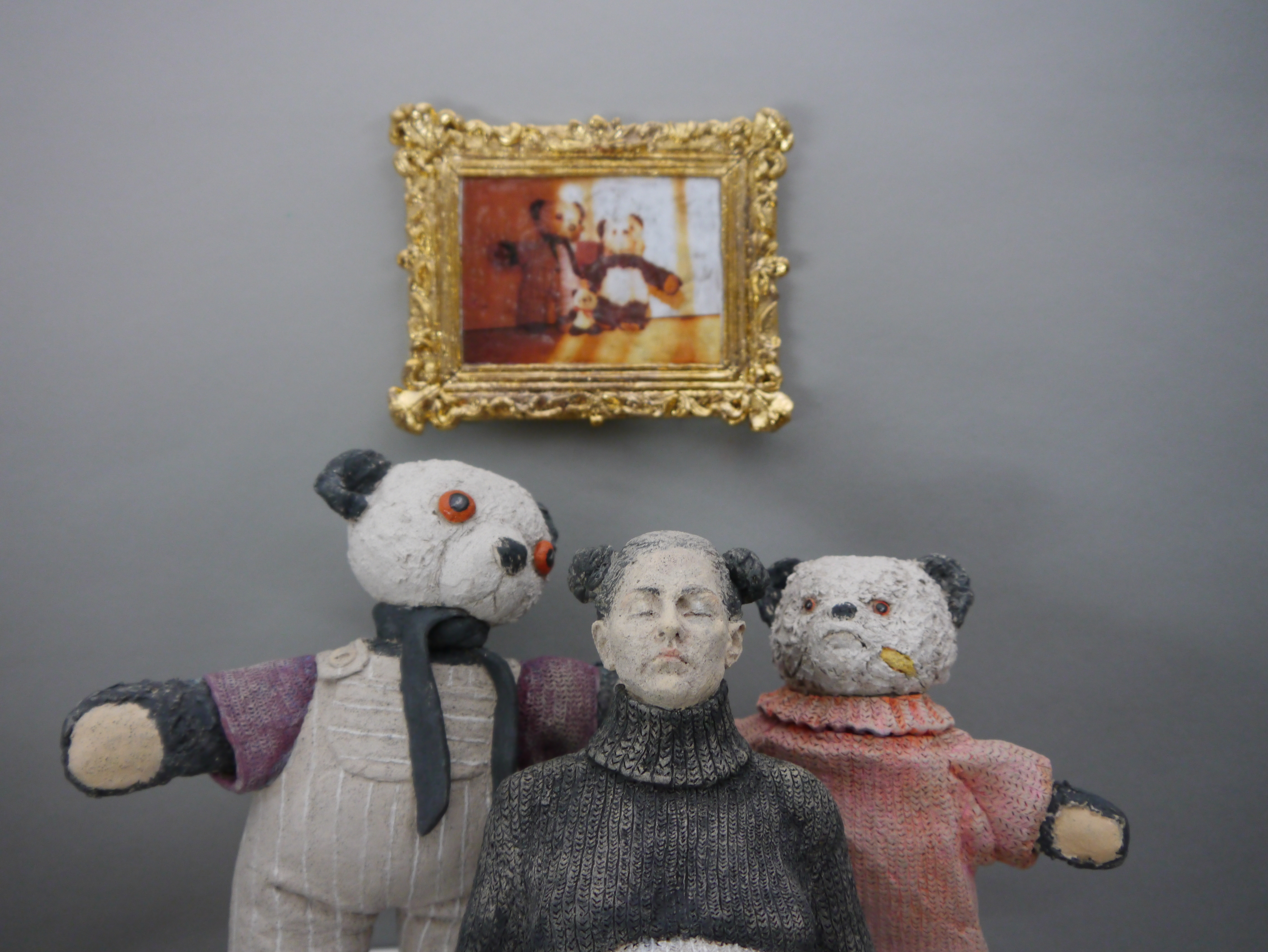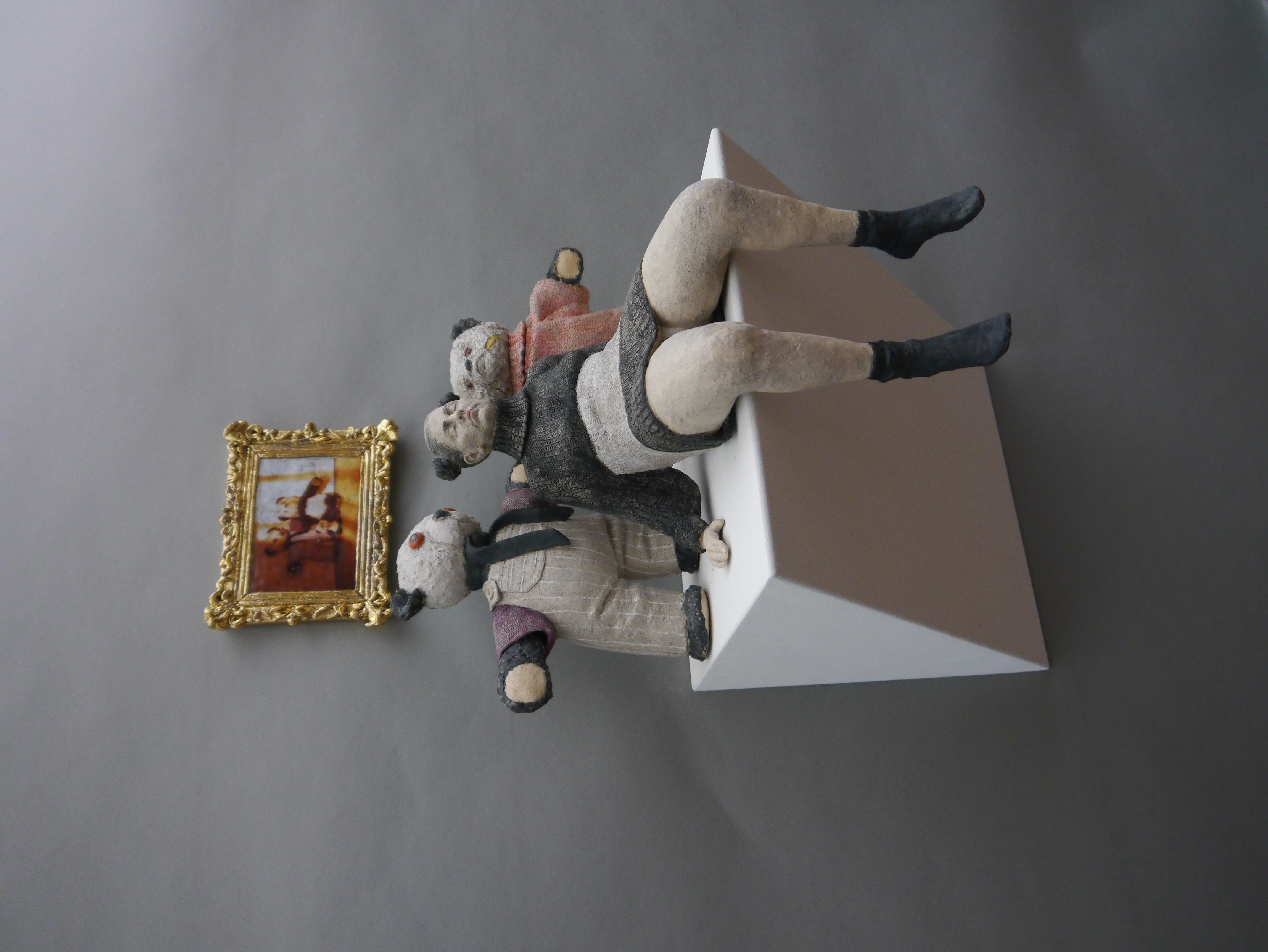 25 x 54 x 25 cm Bilderrahmen: 14,5 x 12 x 2 cm Bär, links: 18 x 18,5 x 7 cm Frau in Pullover: 21 x 16 x 19 cm Bär, rechts: 15 x15,5 x 6 cm Wandsockel: 25 x 36 x 25