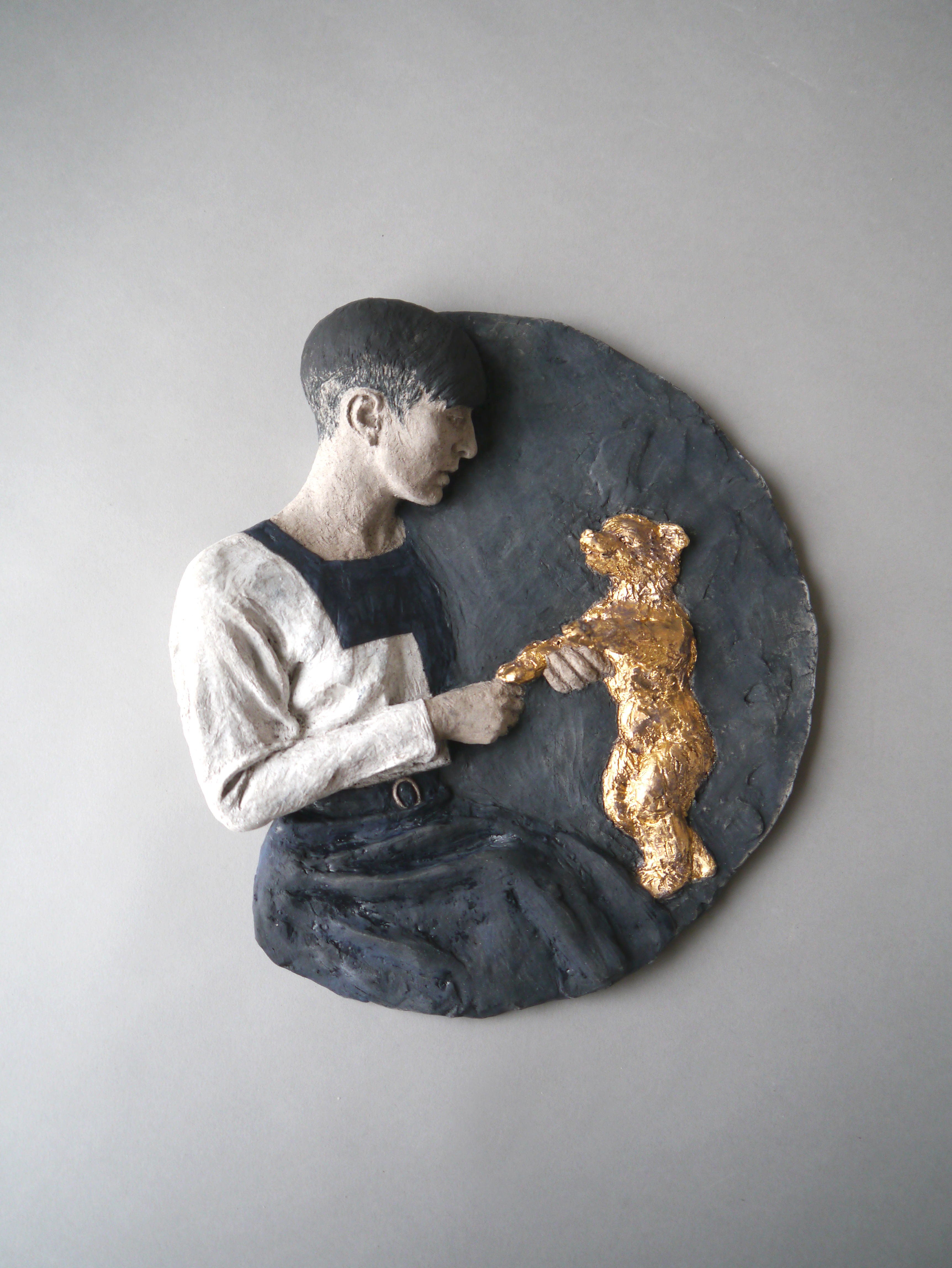 Renée Sintensis, 2022 29 x 27 x 5 cm Steinzeug, Engobe, Pigmente, Glasur, Glanzgold Wandobjekt