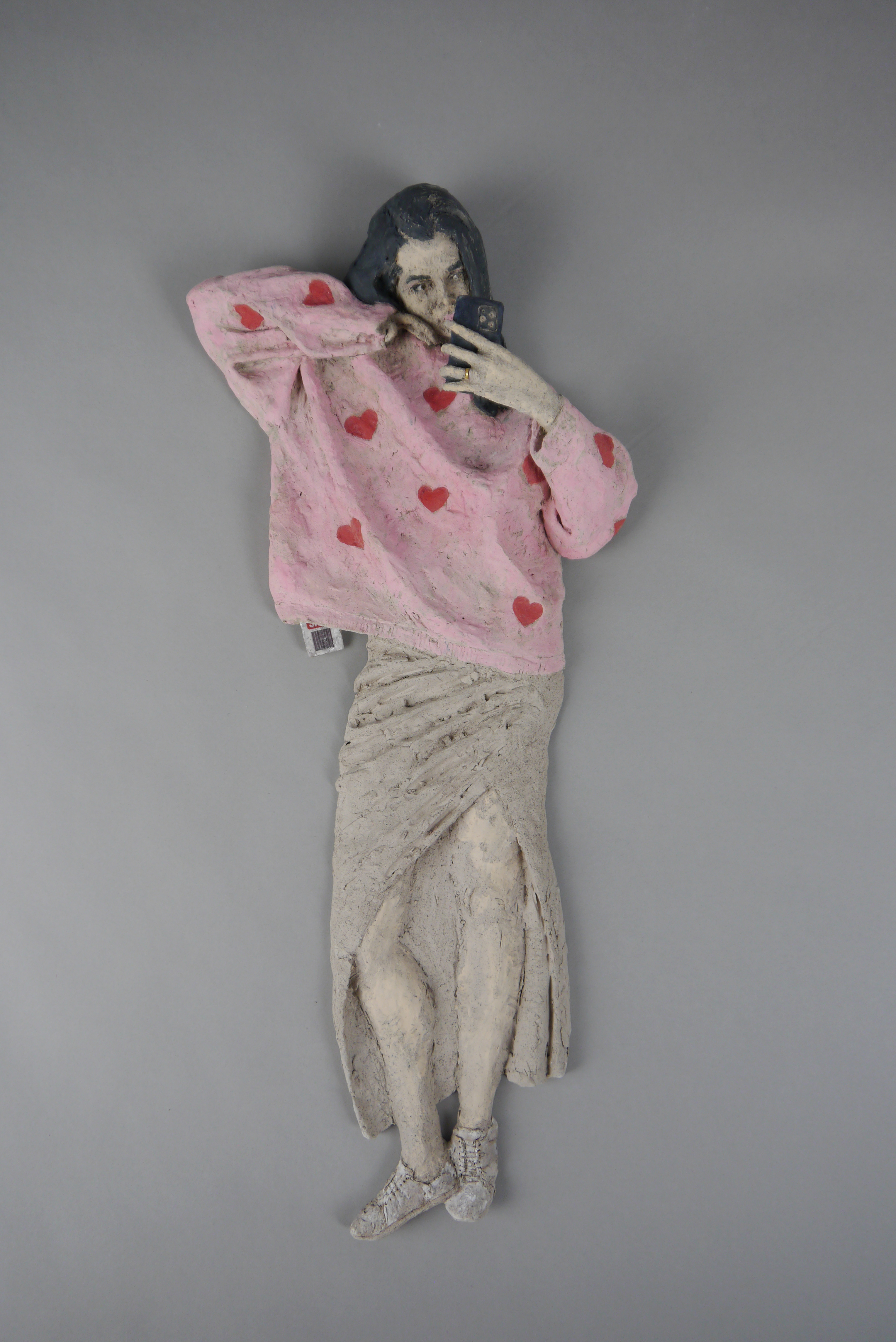 Shopping, 2024 54 x 23 x 7 cm Steinzeug, Pigmente, Glasur, Keramikdecals, Glanzgold Wandobjekt