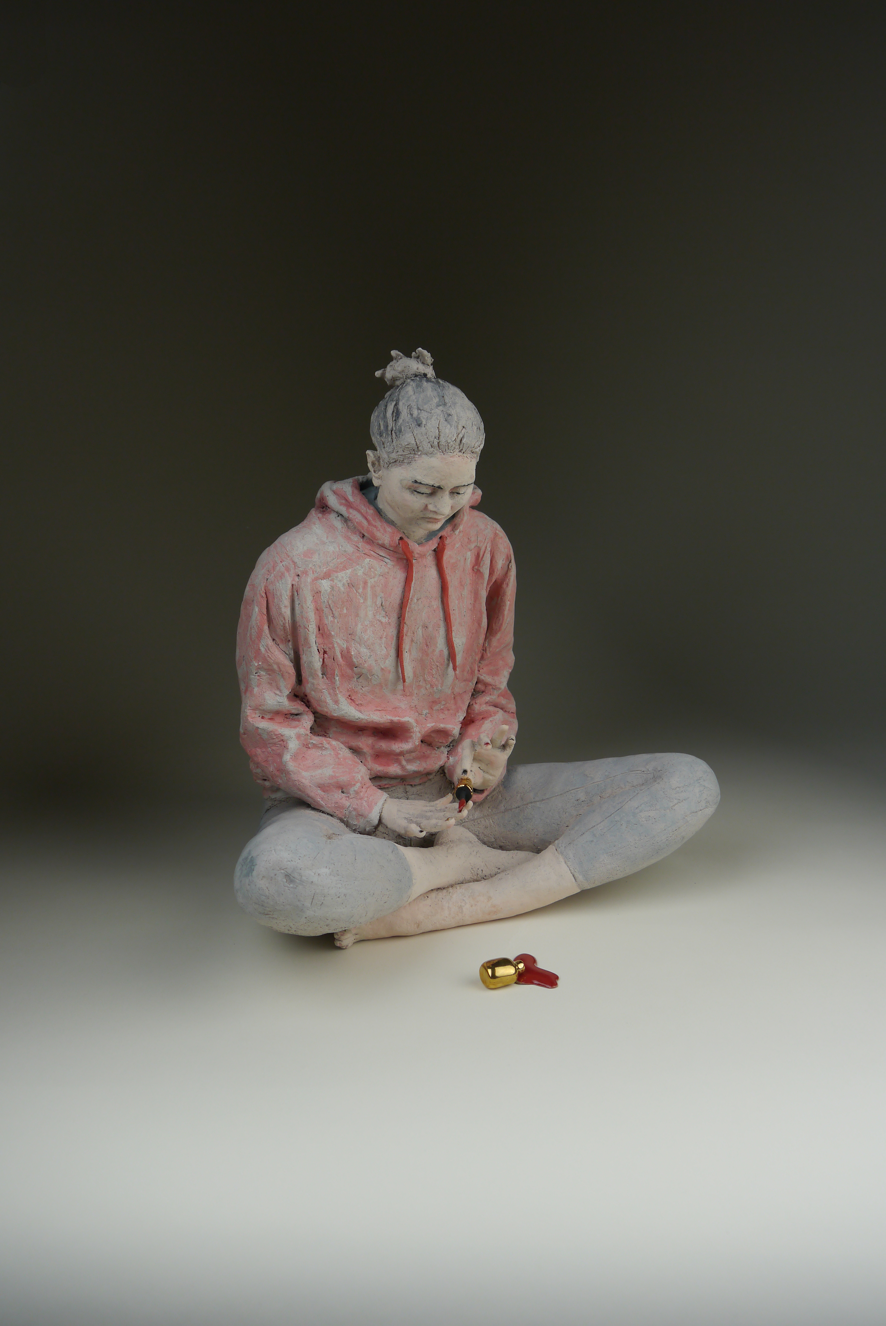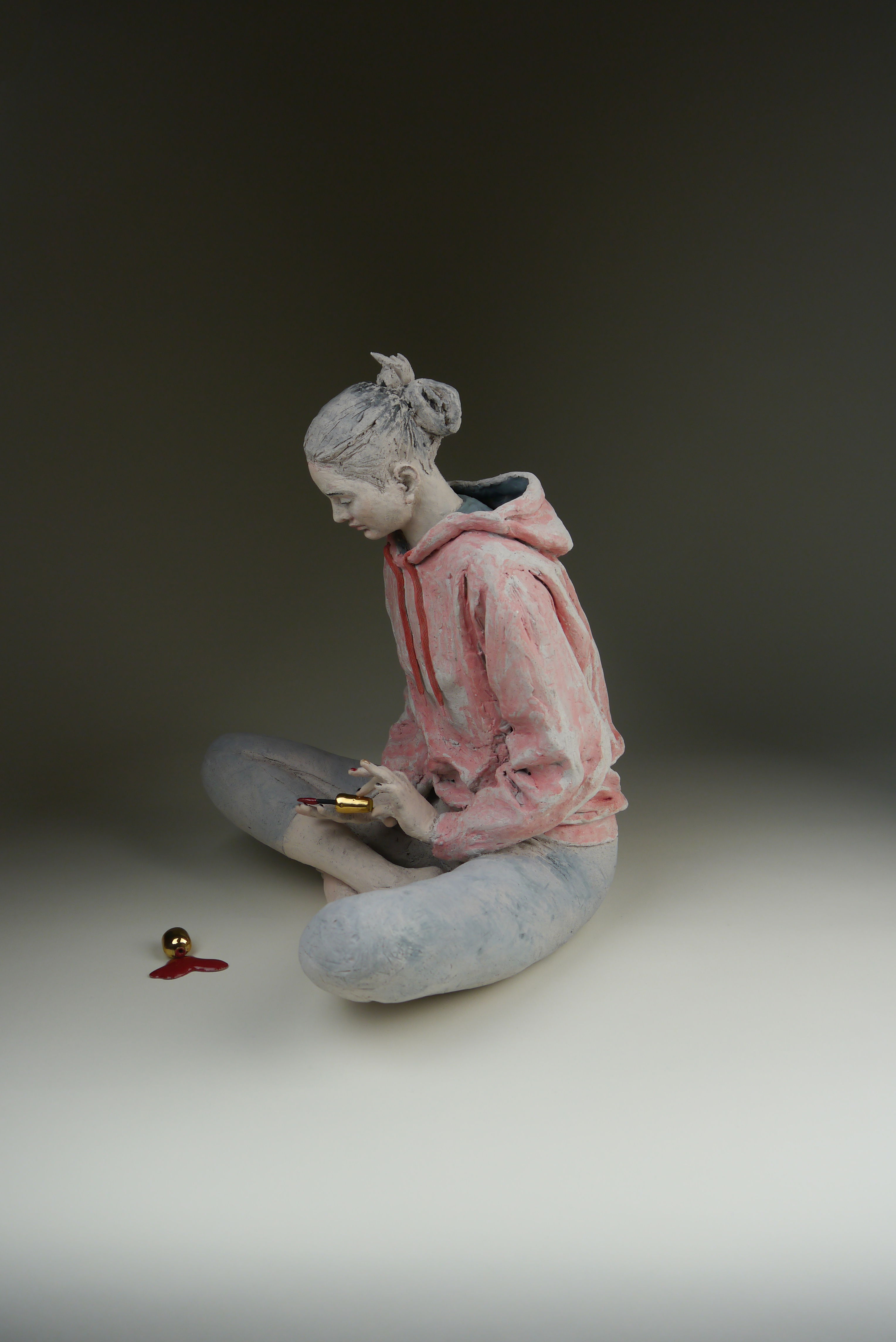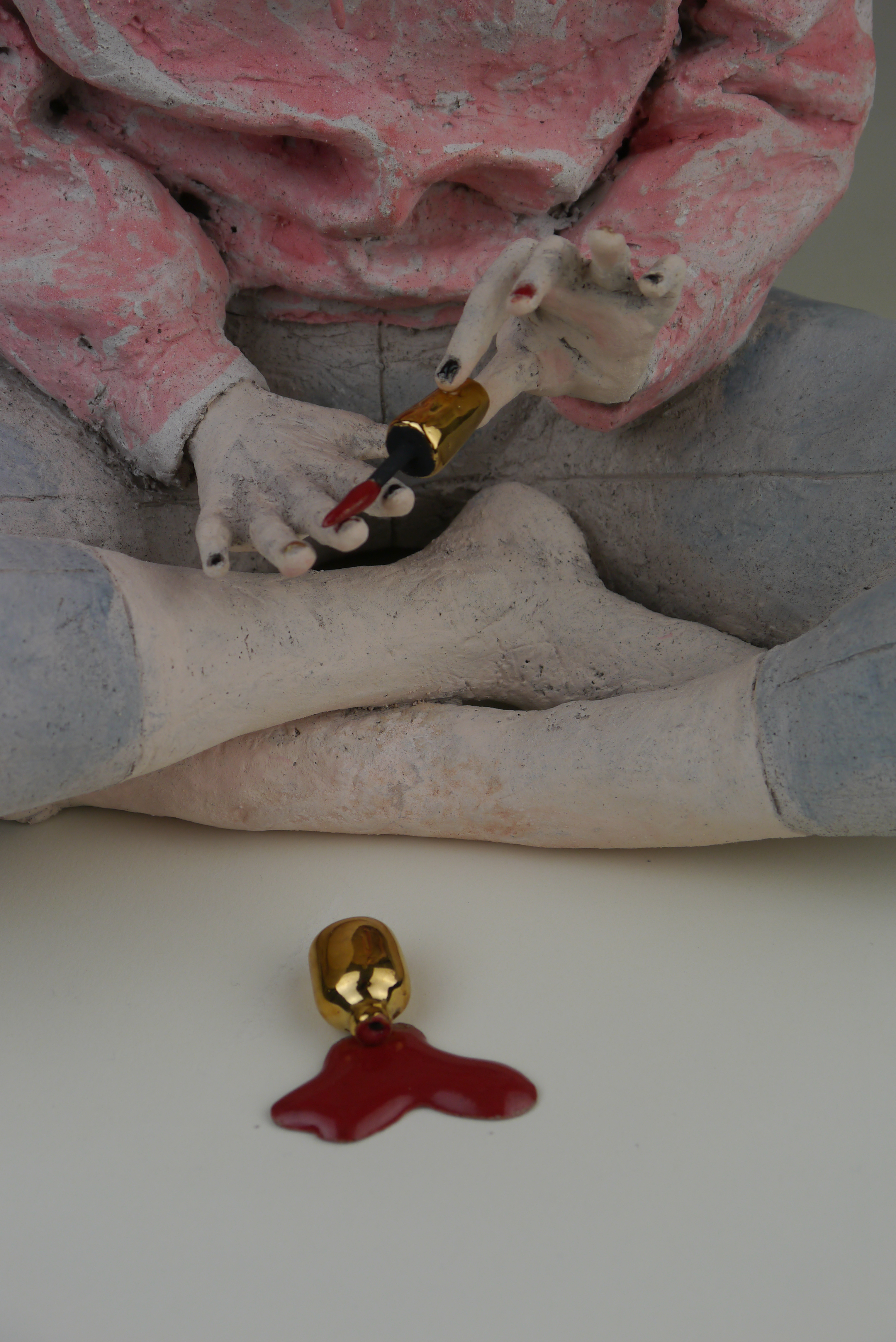 schwarzrotgold, 2017 Figur: 30 x 35 x 24 cm, Nagellackflasche: ca. 4 x 4 cm Steinzeug, Pigmente, Glasur, Glanzgold